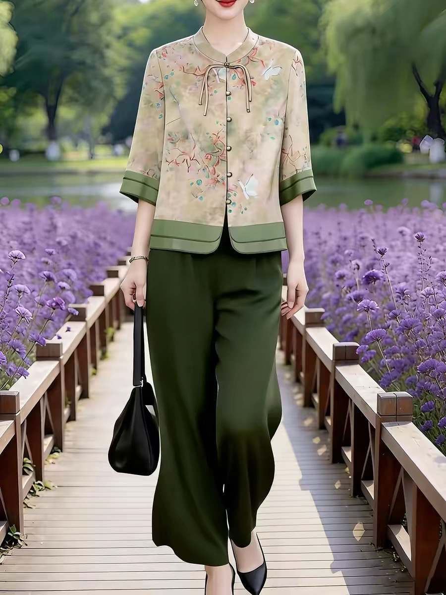 레트로 국풍 스탠드 칼라 단추 자수 맨위 가져 가라. 와이드 레그 팬츠 투피스 세트