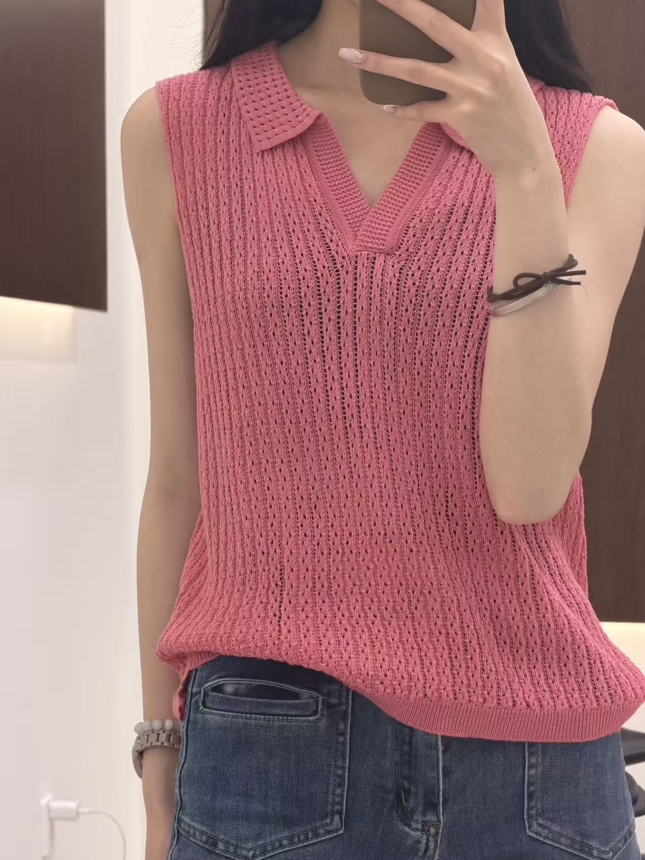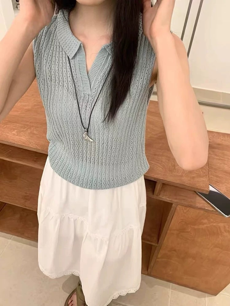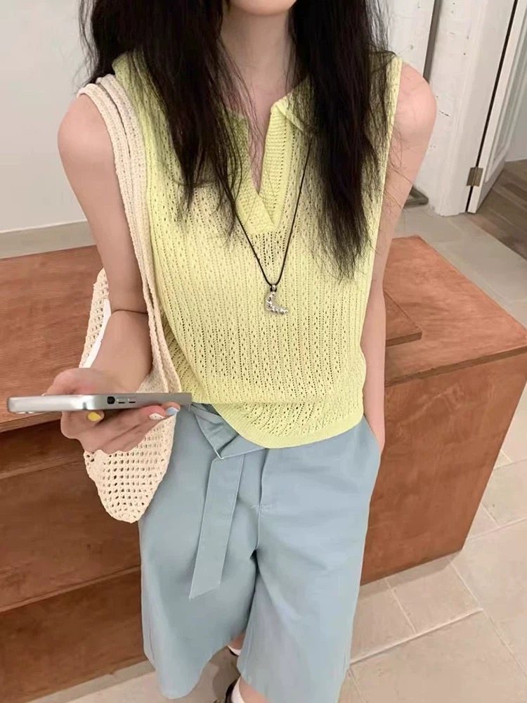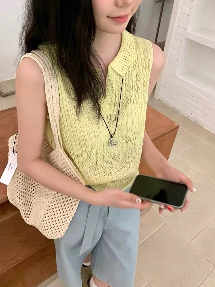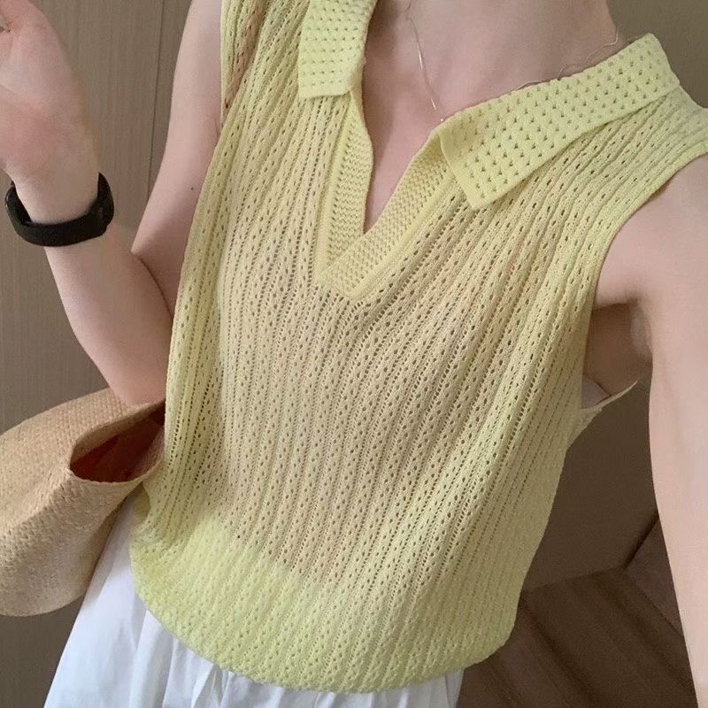 디자인 센스 작은 v 폴로 칼라 홀로우 아웃 아마 민소매 니트 스웨터 조끼 여성 여름 얇은 스타일 고급 센스 쇼트 스타일 맨위
