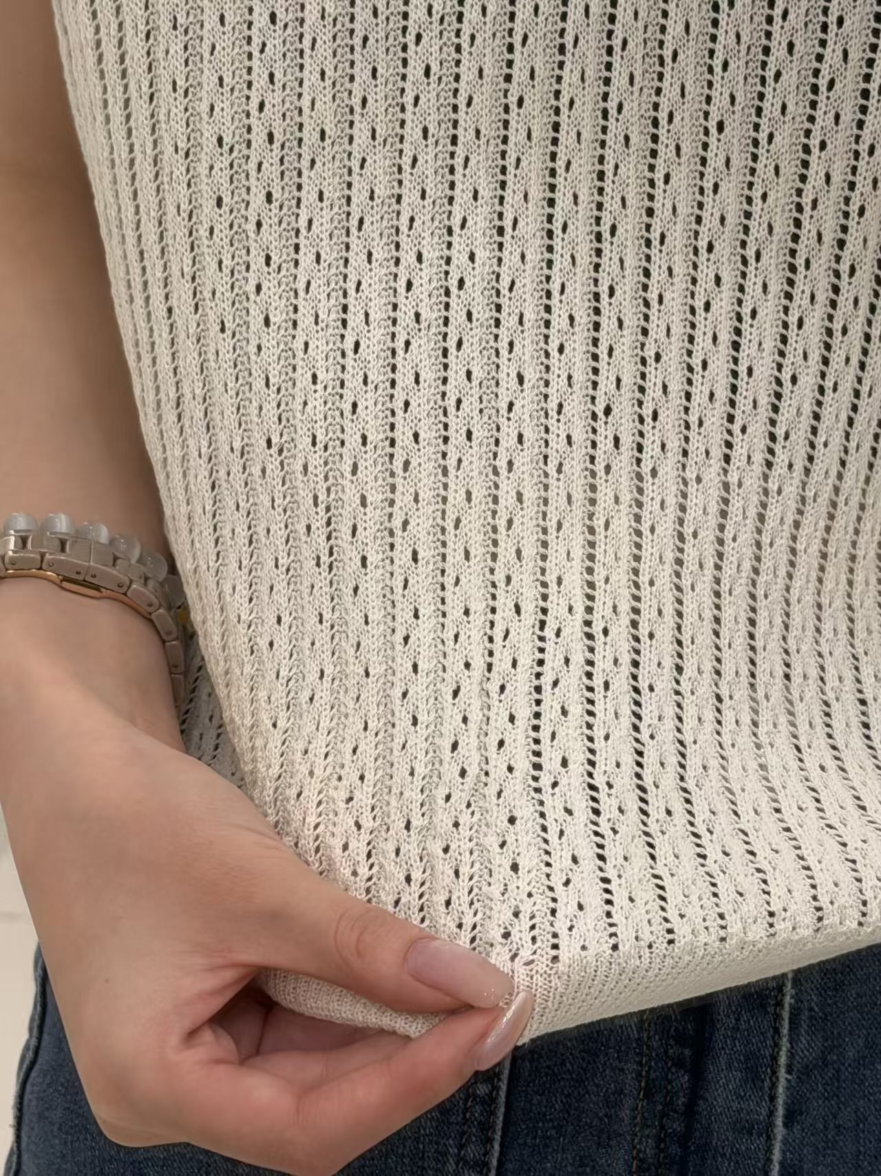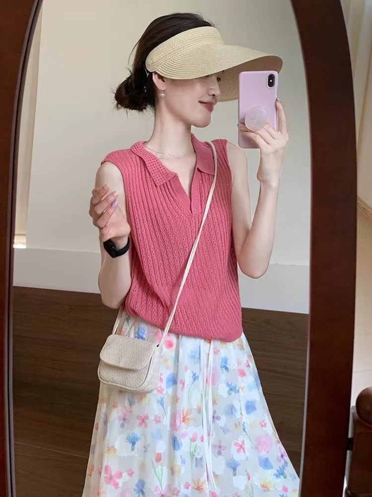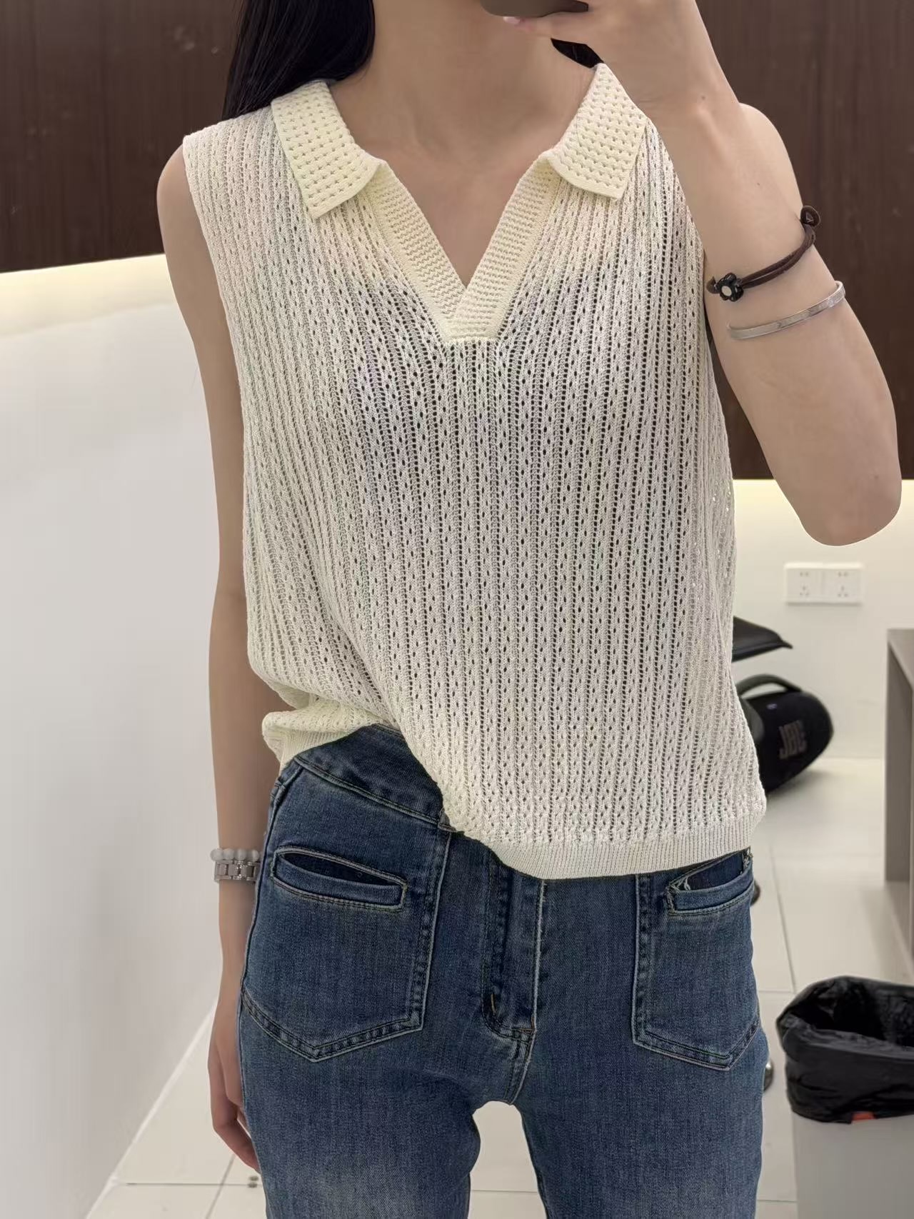 디자인 센스 작은 v 폴로 칼라 홀로우 아웃 아마 민소매 니트 스웨터 조끼 여성 여름 얇은 스타일 고급 센스 쇼트 스타일 맨위