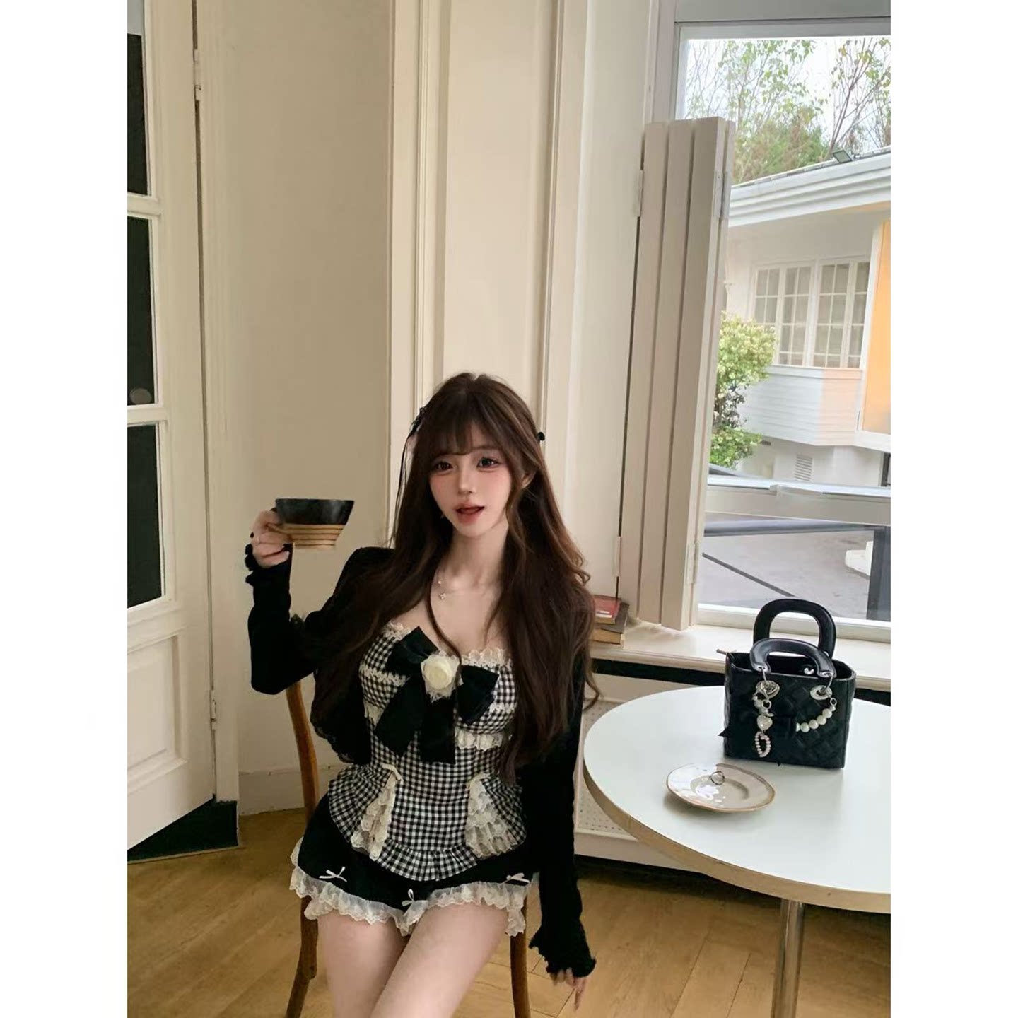 joykiki 튜브탑 맨위 여성 순수한 욕망 바람 코르셋 퍼프 미니 스커트 하이웨이스트 슬림해 보이는 디자인 반신 치마 세트