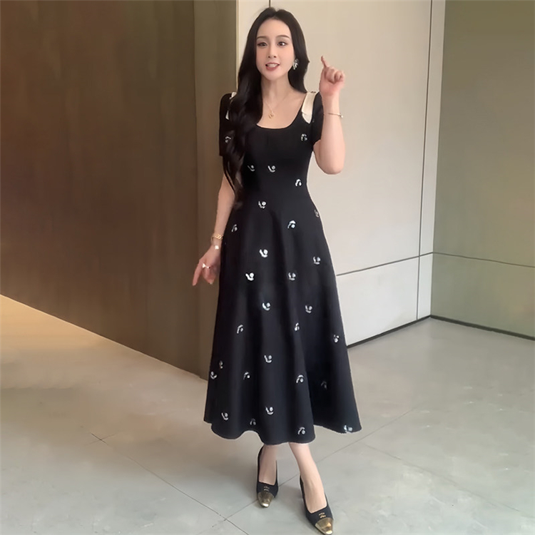 빅 사이즈 여성 의류 지방 mm 그는 벤 바람 다이아몬드 세팅 비즈 박기 라운드 넥 반팔 드레스 2026 여름 품격 슬림해 보이는 치마