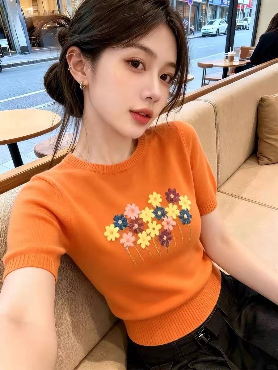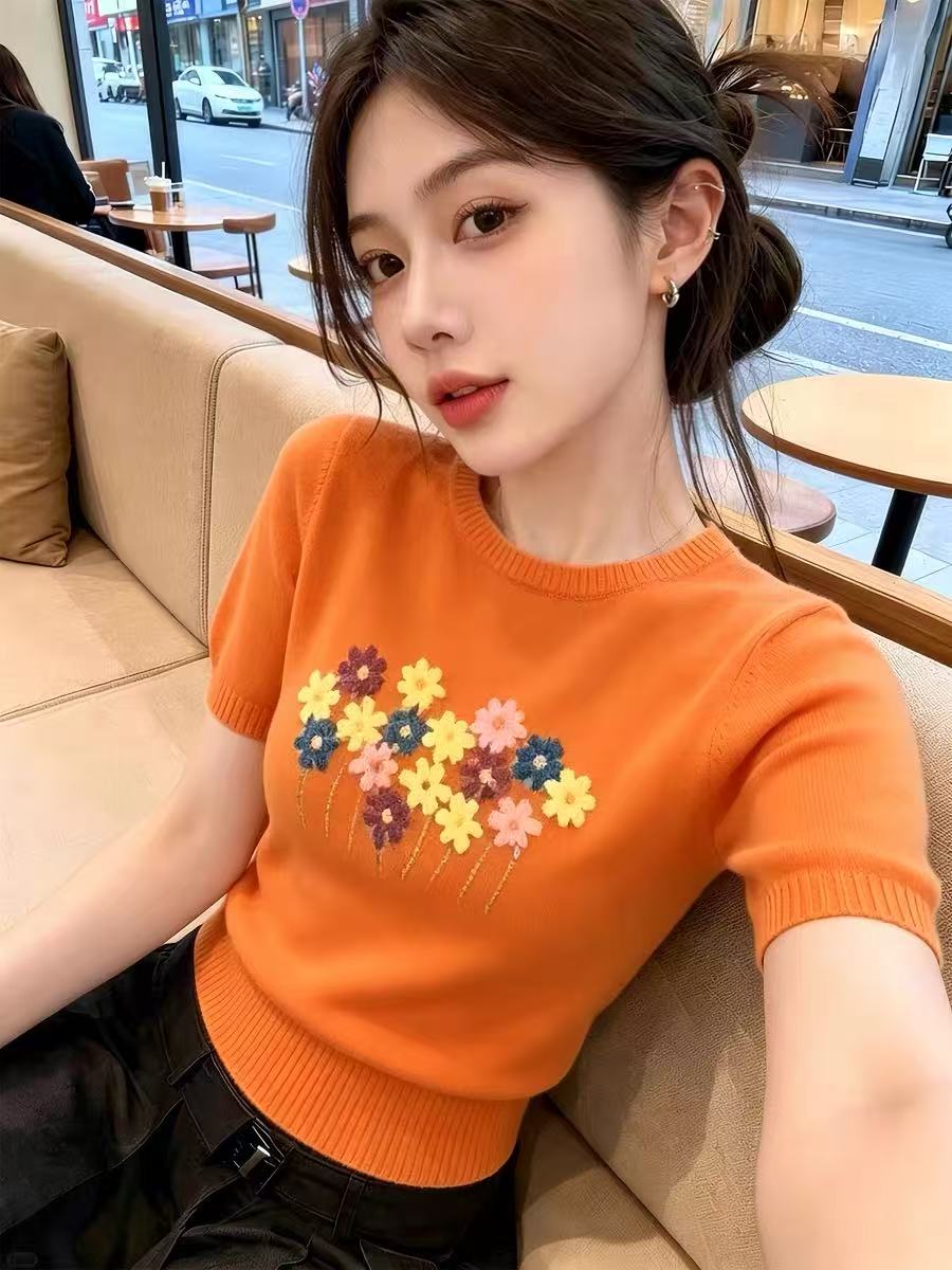 여름 새로운 작은 대중 디자인 센스 세련된 슈퍼 잘 생긴 느긋한 패션 품격 슬림해 보이는 V넥 반팔 니트 티셔츠 여성