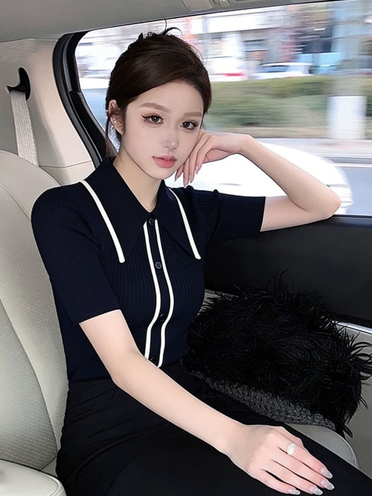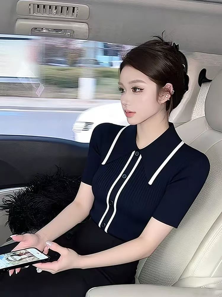 검정색 폴로 칼라 니트 반팔 맨위 여성 2026 여름 새로운 품격 고급 센스 몸매 가꾸기 슬림해 보이는 다용도 티셔츠