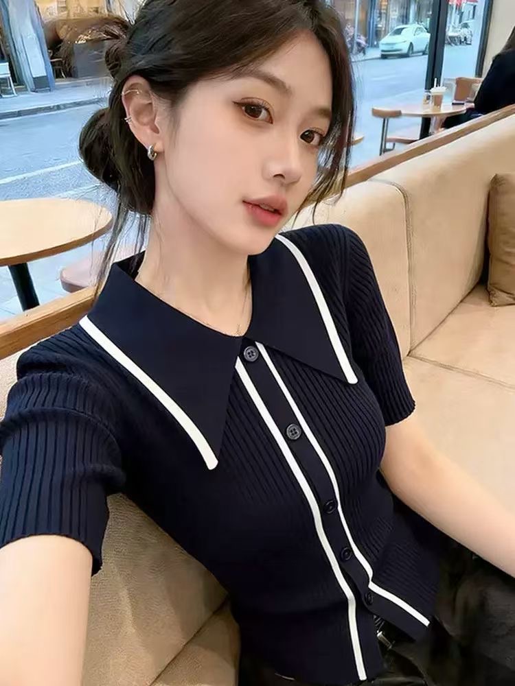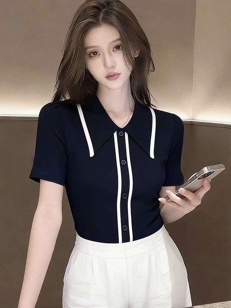 파란색 말뚝 더미 칼라 반팔 티셔츠 여성 초여름 디자인 센스 고유 한 아름다운 자이언트 잘 생긴 ~ 중 니트 얼음 실크 작은 맨위