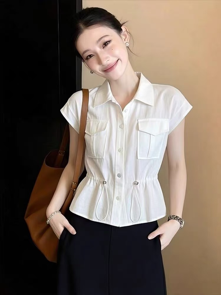 화이트 프릴 거품 소매 여성 셔츠 여름 새로운 부드러운 바람 외국 가스 허리 수축 슬림해 보이는 다용도 반팔 맨위