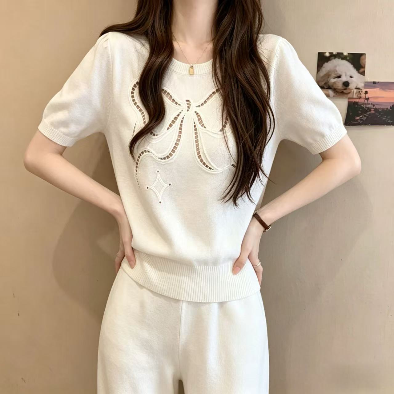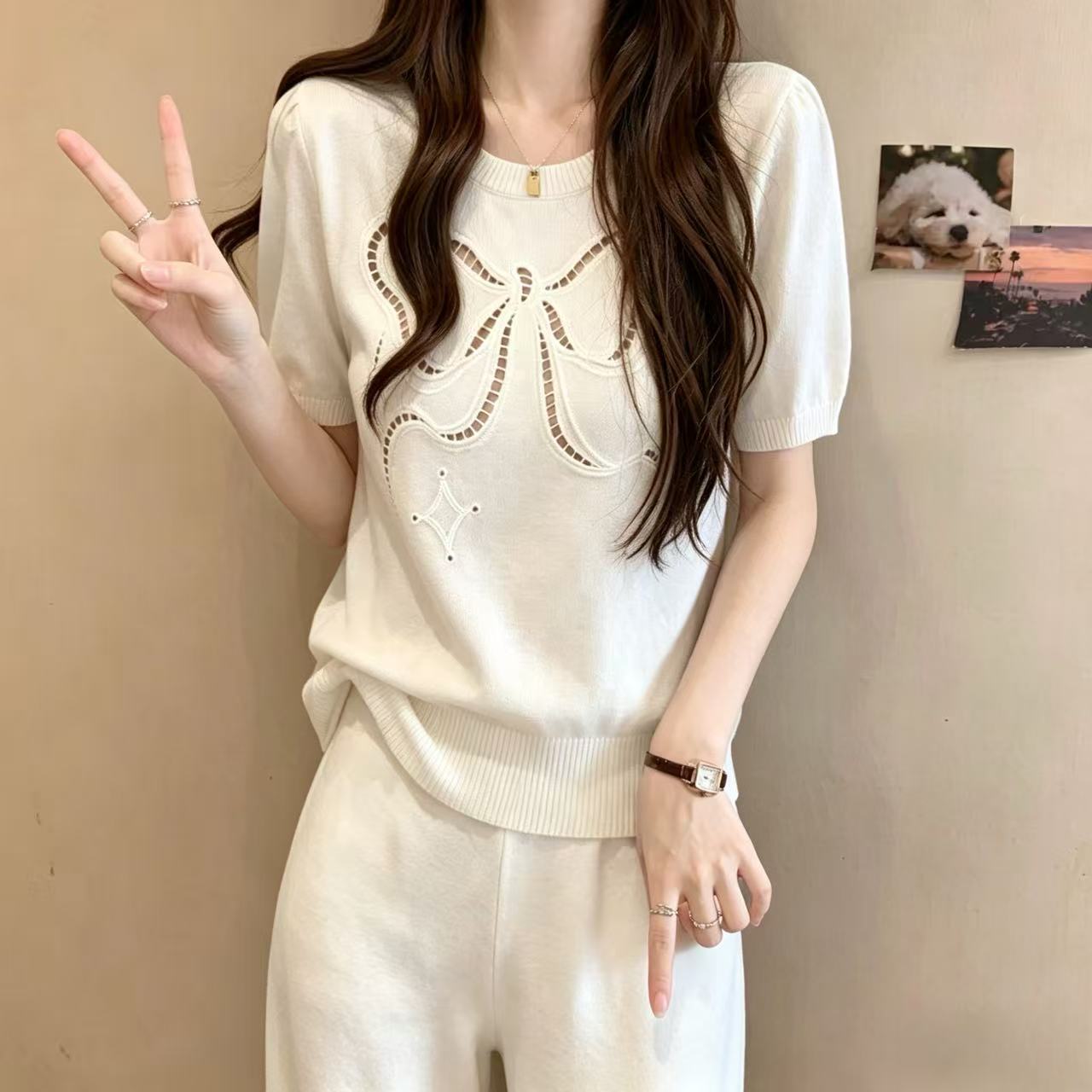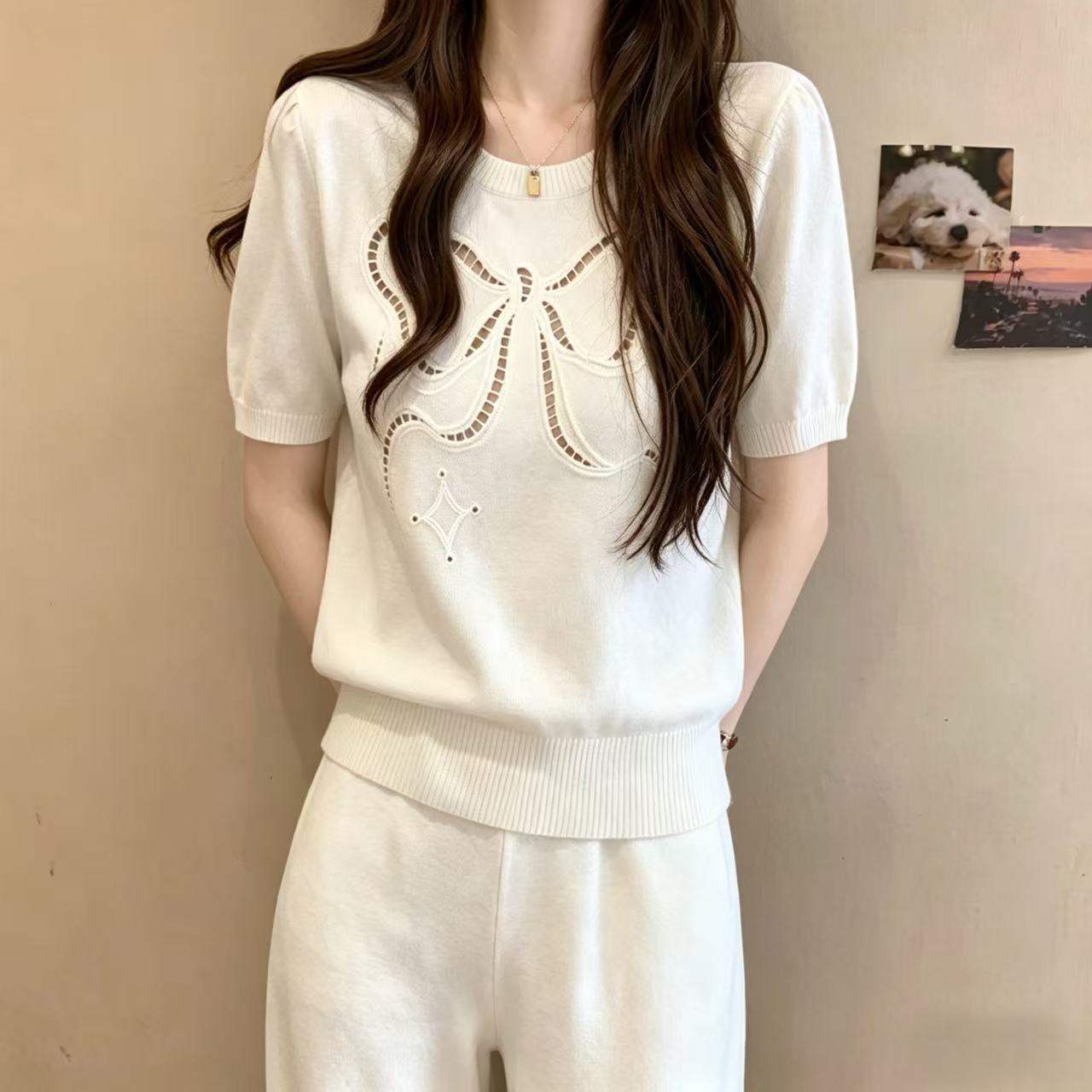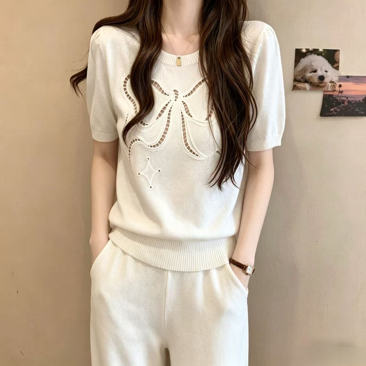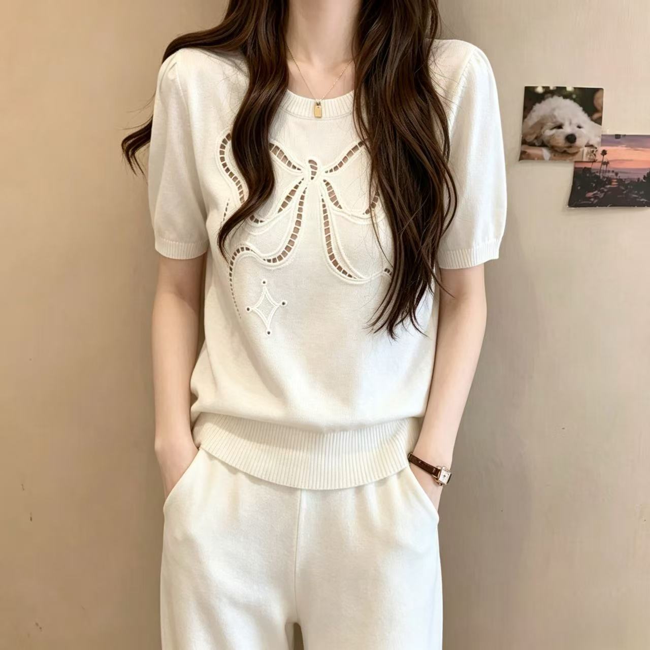 작은 샤넬 스타일 나비 매듭 V넥 니트 스웨터 여성 연령 감소 외국 가스 여름 새로운 반팔 몸매 가꾸기 슬림해 보이는 다용도 맨위