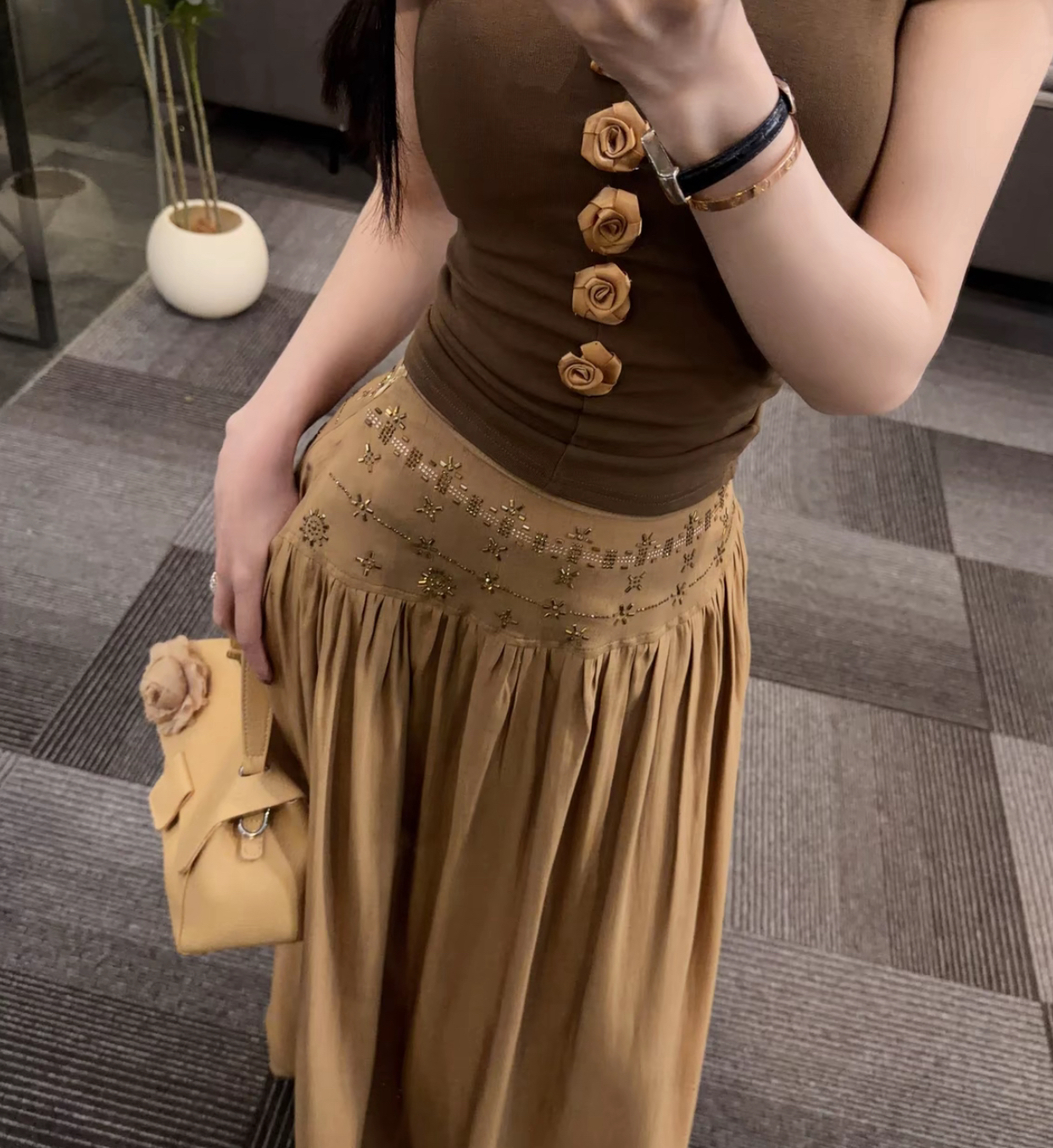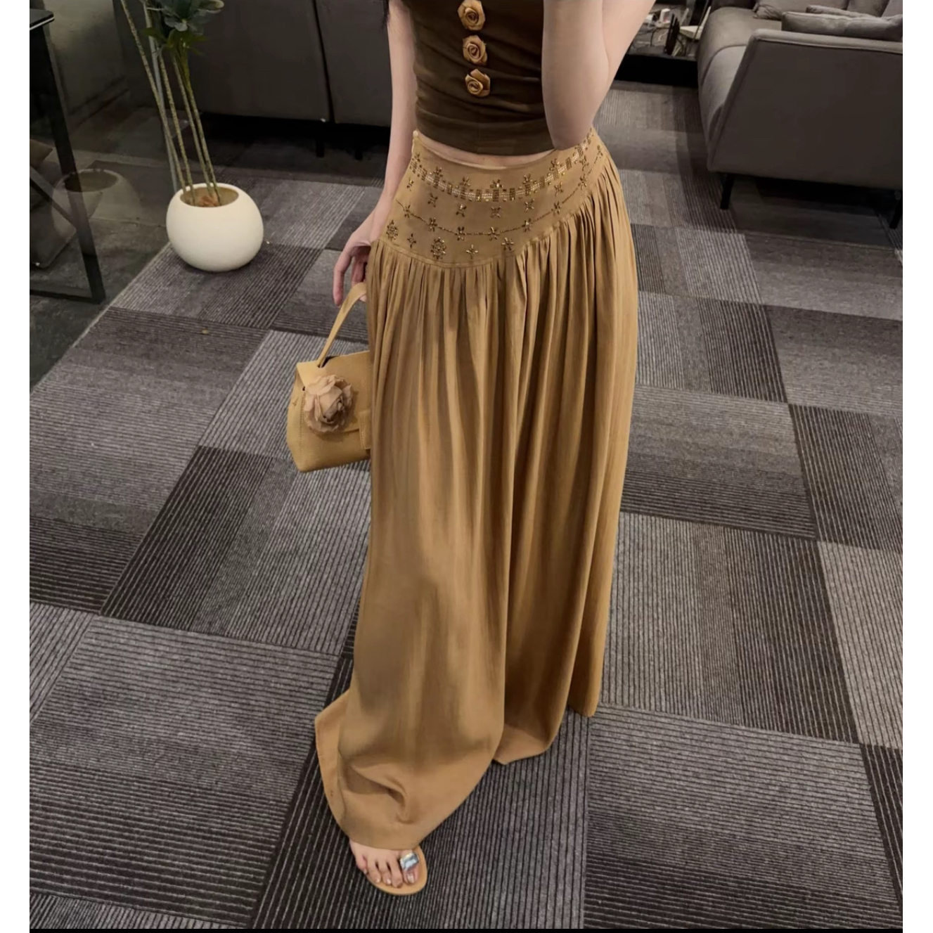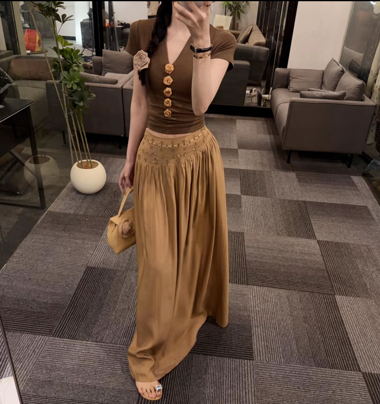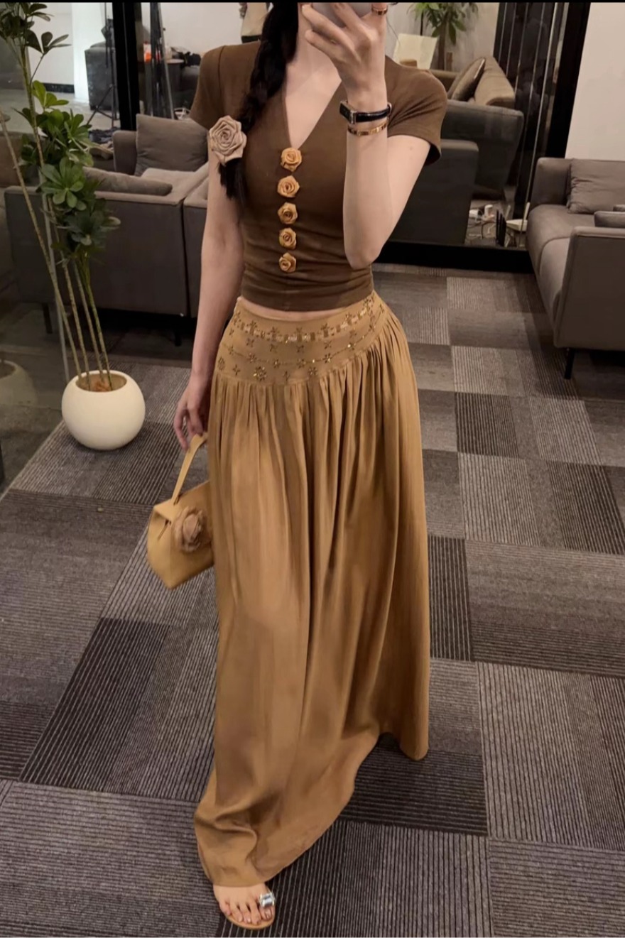 무거운 작업 핫픽스 반신 스커트 휴가 바람 새로운 V넥 맨위 치마 레트로 롱 스커트 세트