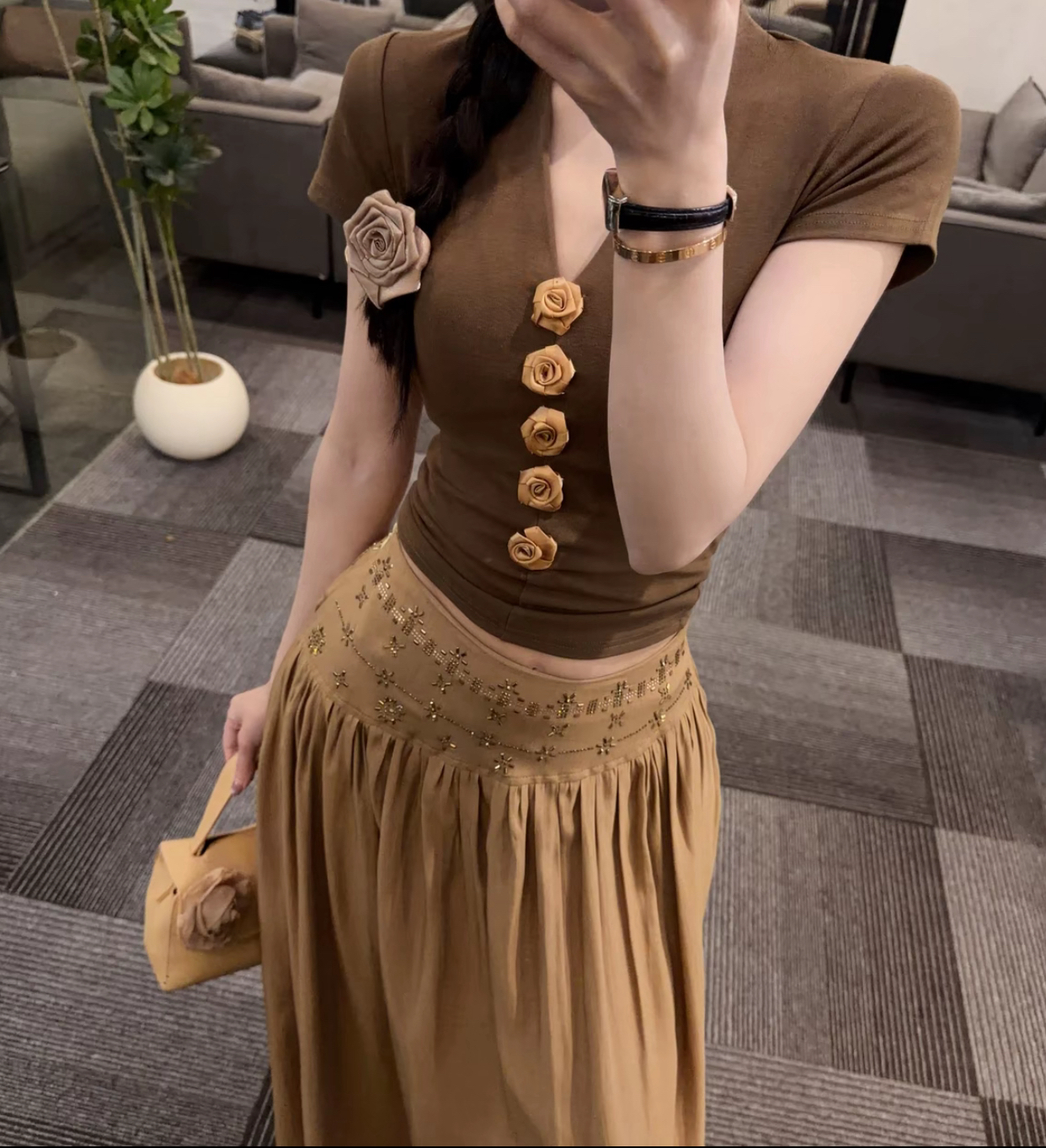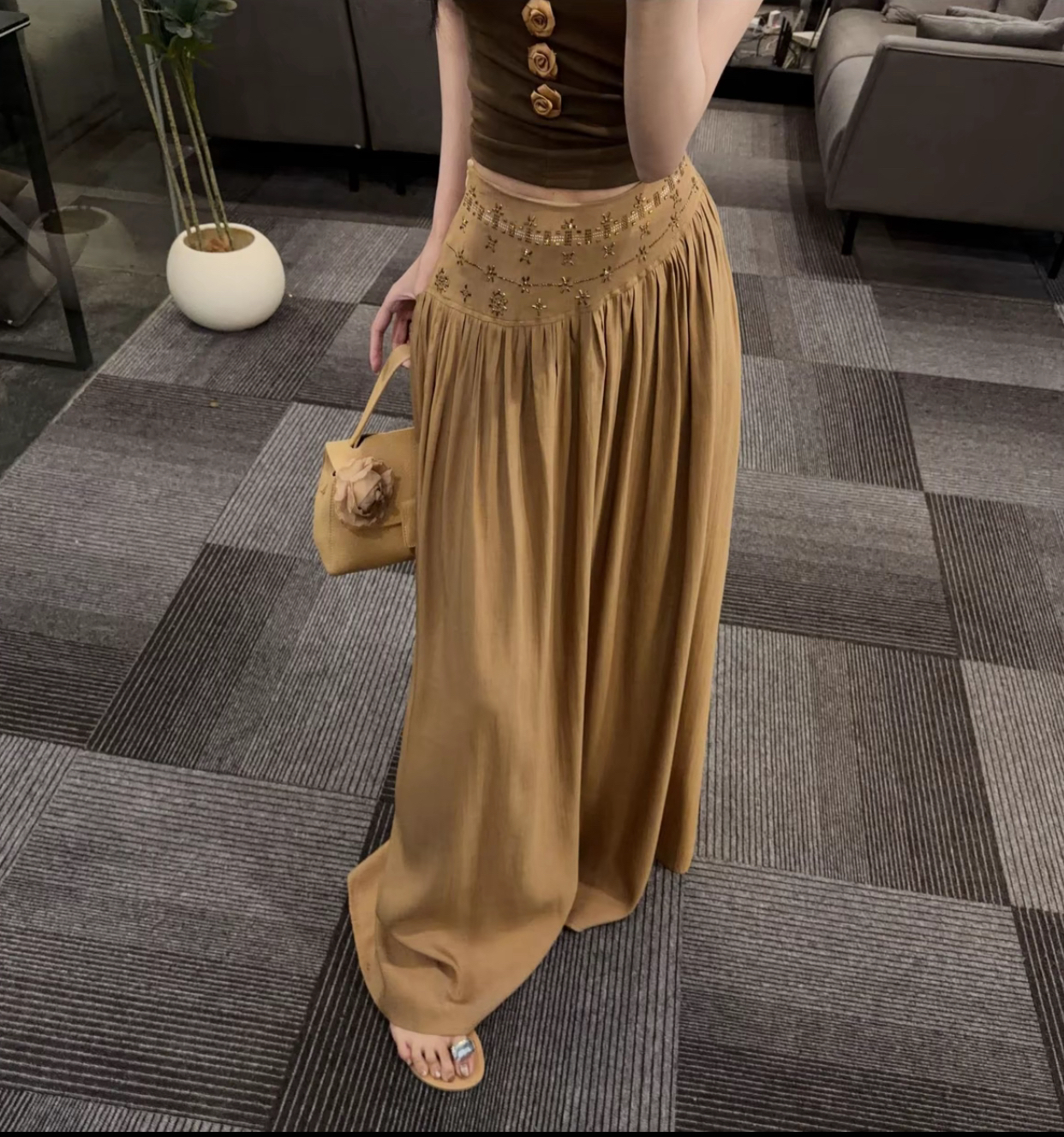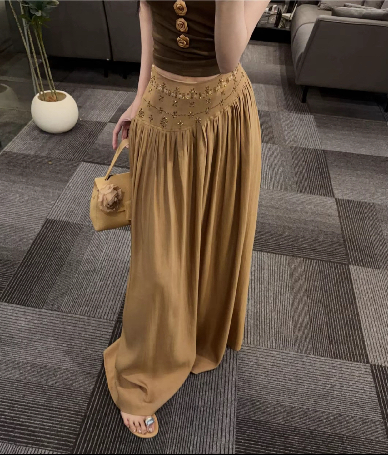 무거운 작업 핫픽스 반신 스커트 휴가 바람 새로운 V넥 맨위 치마 레트로 롱 스커트 세트