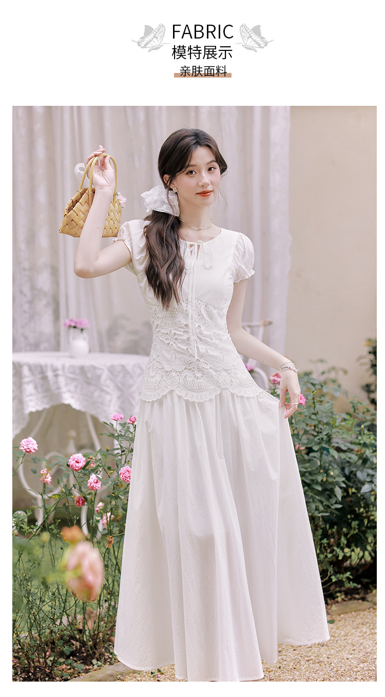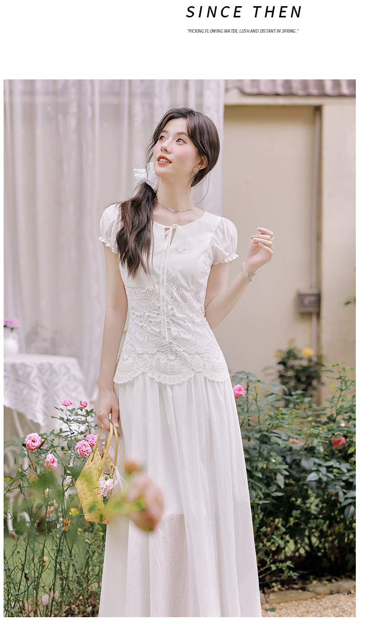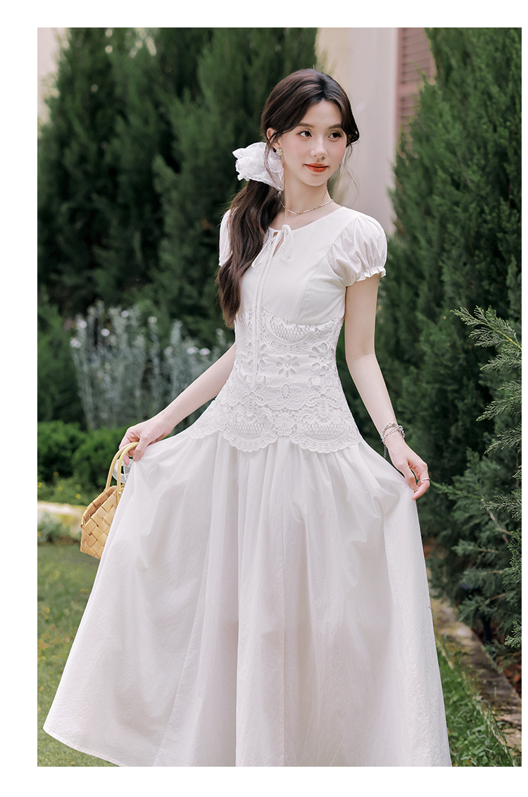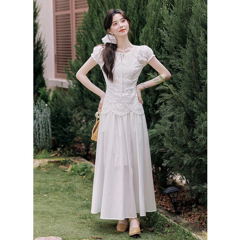 2026 여름 새로운 화이트 여성 드레스 V넥 거품 소매 허리 수축 슬림해 보이는 페이크 레이어드 품격 길다 치마