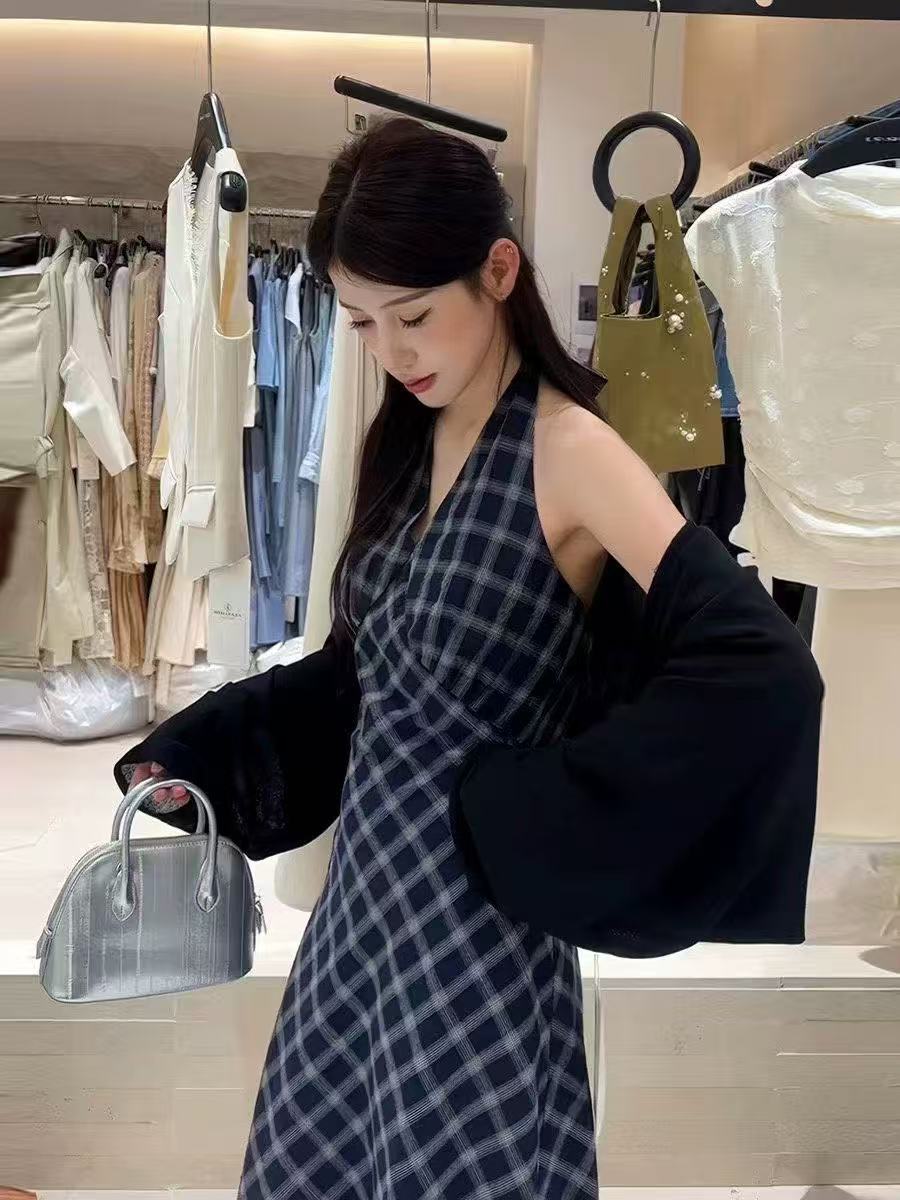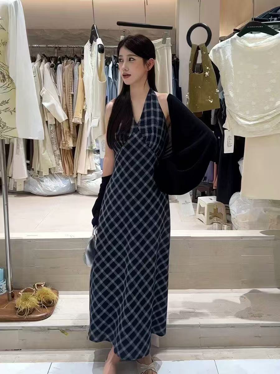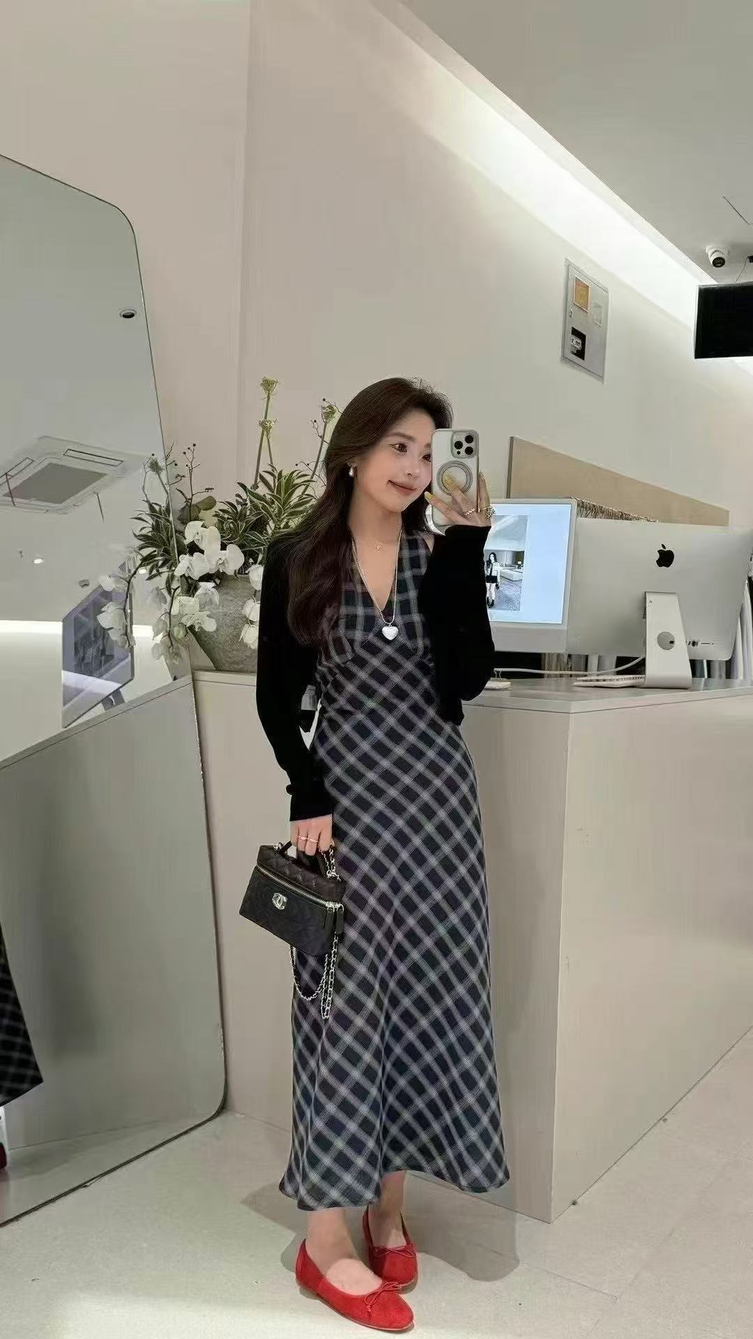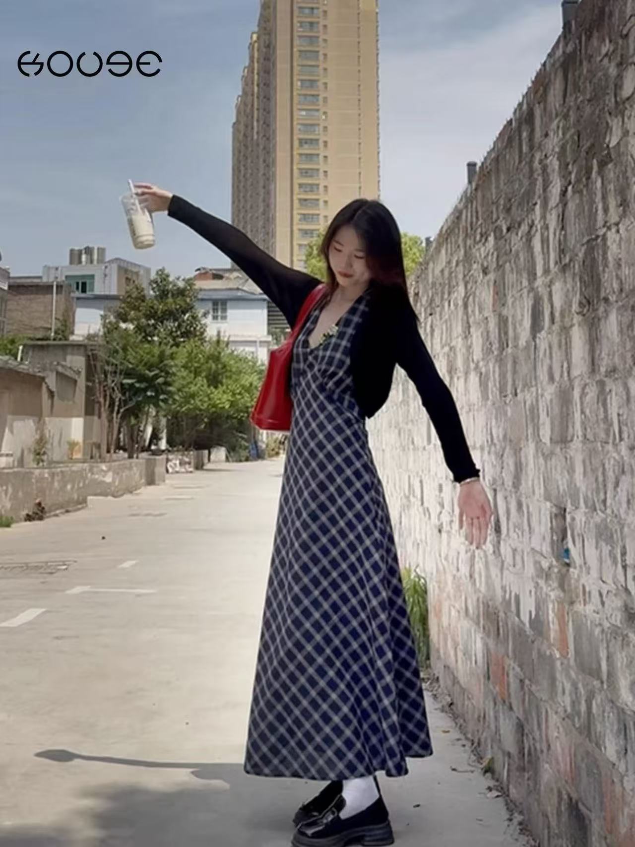 새로운 한 부서 패션 부드러운 바람 오픈 가디건 레이스 슬립 하이웨이스트 체크무늬 반신 스커트 3 세트