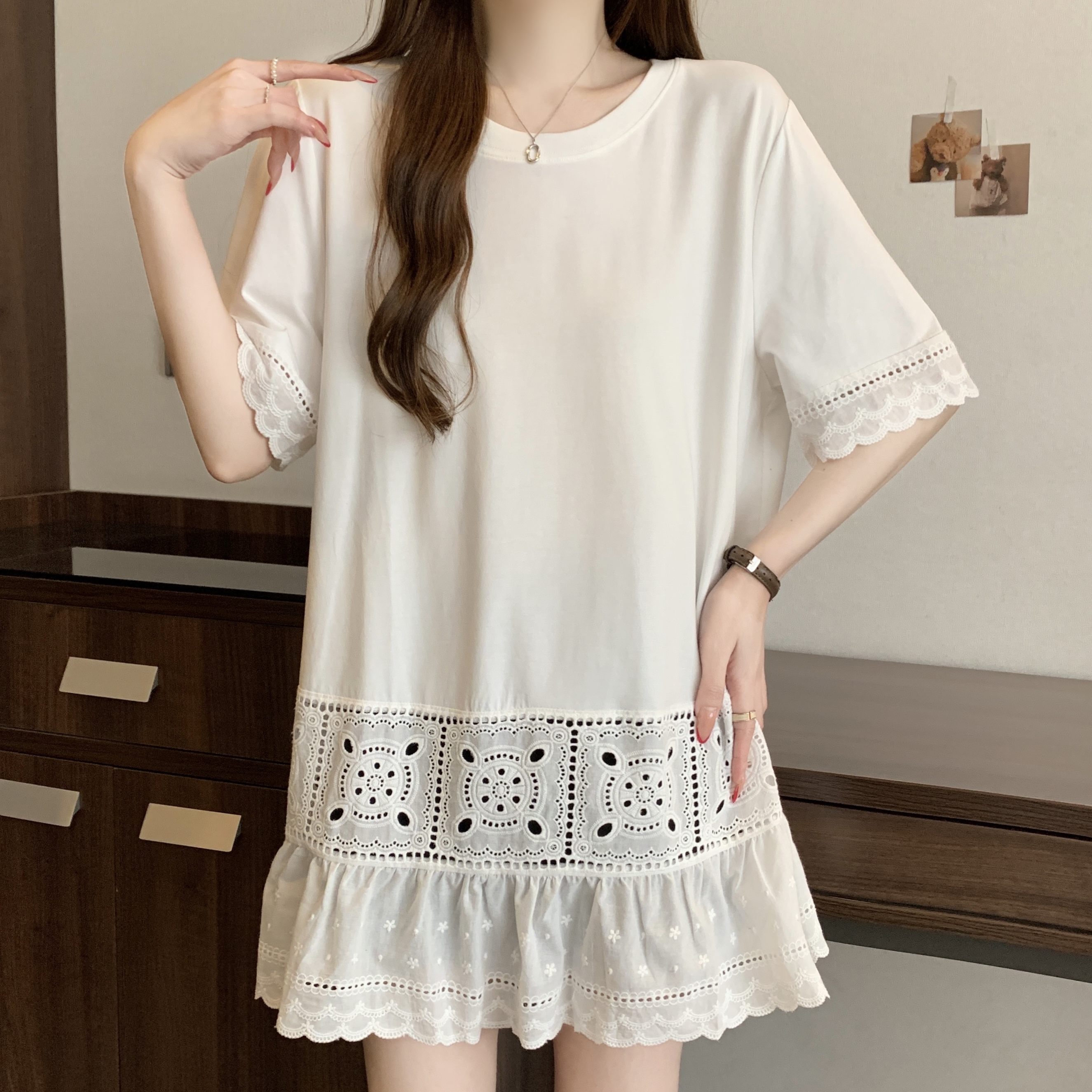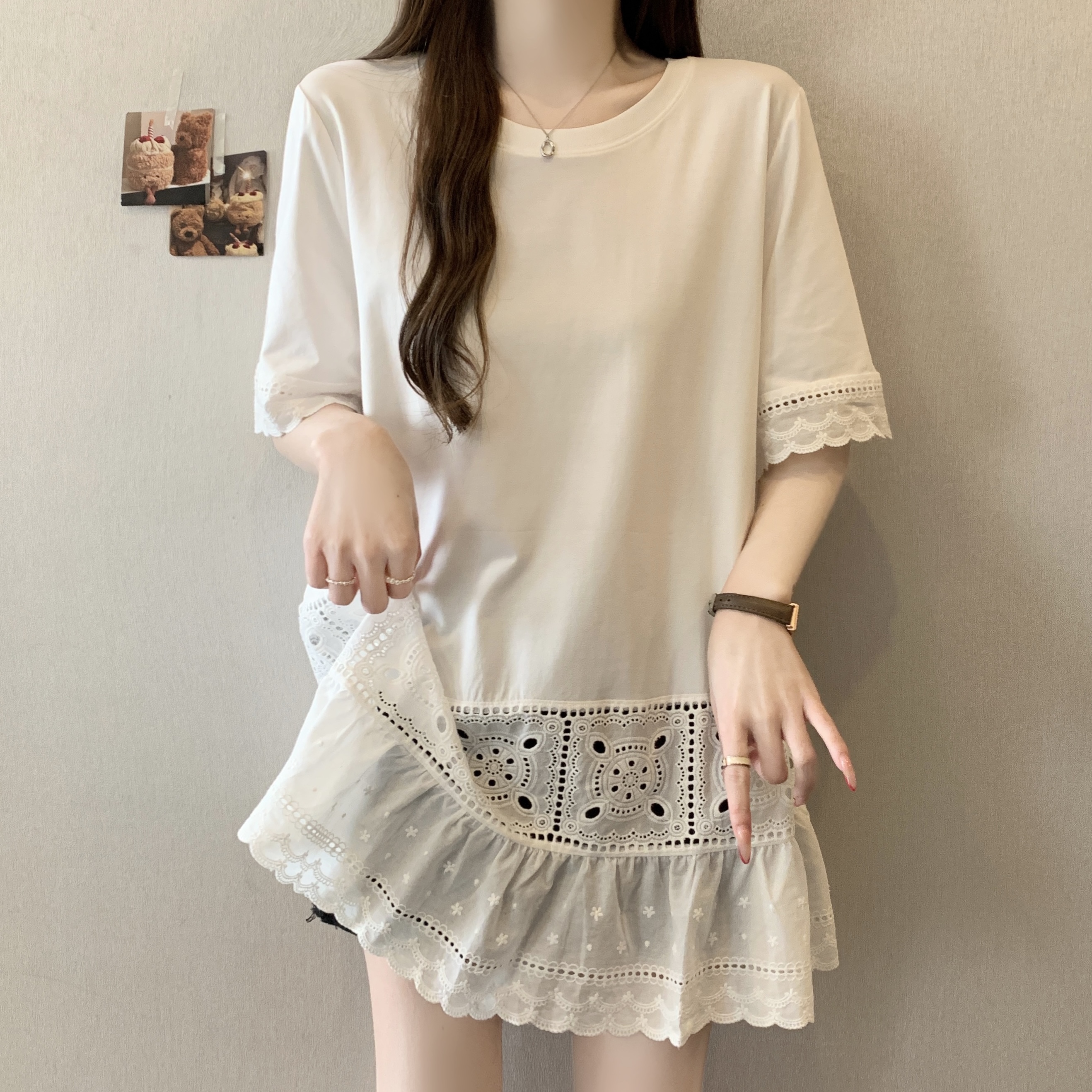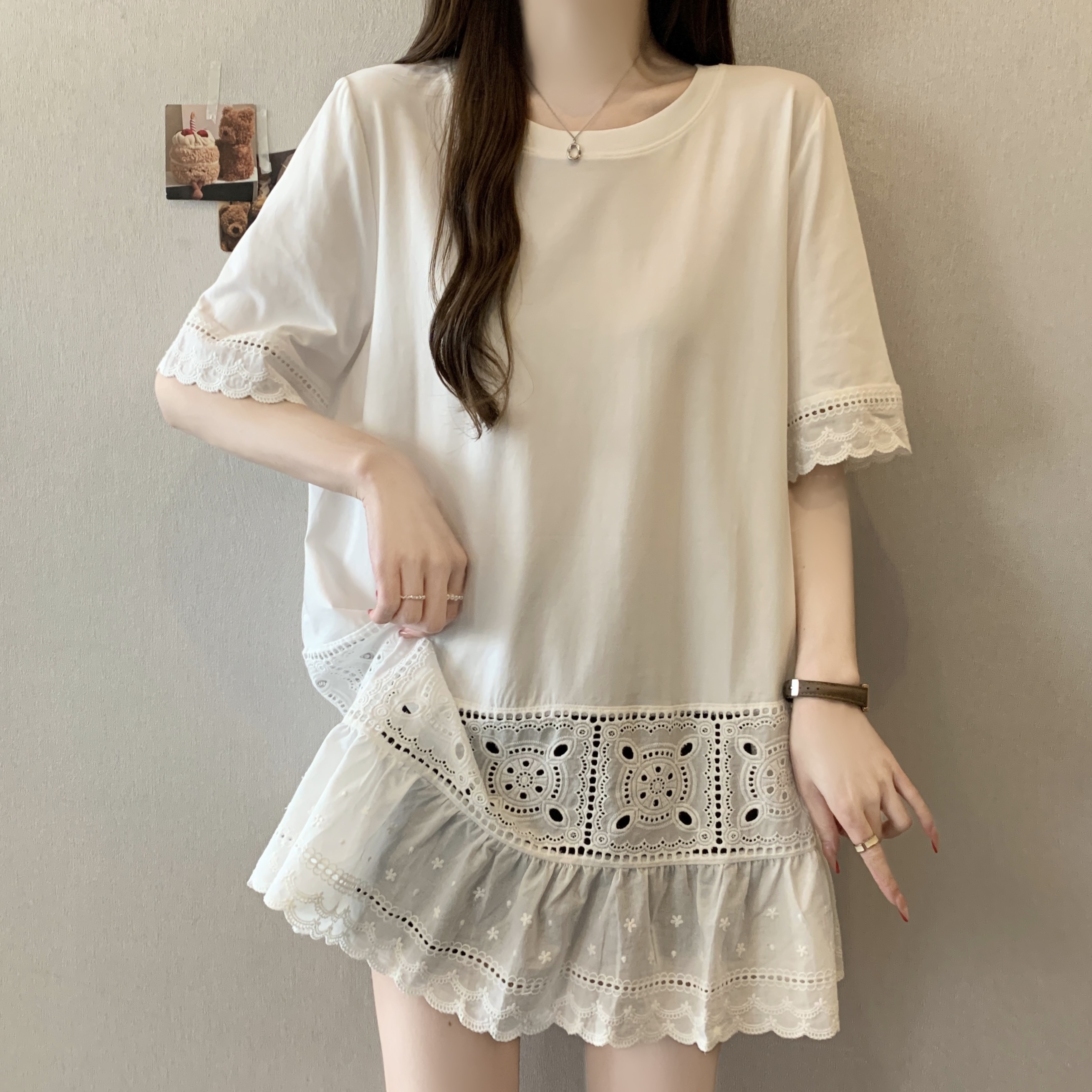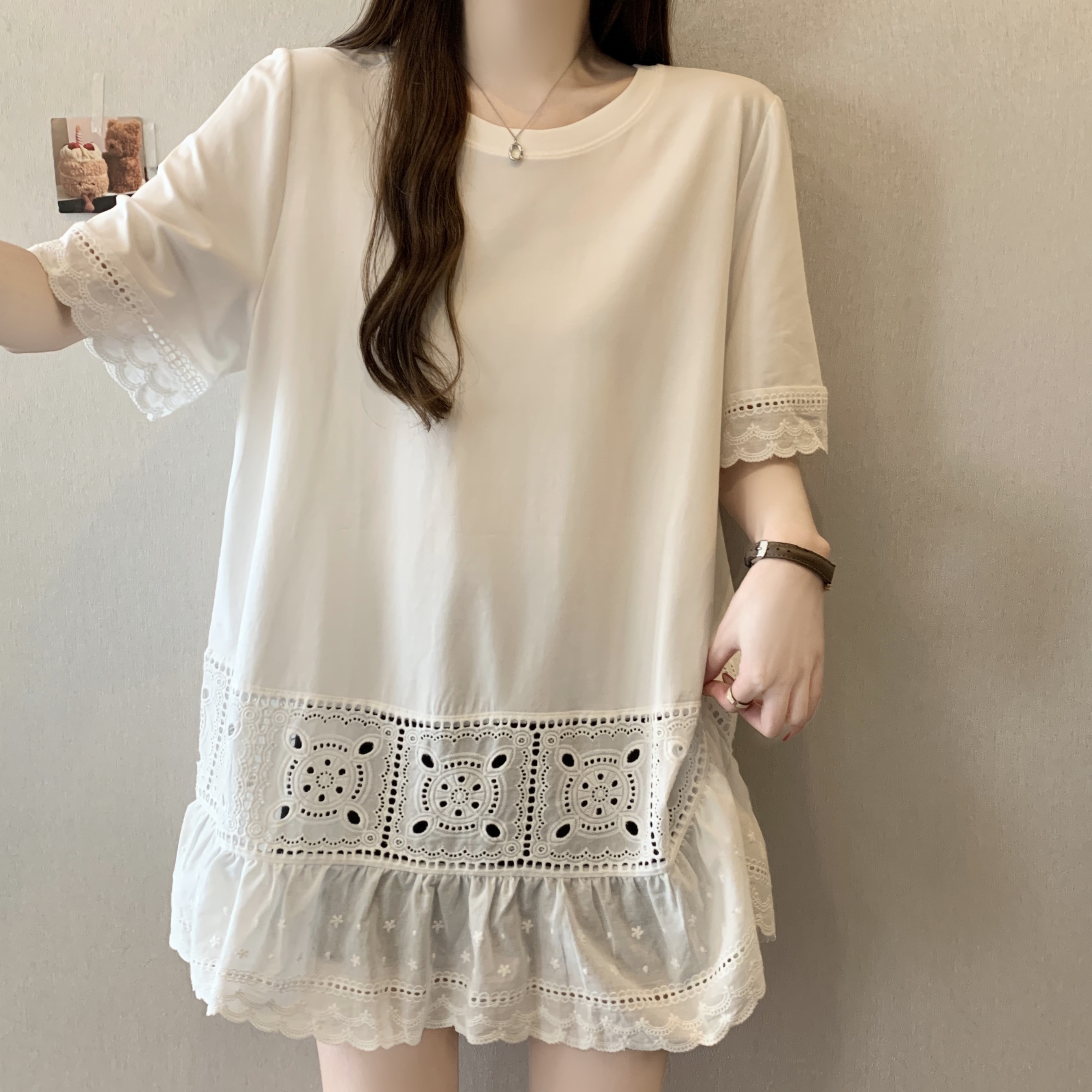 빅 사이즈 지방 mm 여름 새로운 디자인 센스 불규칙 레이스 조각 반팔 티셔츠 여성 루즈핏 맨위