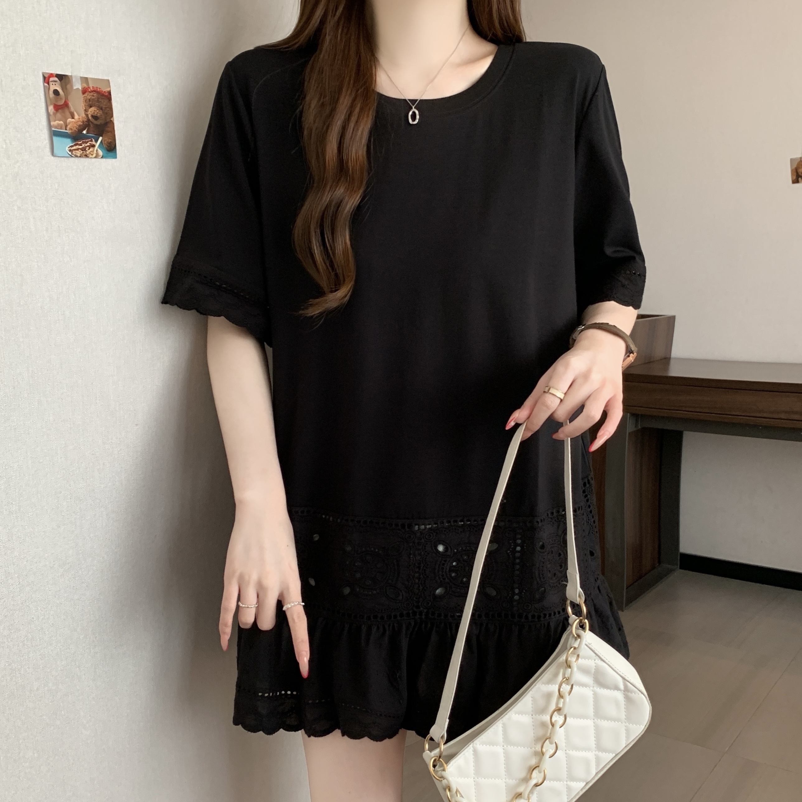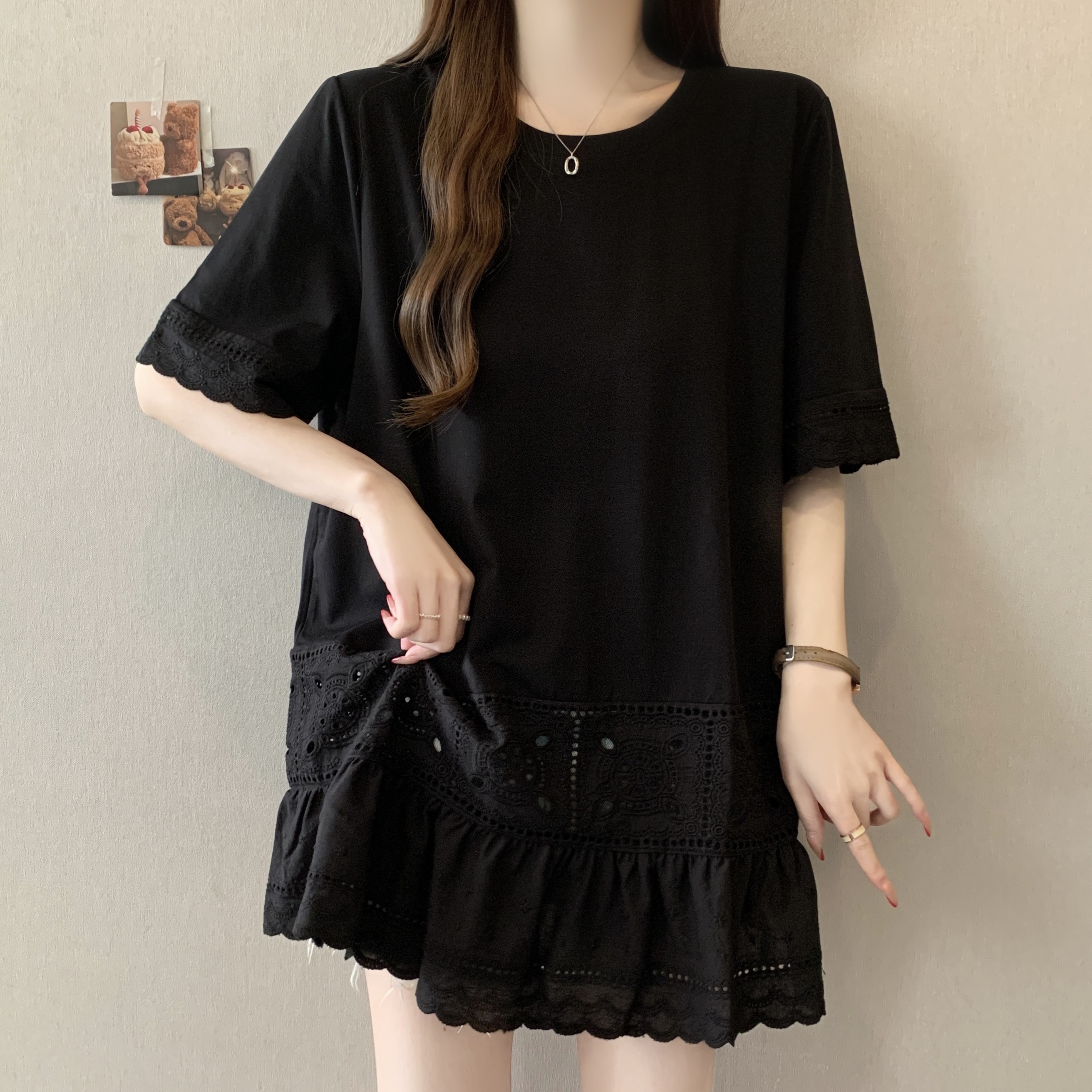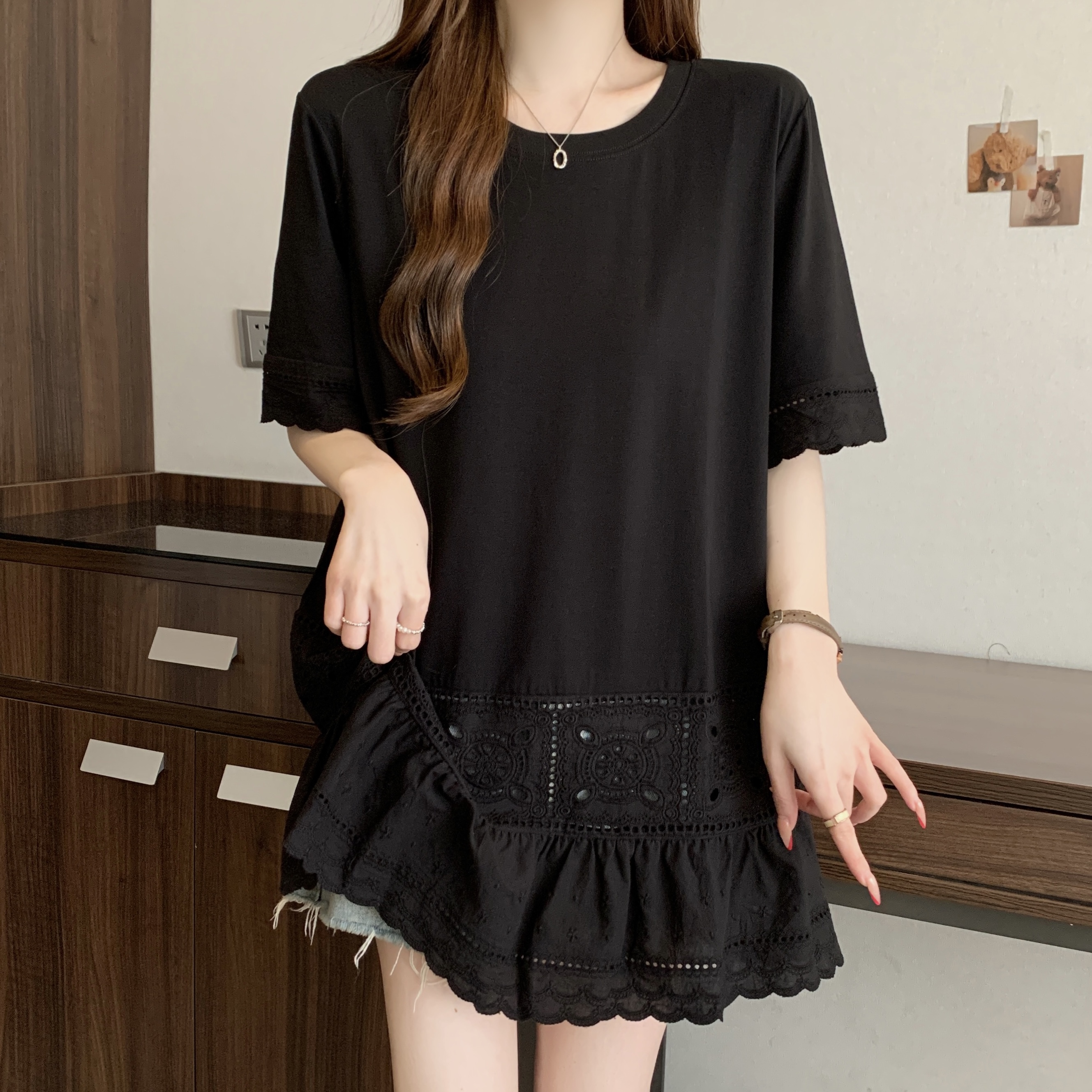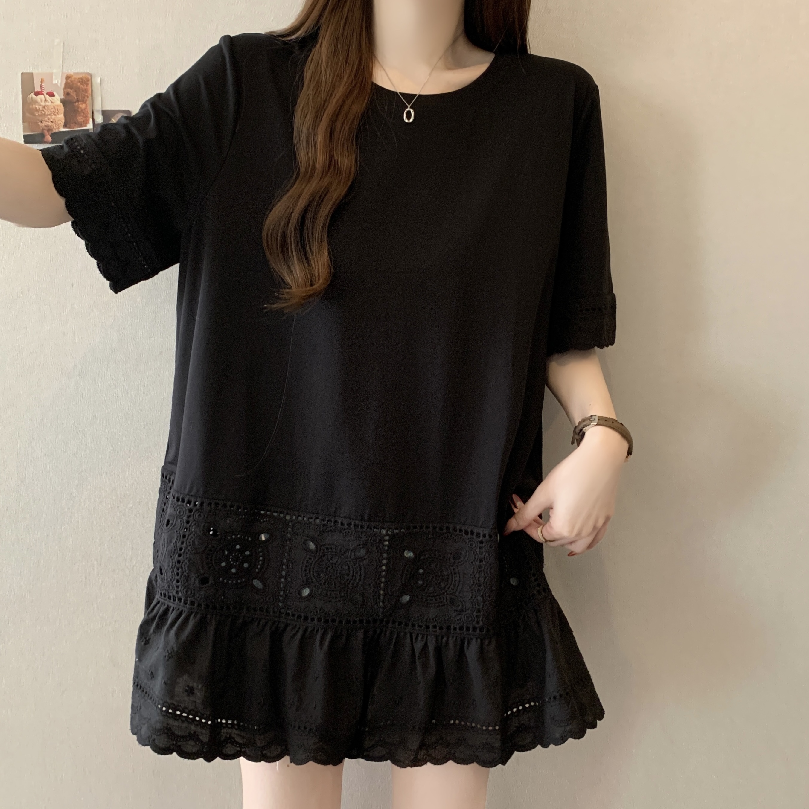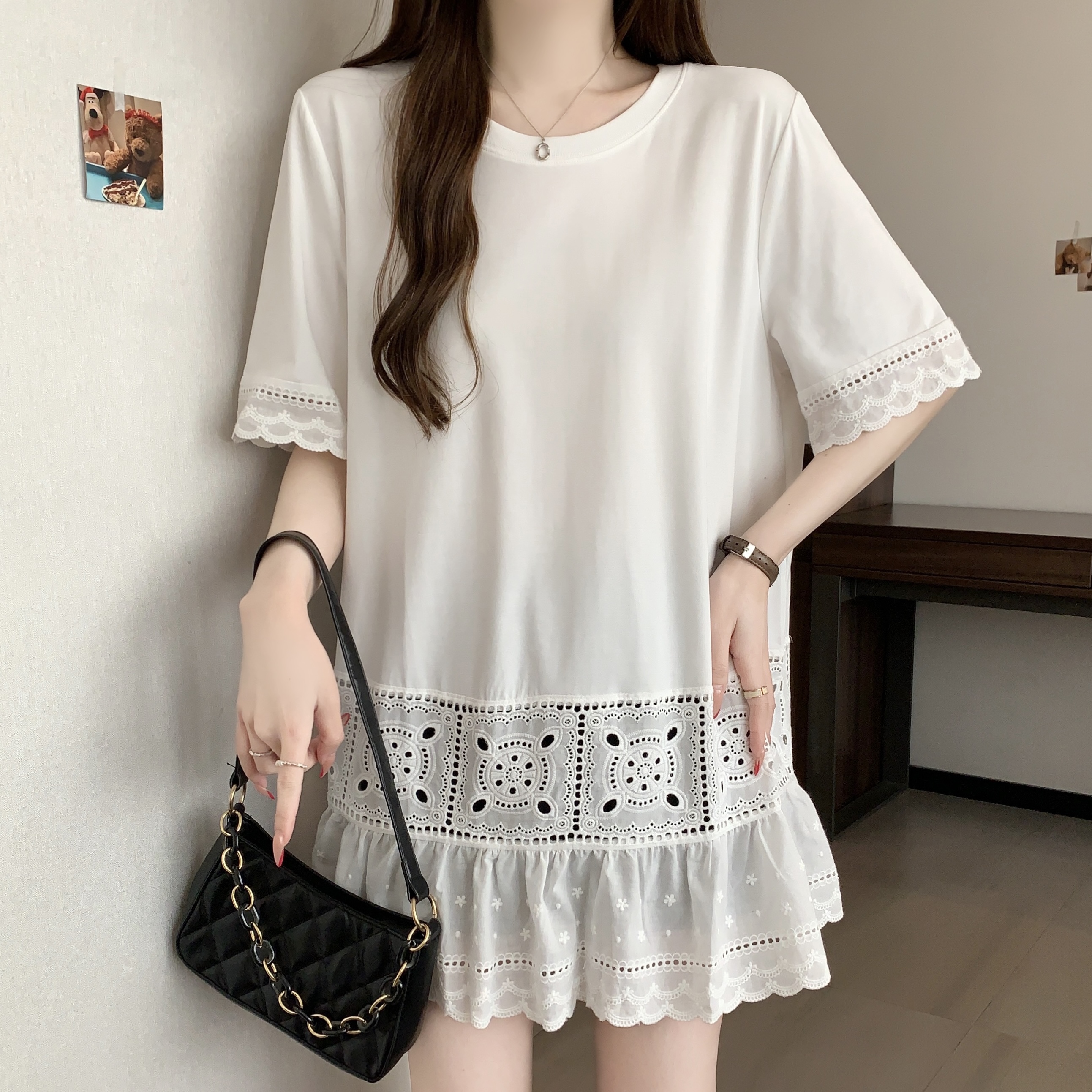빅 사이즈 지방 mm 여름 새로운 디자인 센스 불규칙 레이스 조각 반팔 티셔츠 여성 루즈핏 맨위