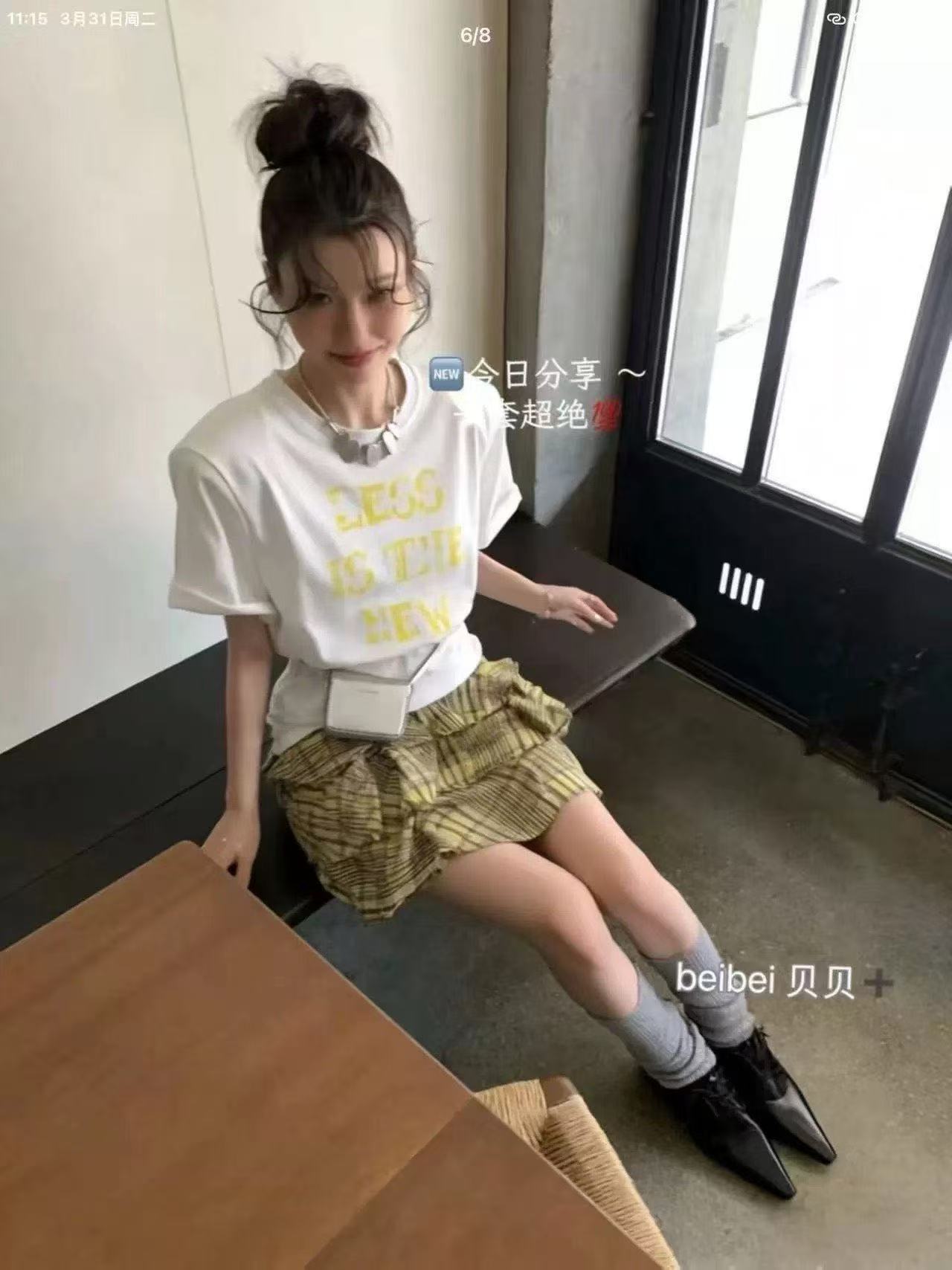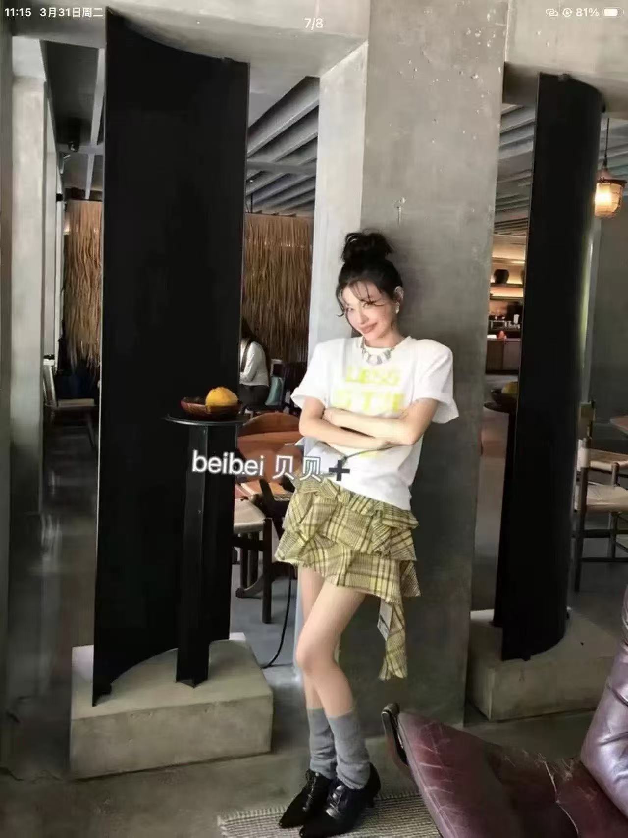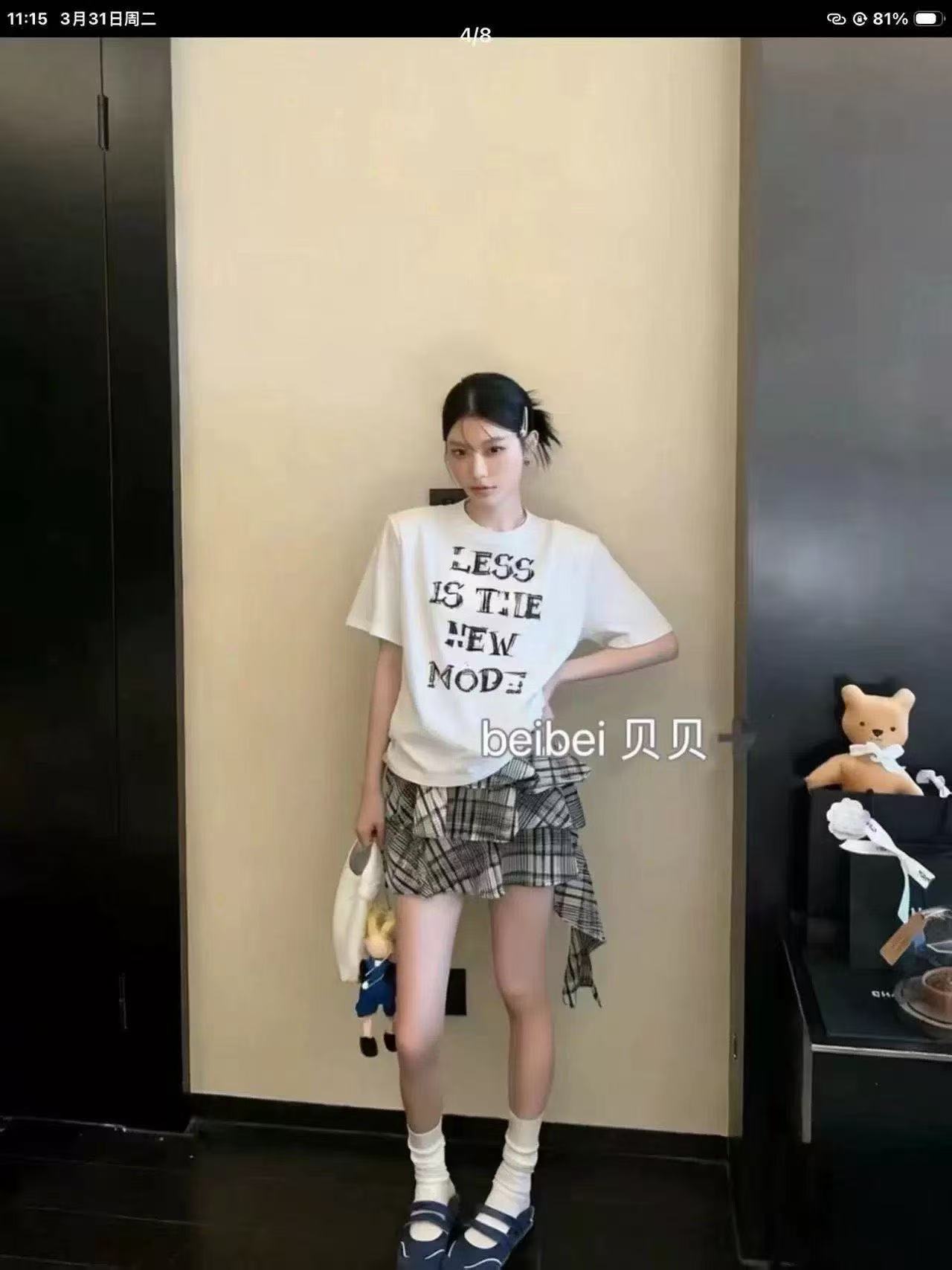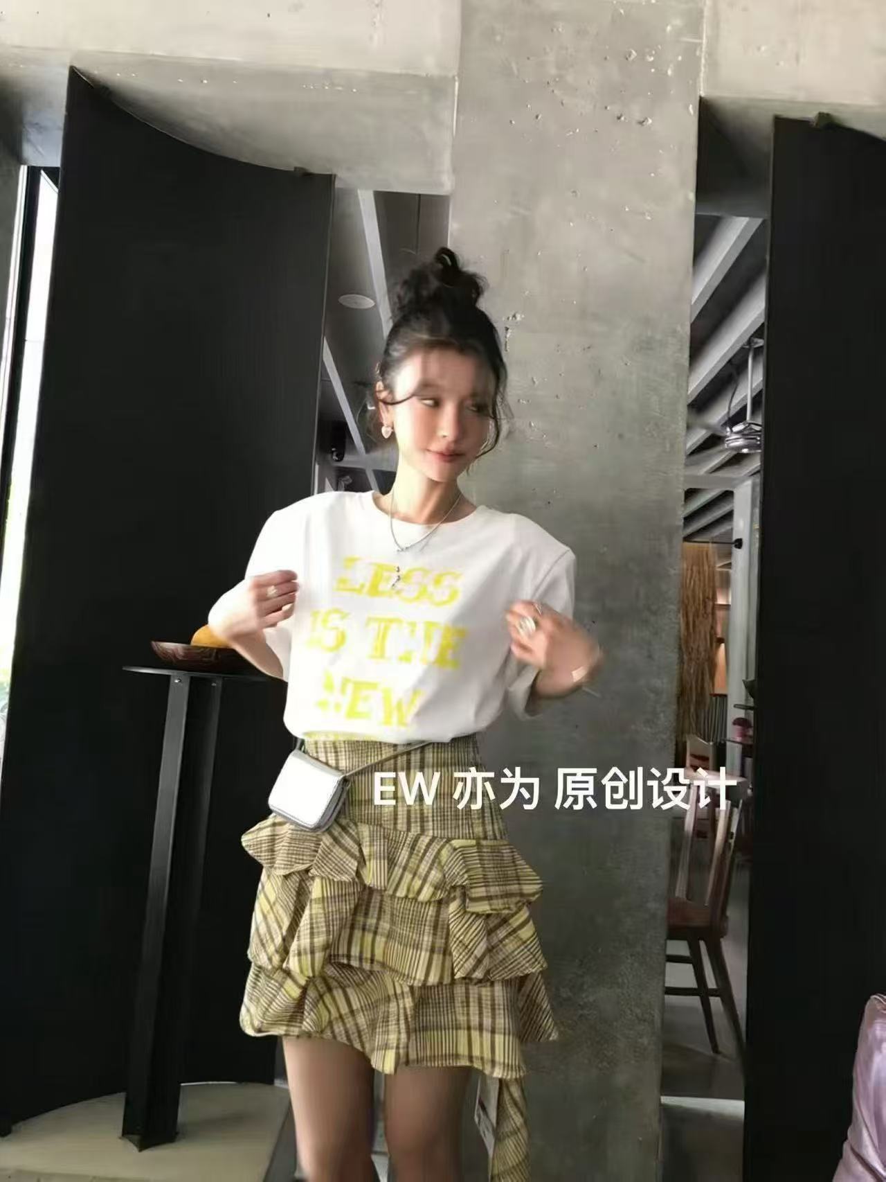 새로운 한 부서 작은 말 반팔 티셔츠 불규칙 스트랩 체크무늬 반신 스커트 스카프 3 세트