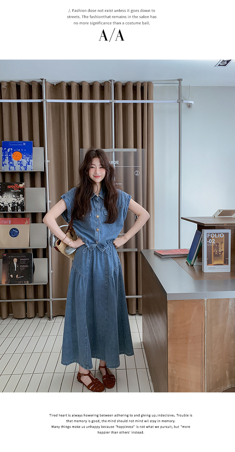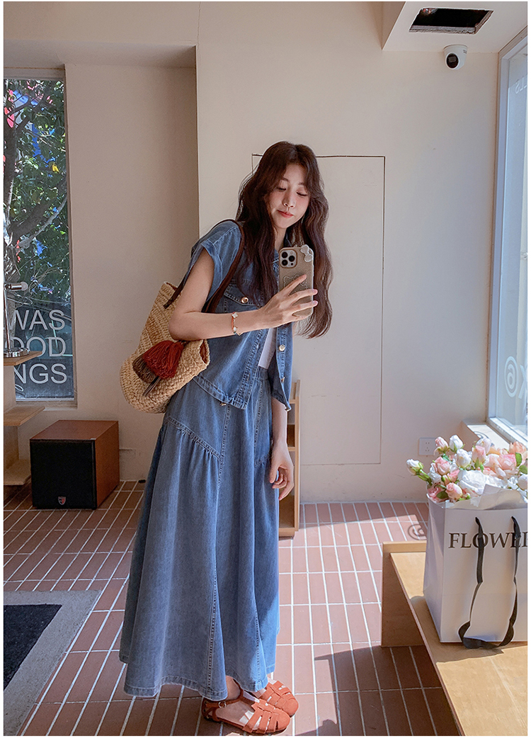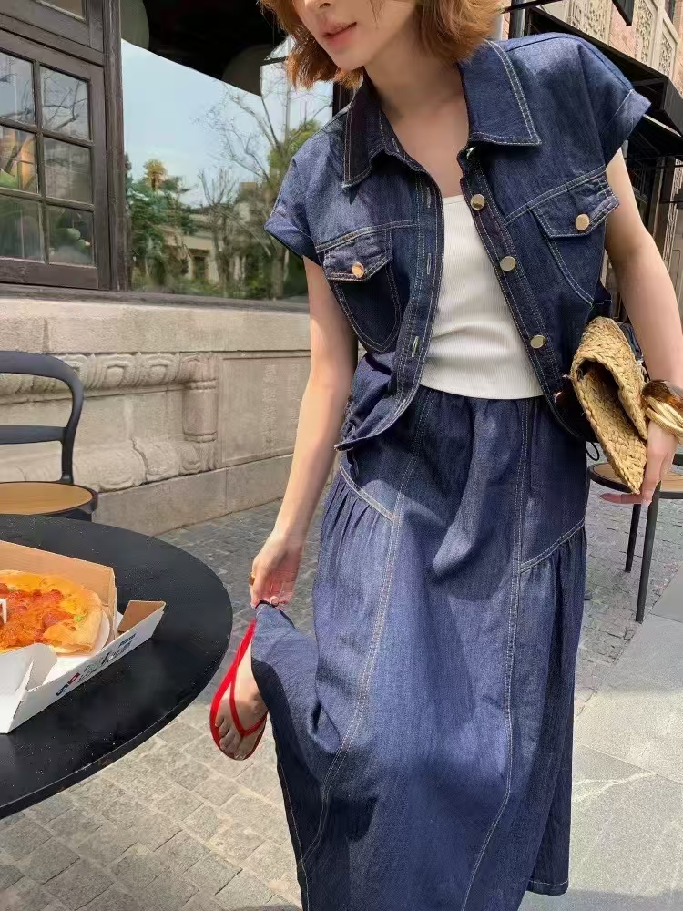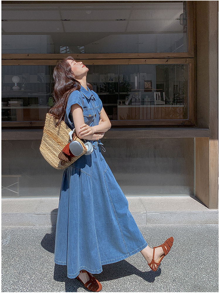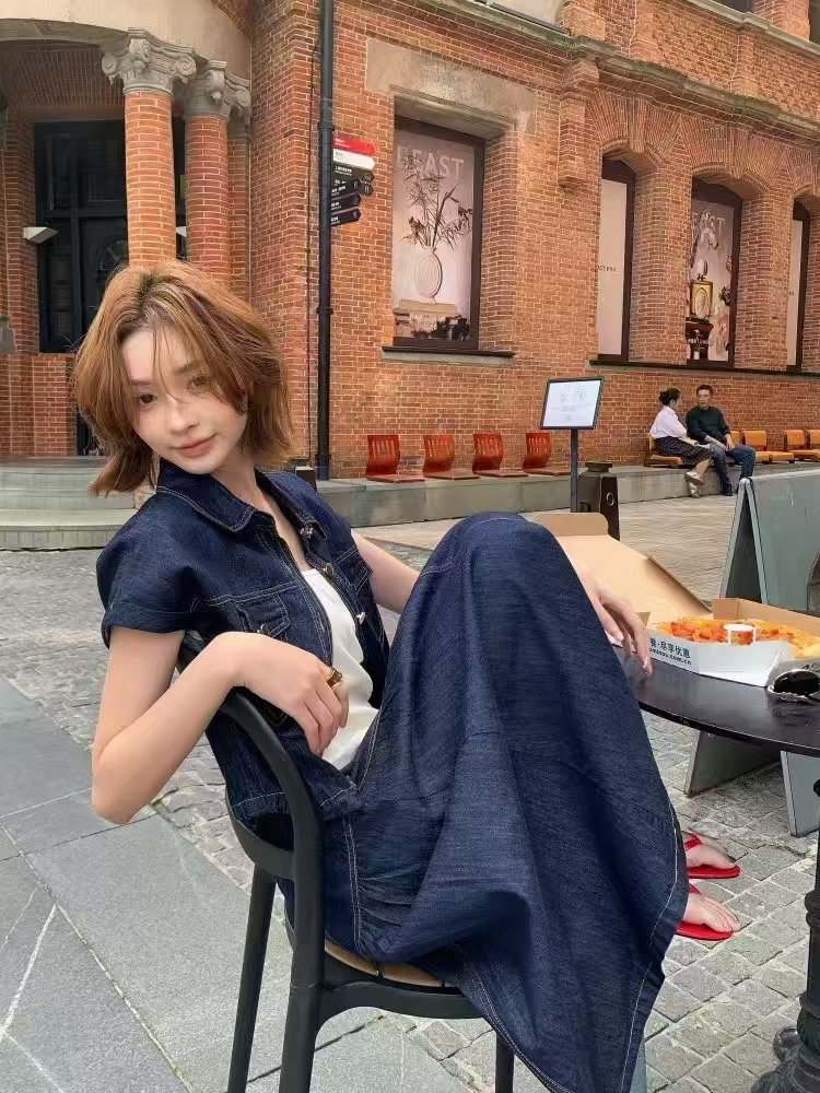 2026 여름 섹션 아메리칸 워크웨어 데님 멜빵 여성 드레스 루즈핏 캐주얼 주름 슬립 드레스 롱 스커트