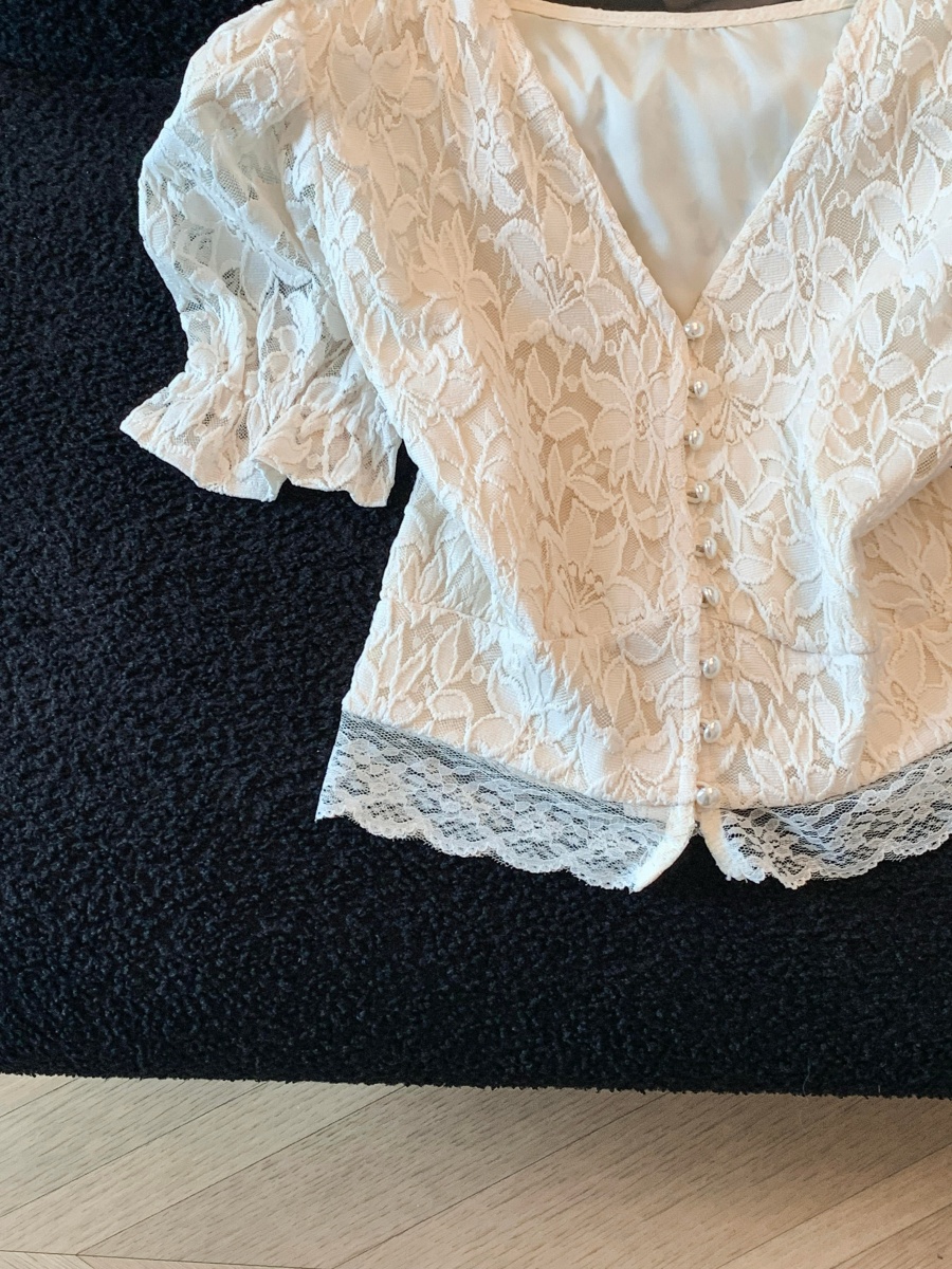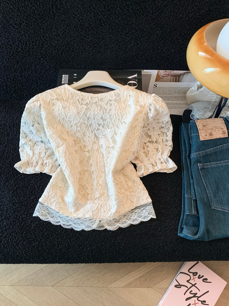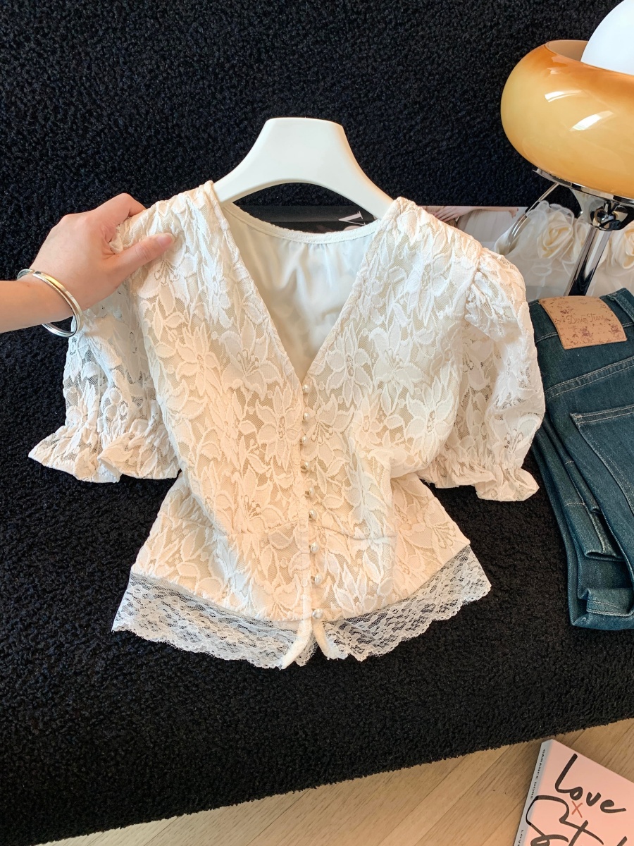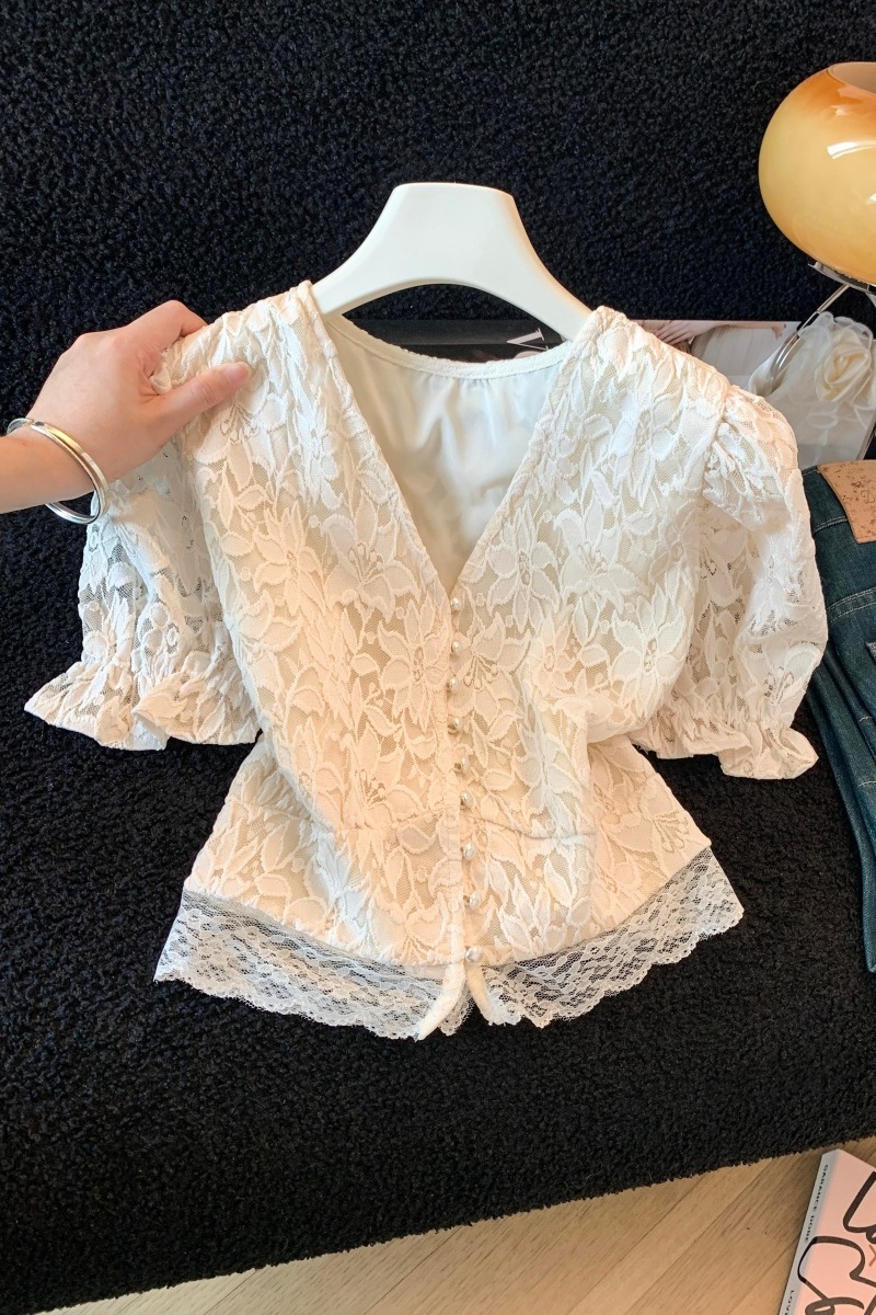 실사 한국 스타일 품격 질감 홀로우 아웃 자수 거품 소매 작은 셔츠 여성 봄 핀치 Pleat 허리 수축 연꽃 잎 맨위