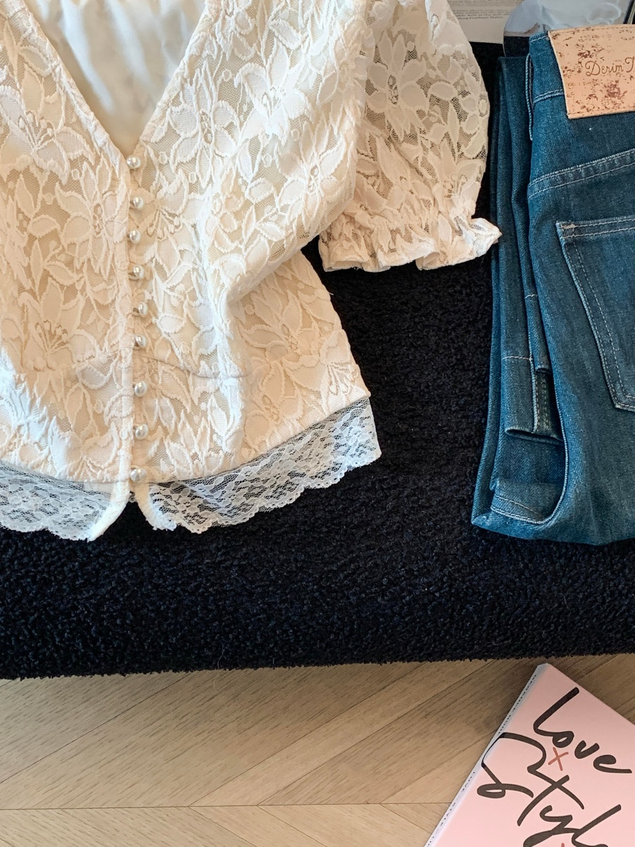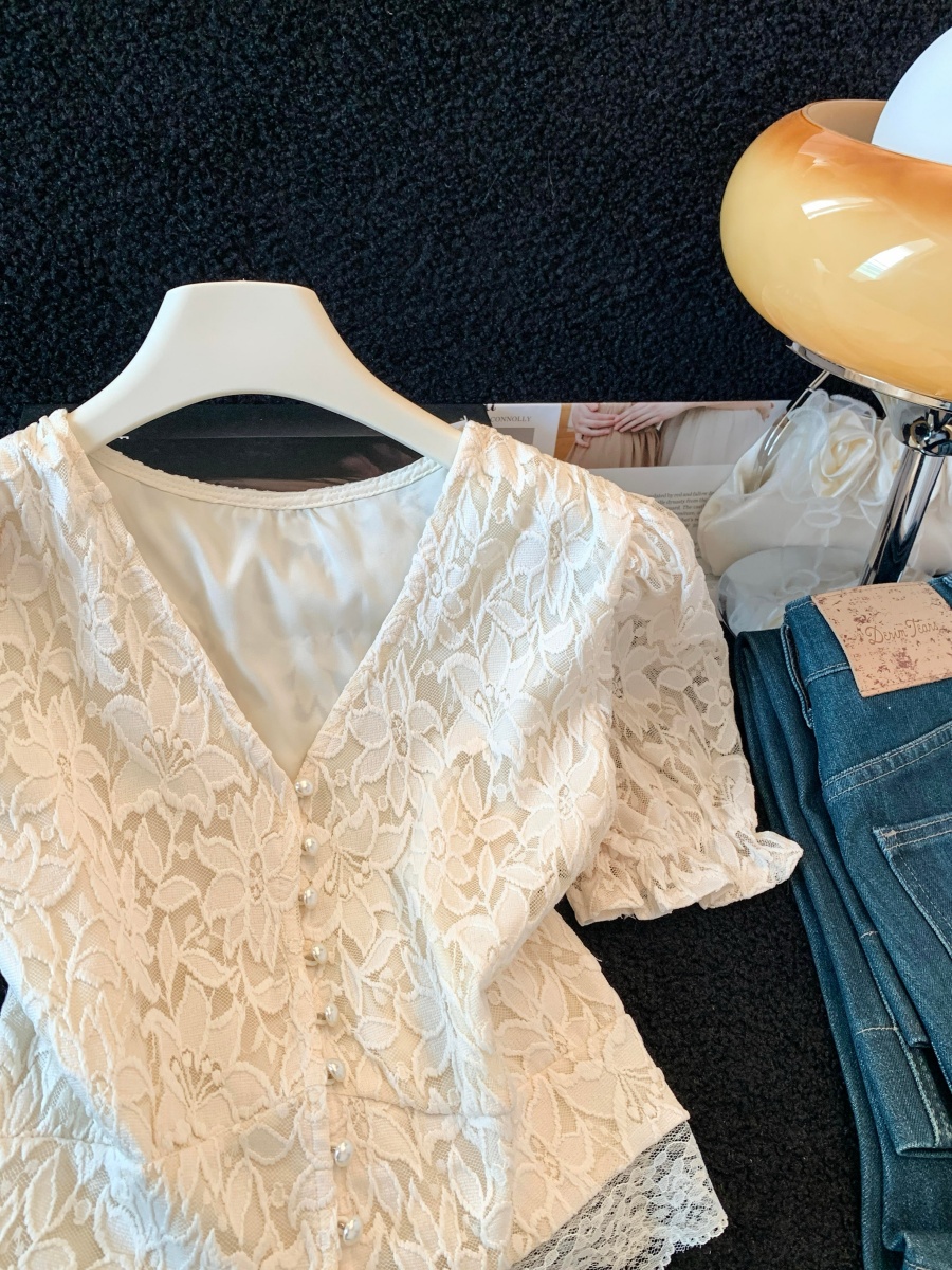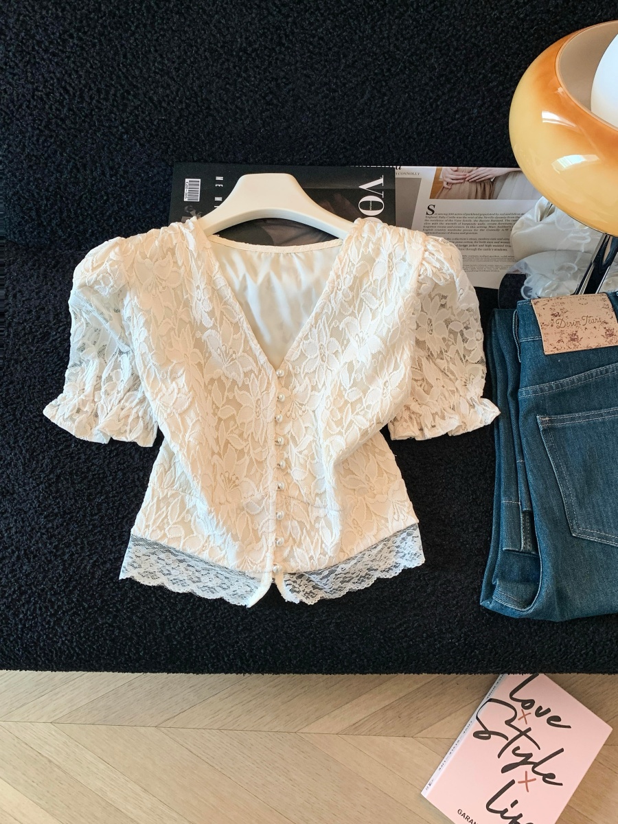 실사 한국 스타일 품격 질감 홀로우 아웃 자수 거품 소매 작은 셔츠 여성 봄 핀치 Pleat 허리 수축 연꽃 잎 맨위