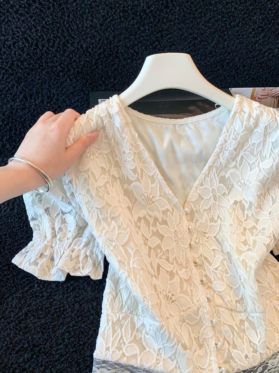 실사 여름 새로운 자수 홀로우 아웃 무거운 작업 구슬 조각 자수 레이스 베스트 다용도 반팔 새로운 외출용 레이스