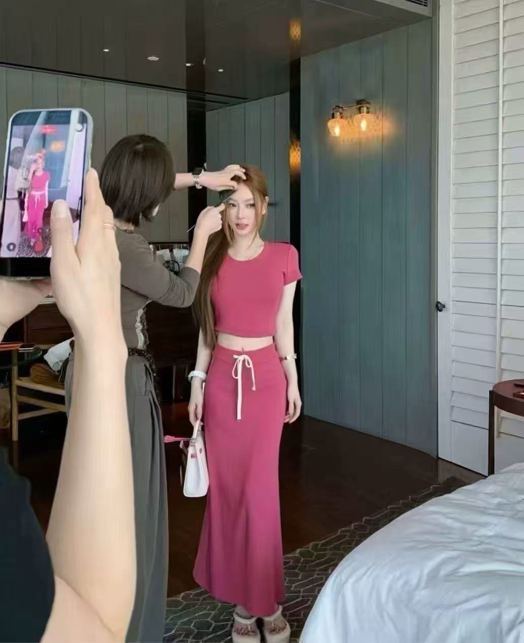 새로운 패션 자이언트 잘 생긴 아름다운 순수한 욕망 바람 이슬 허리 티셔츠 허리밴드 타이트 스커트 반신 스커트 투피스 세트