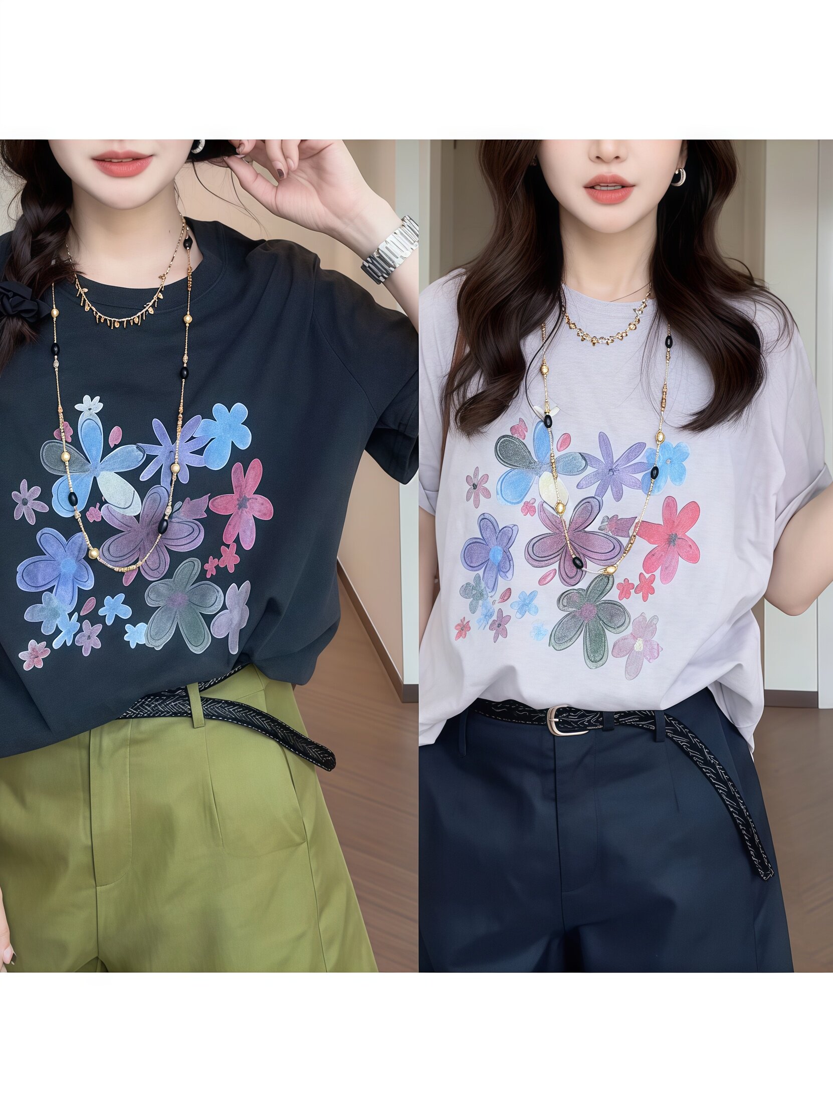 빅 사이즈 세계의 봄 패션 레트로 프린트 루즈핏 반팔 티셔츠 다용도 캐주얼