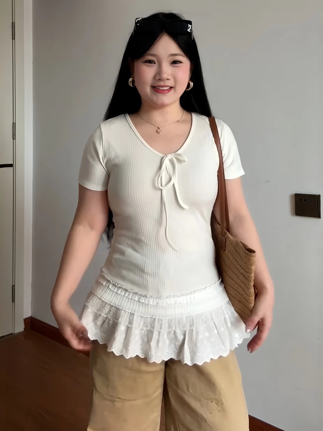 빅 사이즈 달콤함 레이스 조각 레이스업 V넥 반팔 티셔츠 여성 2026 봄 여름 몸매 가꾸기 자이언트 슬림해 보이는 화이트 맨위