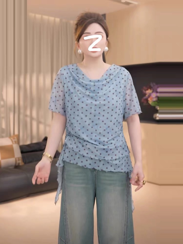 지방 지아 지아 지방 mm 빅 사이즈 여성 의류 리플 도트 무늬 티셔츠 여름 쉬폰 망사 디자인 센스 홀치기 염색 맨위