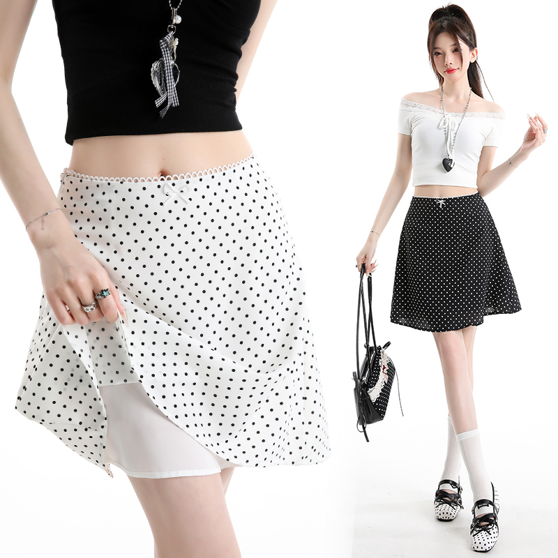 한 부서 도트 무늬 패치워크 레이스 프릴 반신 스커트 여성 여름 얇은 스타일 하이웨이스트 쉬폰 한 마디 표지 고기 인어 꼬리 스커트