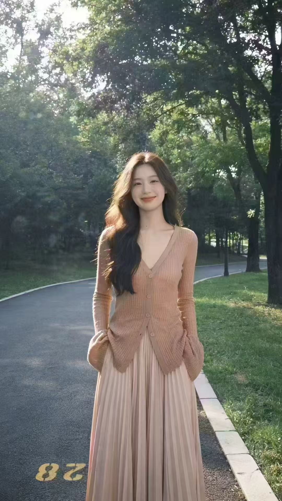 새로운 부드러운 바람 핑크색 니트 V넥 나팔 소매 오픈 가디건 허리밴드 플리츠 반신 치마 세트