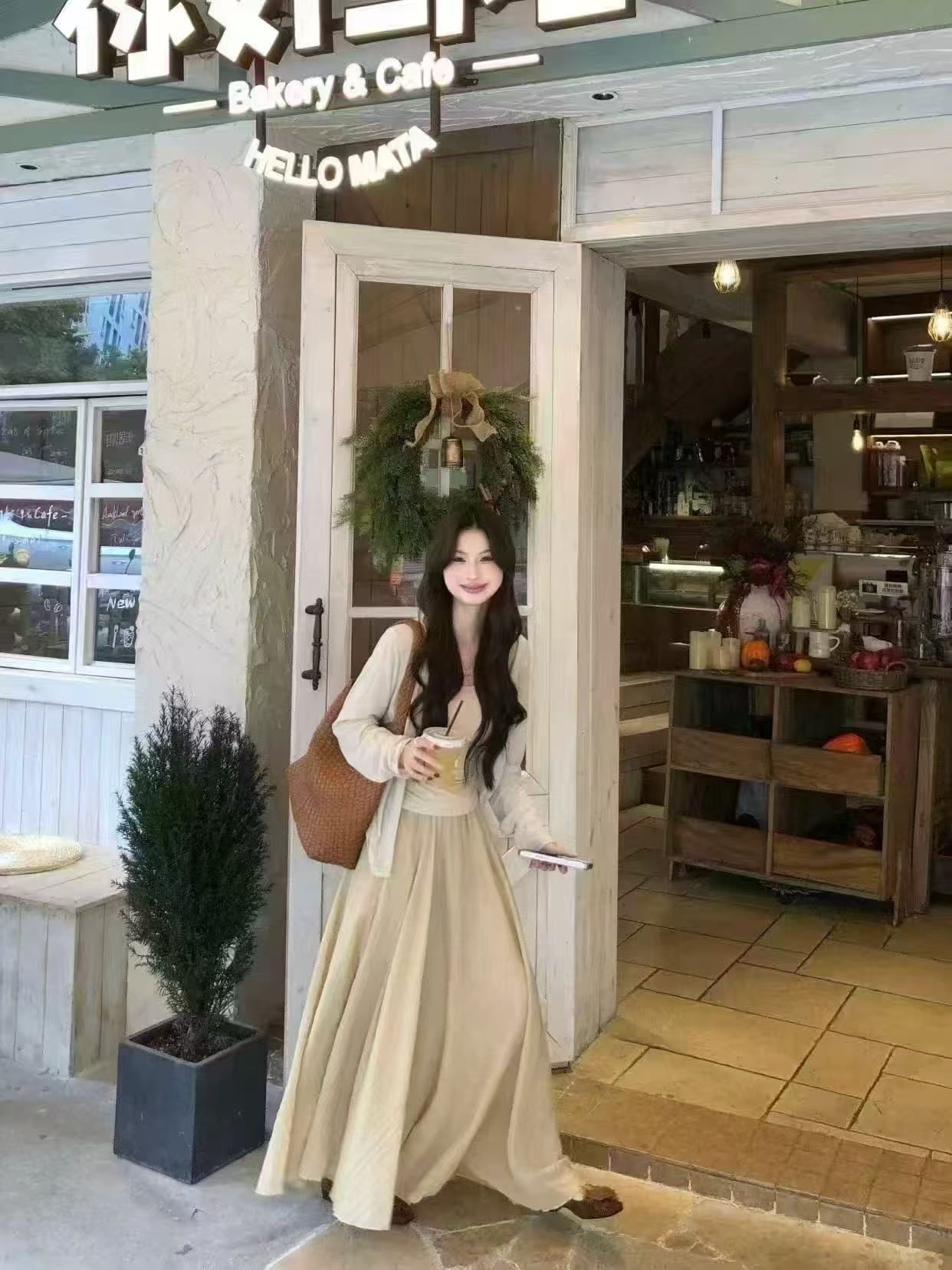 새로운 한국 스타일 패션 젠 몸매 가꾸기 자외선 차단 오픈 가디건 슬립 허리밴드 도트 무늬 반신 스커트 3종 세트