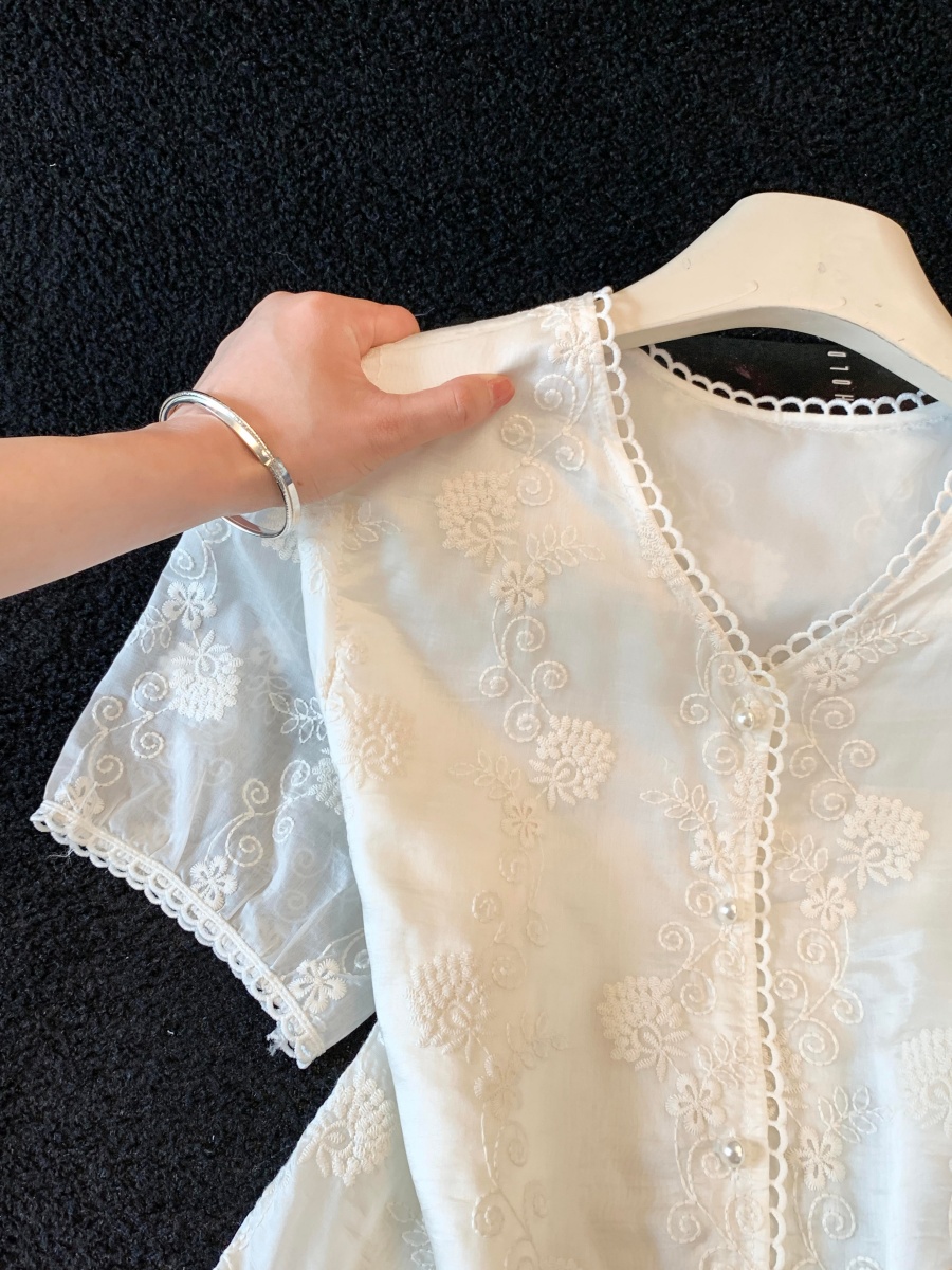 실사 여름 새로운 자수 홀로우 아웃 무거운 작업 구슬 조각 자수 레이스 베스트 다용도 반팔 새로운 외출용 레이스