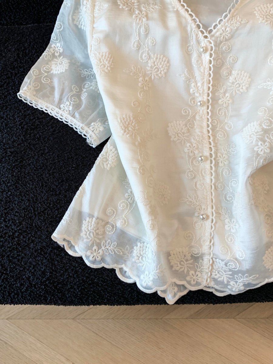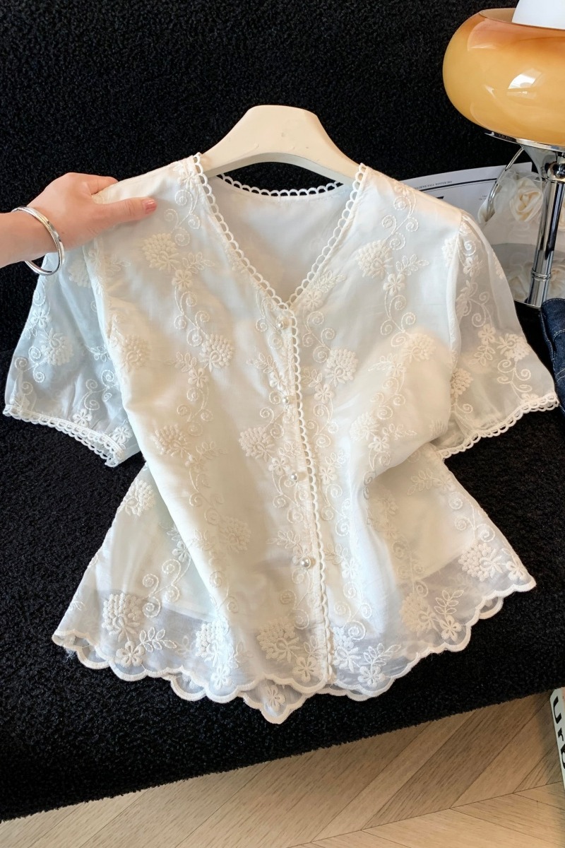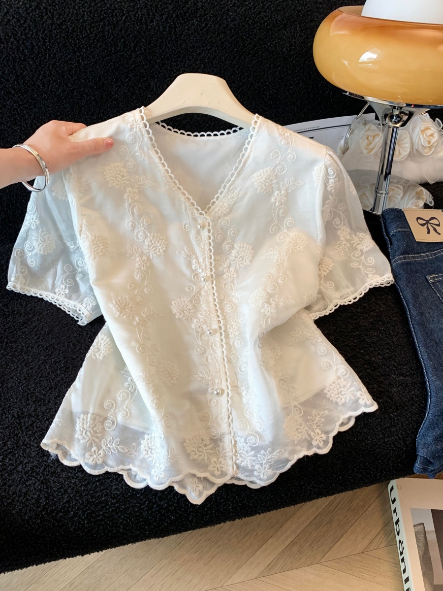 실사 2026 여름 새로운 레이스 셔츠 반팔 홀로우 아웃 허리 수축 품격 V넥 고급 외국 가스 패션 작은 셔츠