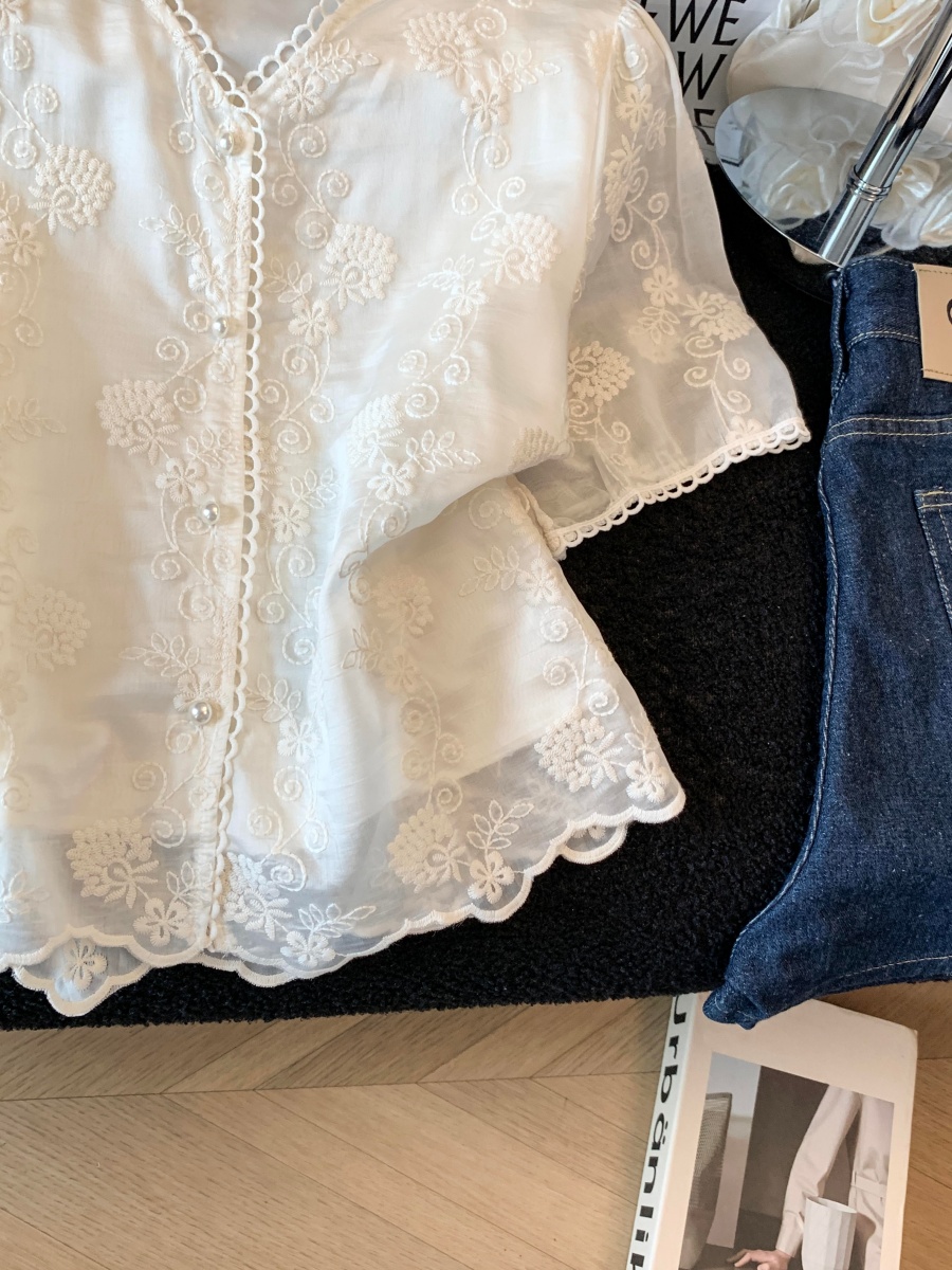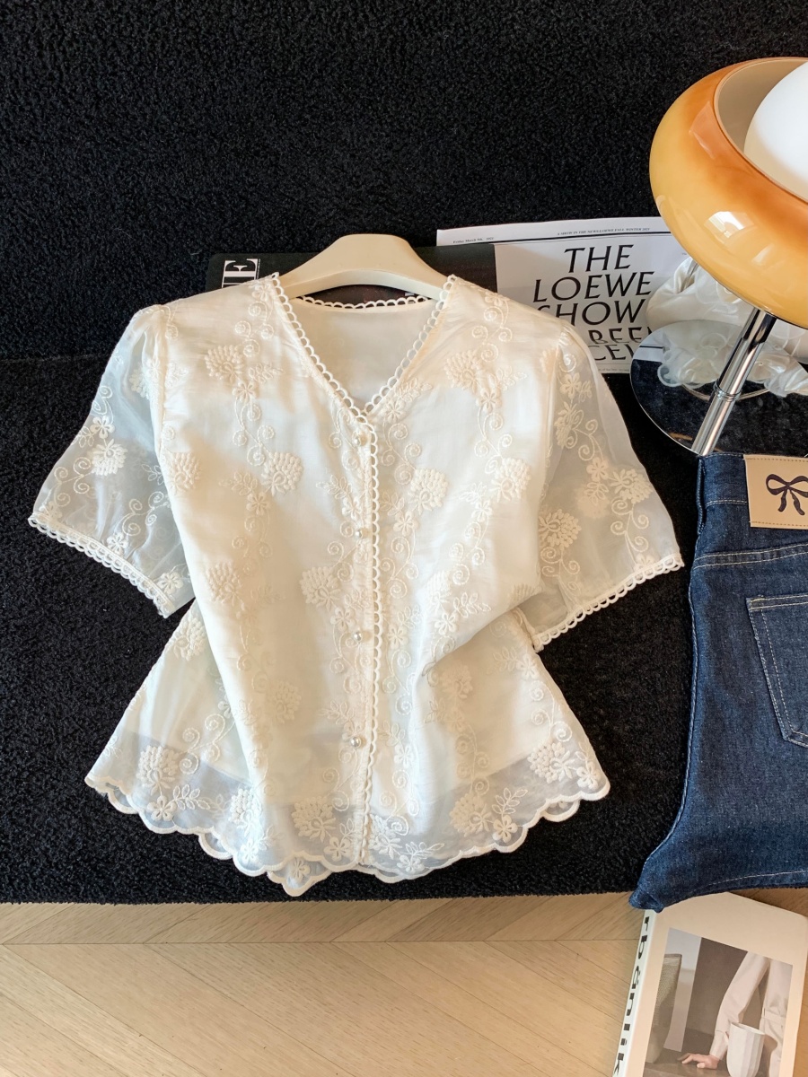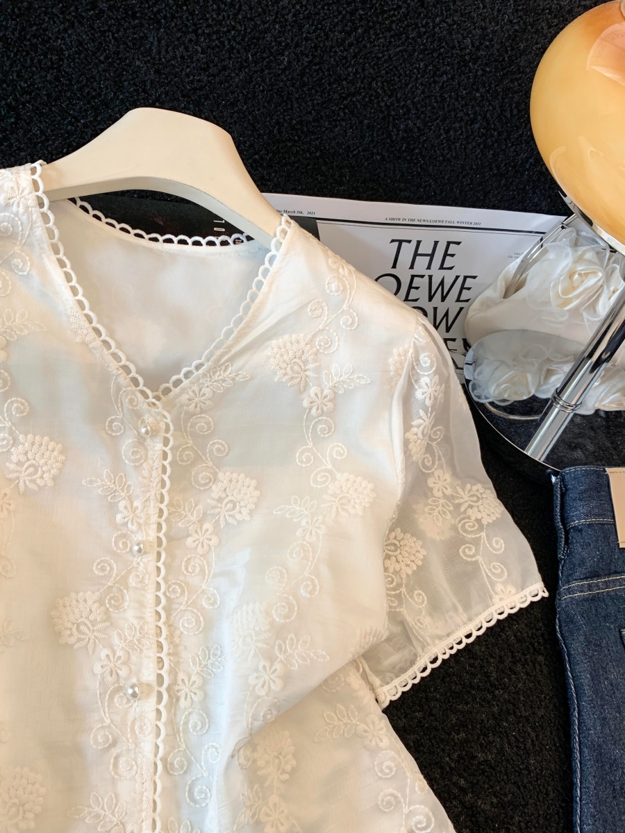 실사 2026 여름 새로운 레이스 셔츠 반팔 홀로우 아웃 허리 수축 품격 V넥 고급 외국 가스 패션 작은 셔츠
