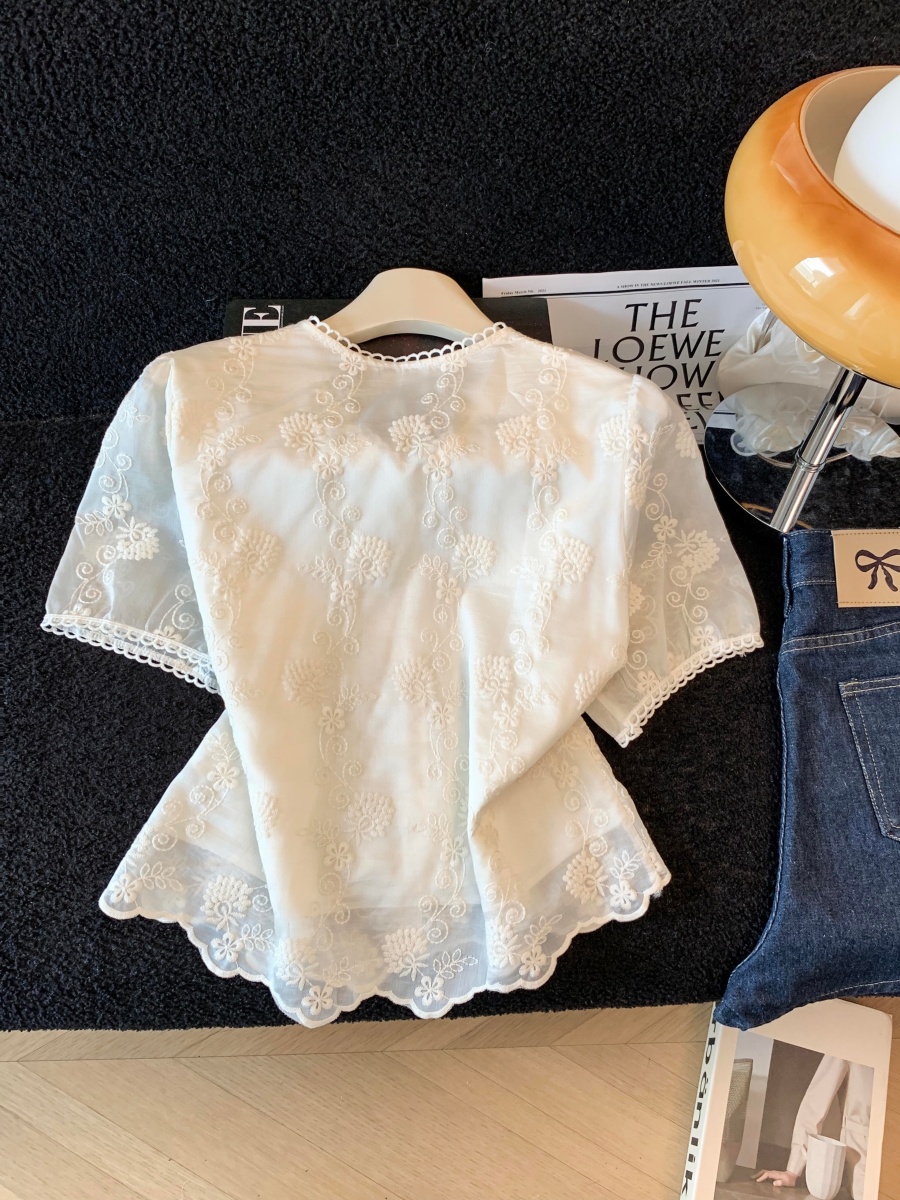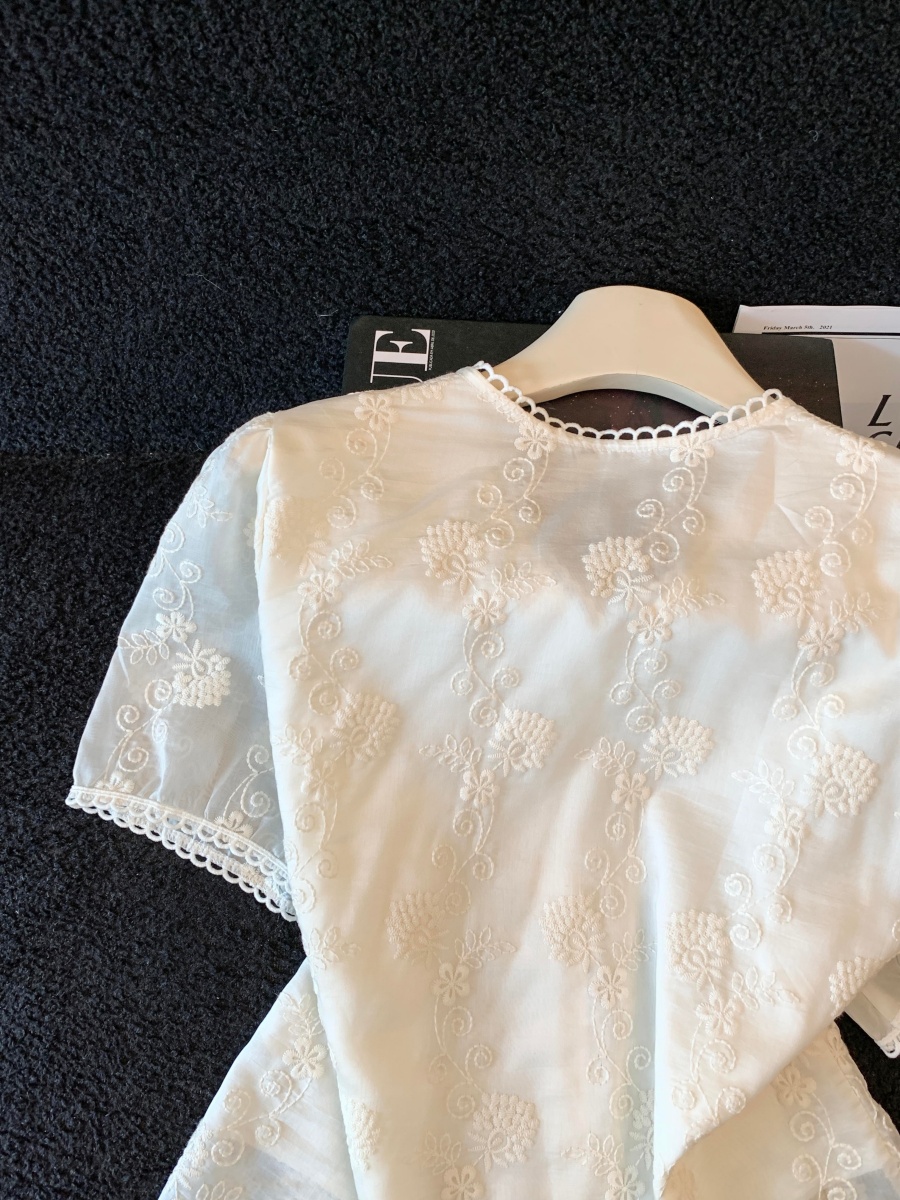 실사 2026 여름 새로운 달콤함 거품 소매 자수 셔츠 맨위 여성 라운드 넥 작은 셔츠 연령 감소 맨위