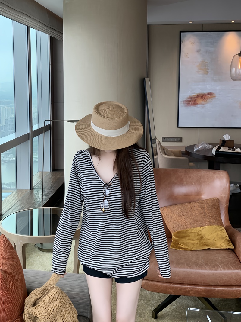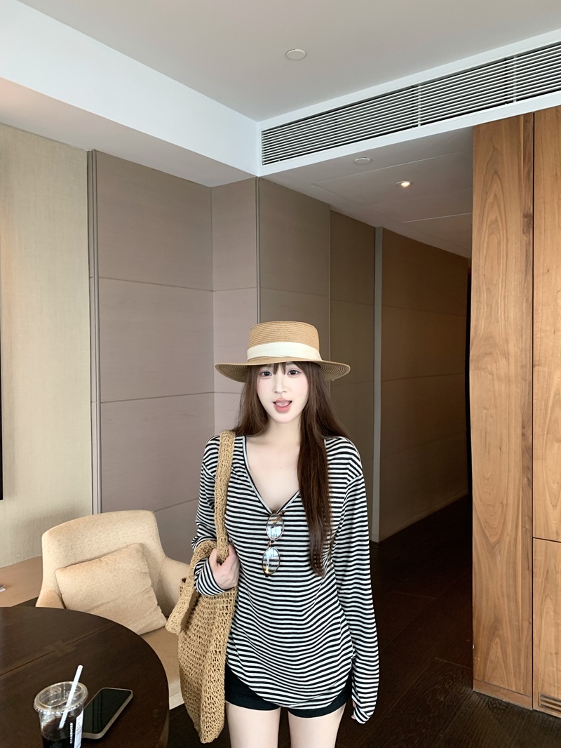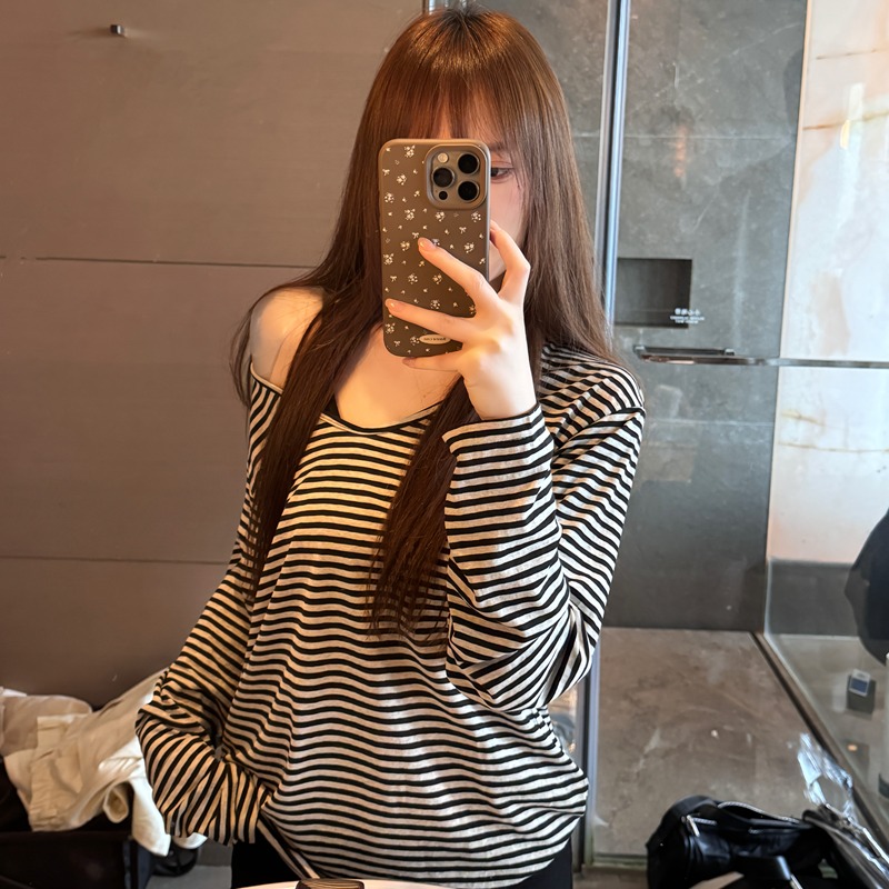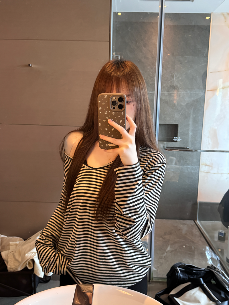 한 부서 패션 느긋한 바람 루즈핏 오프숄더 프린트 자외선 차단 티셔츠 여성 흑백 줄무늬 슬림해 보이는 다용도 미니 스커트 세트
