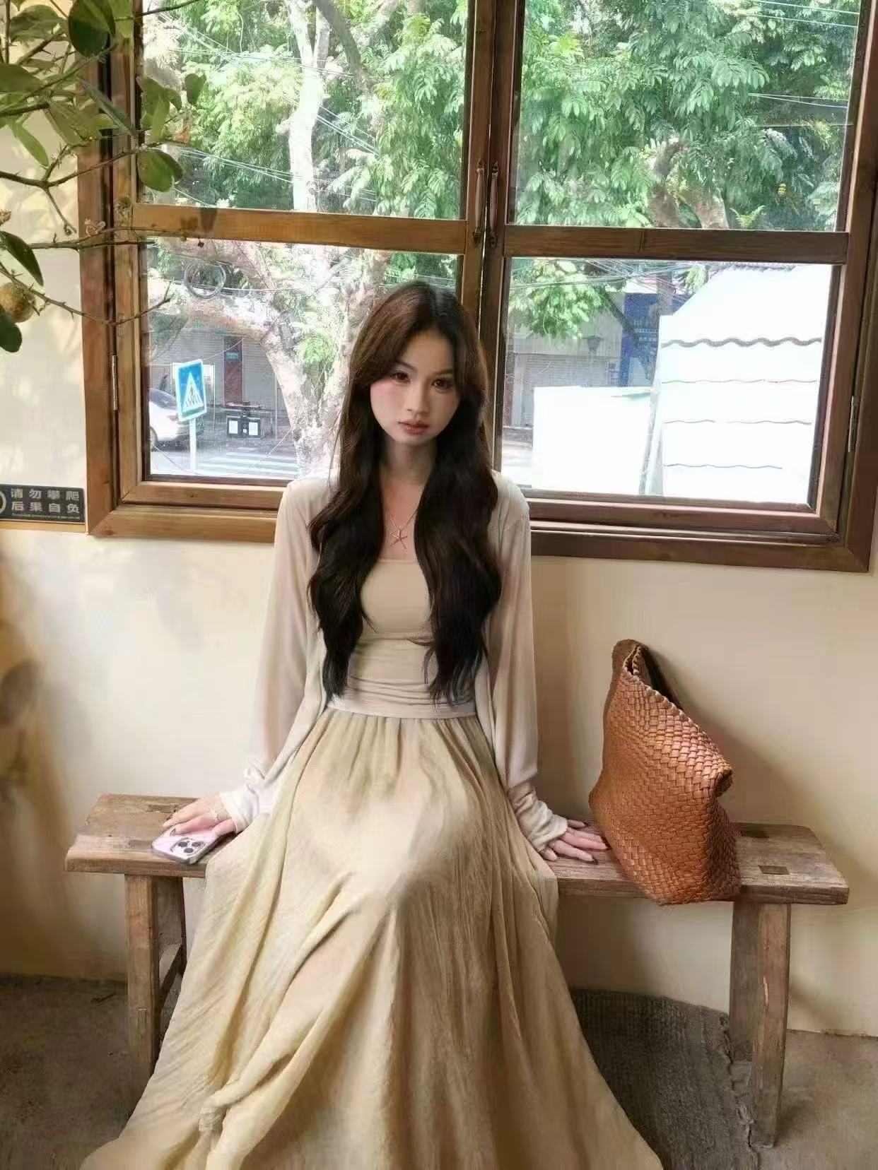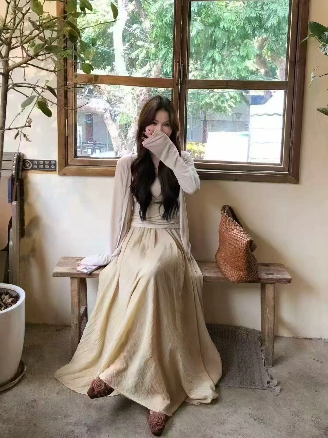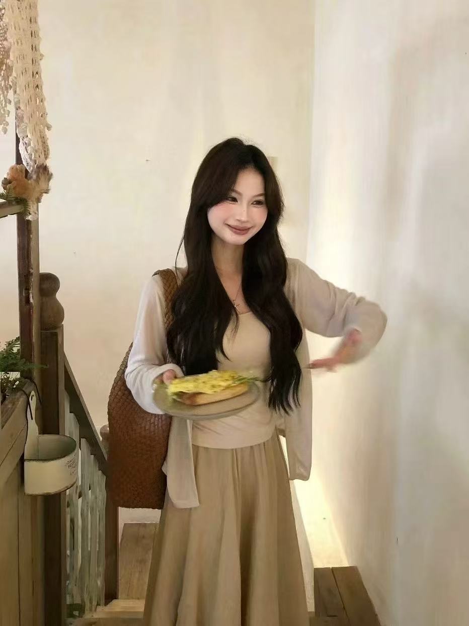 새로운 한국 스타일 패션 젠 몸매 가꾸기 자외선 차단 오픈 가디건 슬립 허리밴드 도트 무늬 반신 스커트 3종 세트