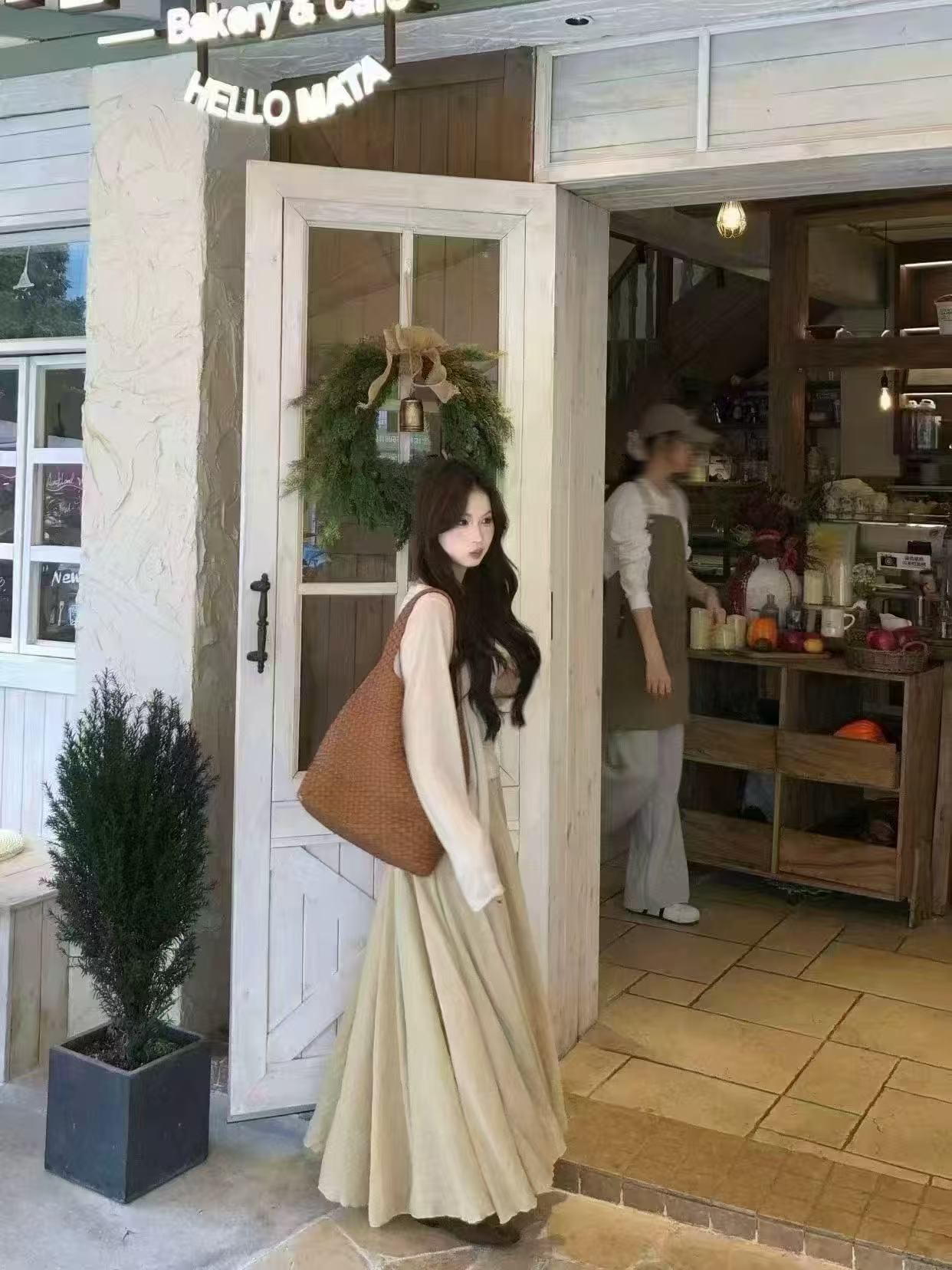 새로운 부드러운 바람 핑크색 니트 V넥 나팔 소매 오픈 가디건 허리밴드 플리츠 반신 치마 세트