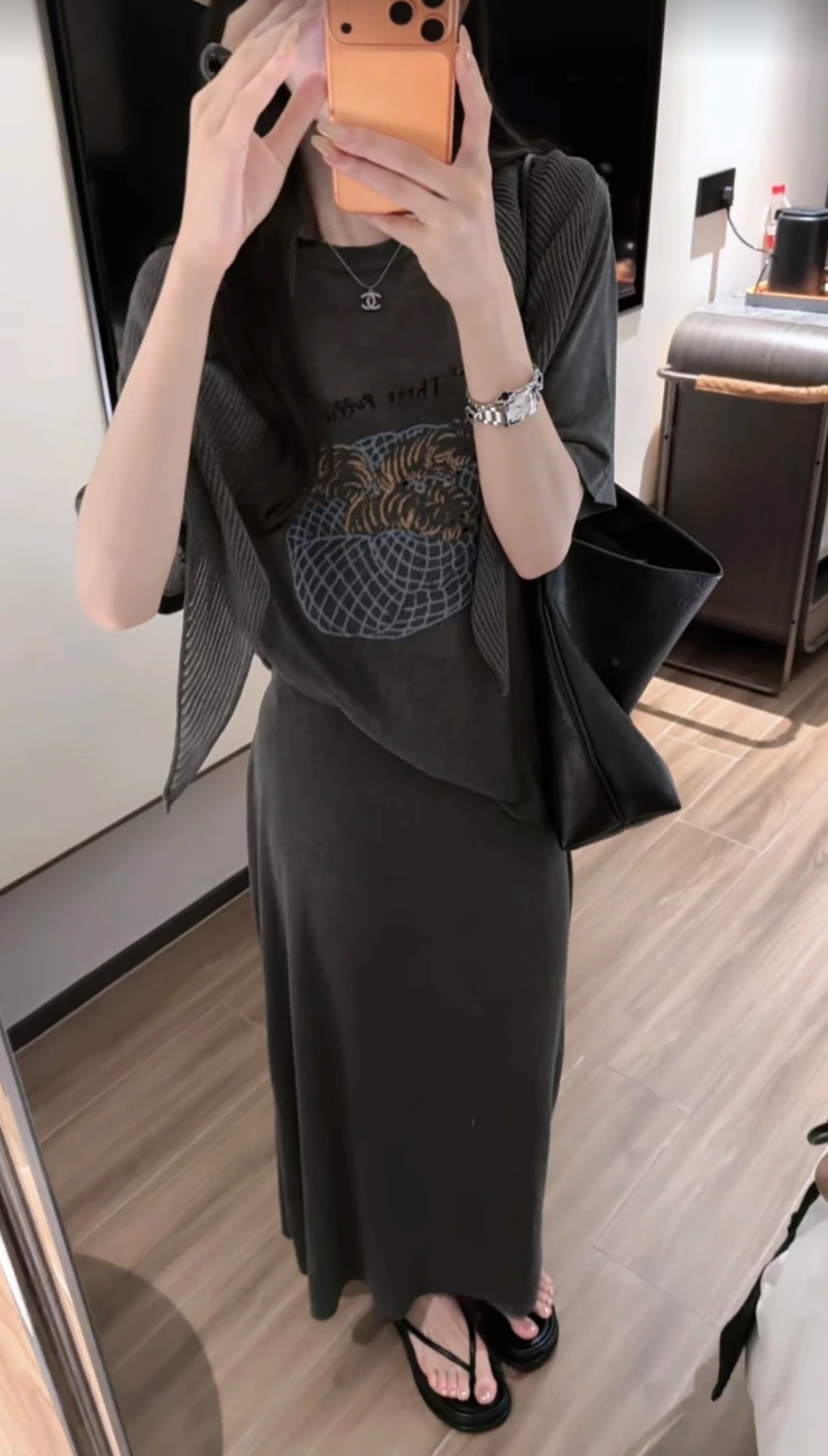 muzm 회색 니트 통기성 자카드 공예 티셔츠 슬림해 보이는 세 조각 로드 중 치마 여름 디자인 센스