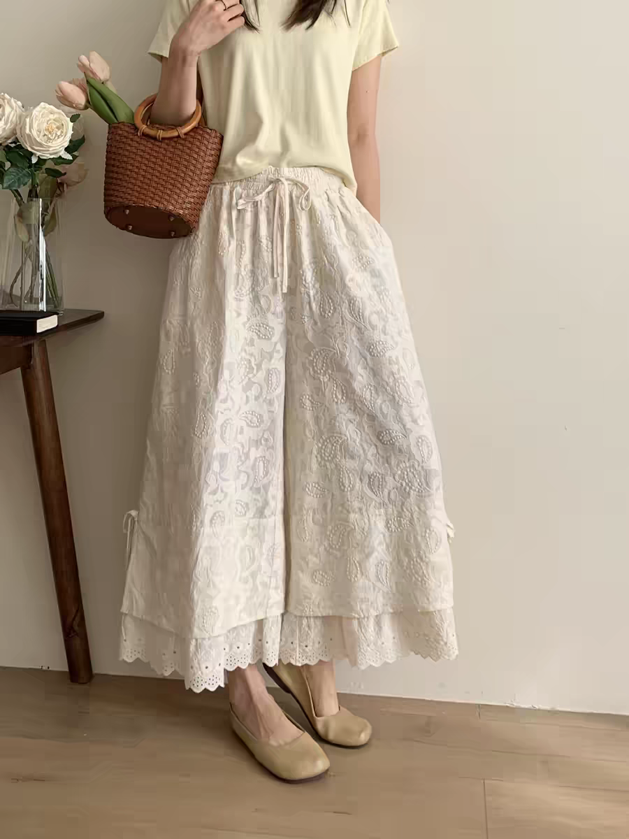 2026 새로운 일본식 홀로우 아웃 자수 패치워크 허리밴드 루즈핏 캐주얼 연령 감소 순면 다용도 와이드 레그 팬츠
