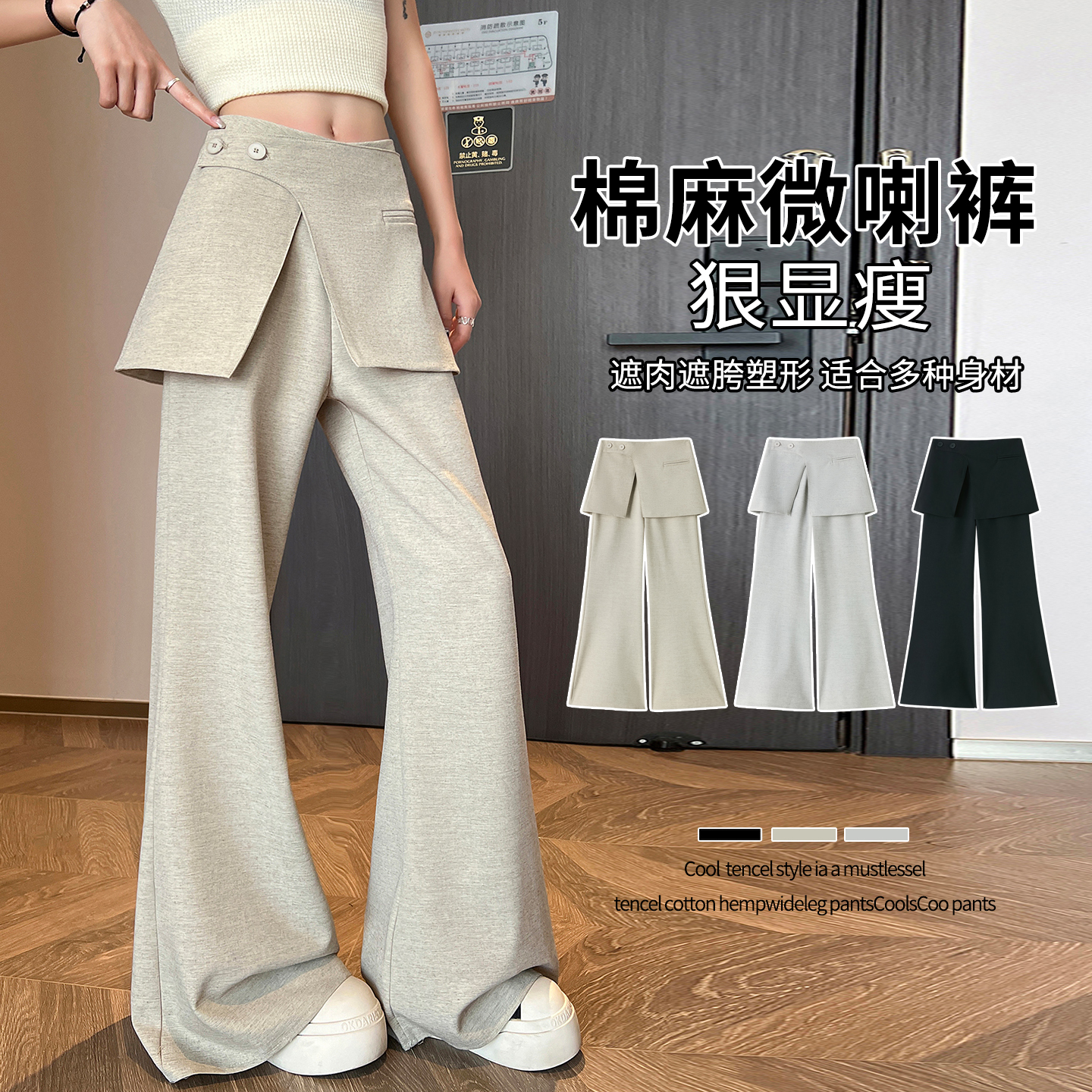 실사 얼음 실크 면 린넨 페이크 레이어드 방귀 커튼 부츠컷 바지 여성 여름 하이웨이스트 도루 센스 캐주얼 아마 정장 나팔 바지