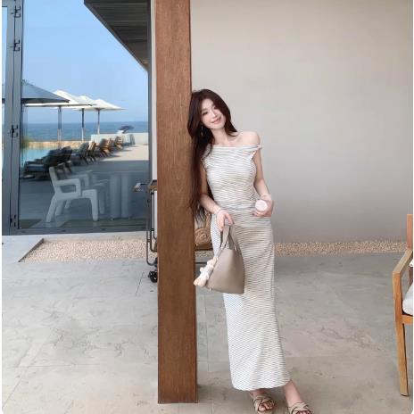 sya 크 사이 작은 웨스트 스트라이프 오프숄더 니트 여성 드레스 여름 프랑스식 비스듬한 어깨 허리 수축 비틀림 핀치 Pleat 롱 스커트
