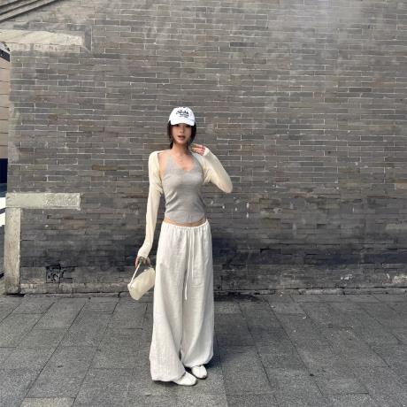 yolo shop 수퍼 모델 비율 2.0 일 실크 느슨함 센스 로우 웨이스트 레이스업 캐주얼 바지 여성 여름 스트라이프 부츠컷 바지