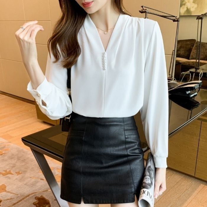 여성 셔츠 디자인 센스 작은 대중 2026 봄 가을 새로운 긴팔 경력 외국 가스 V넥 셔츠 품격 맨위 ins