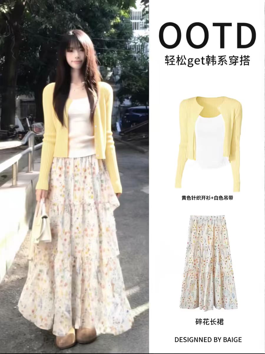 황색 오픈 가디건 꽃무늬 반신 롱 스커트 봄 드레스 ootd 착용 가져 가라. 전체 집합