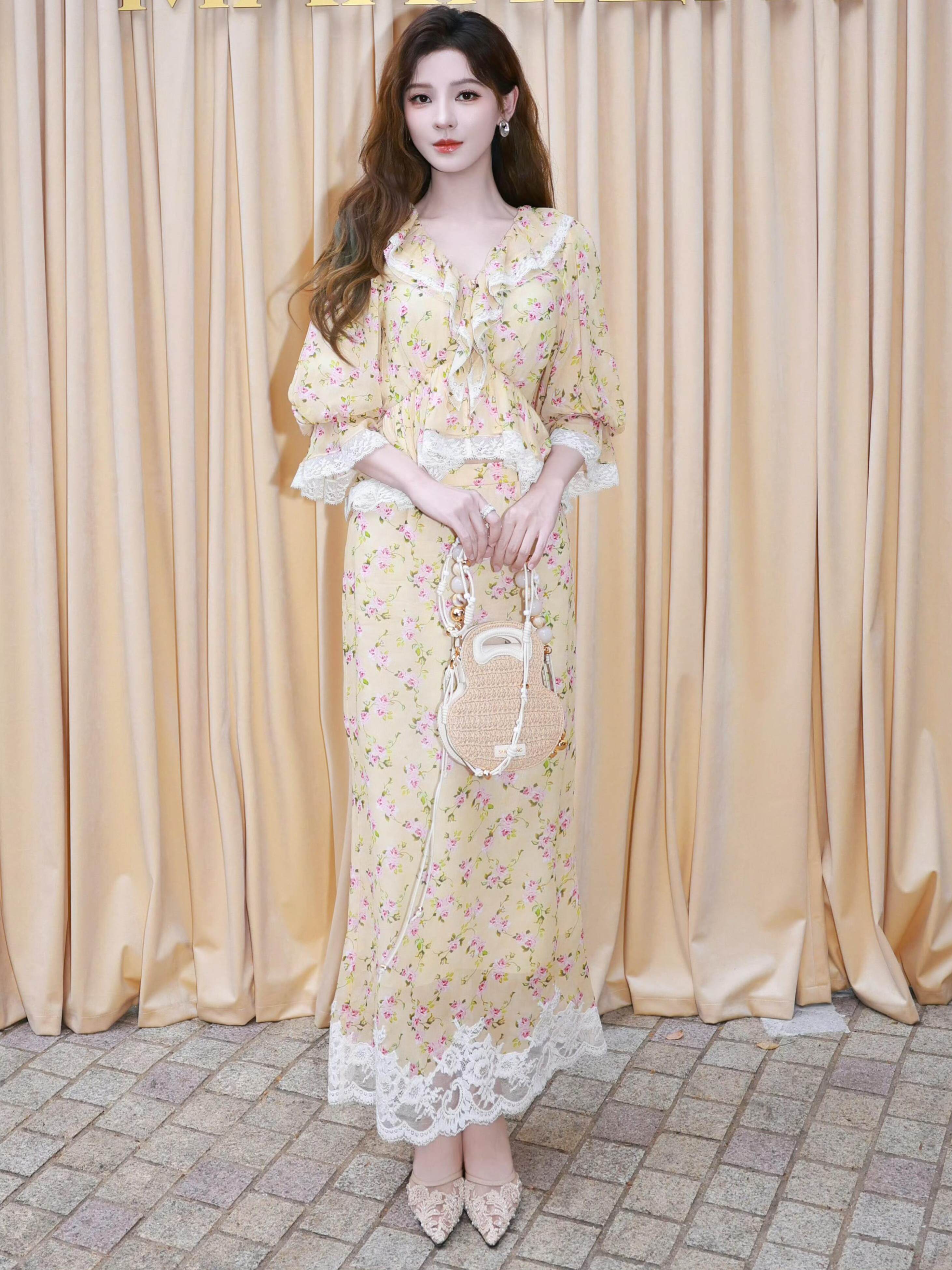 장 줘 크 사이 같은 단락 프랑스식 낭만주의 바람 꽃무늬 나팔 소매 셔츠 하이웨이스트 반신 스커트 디자인 센스 작은 대중 세트 여성