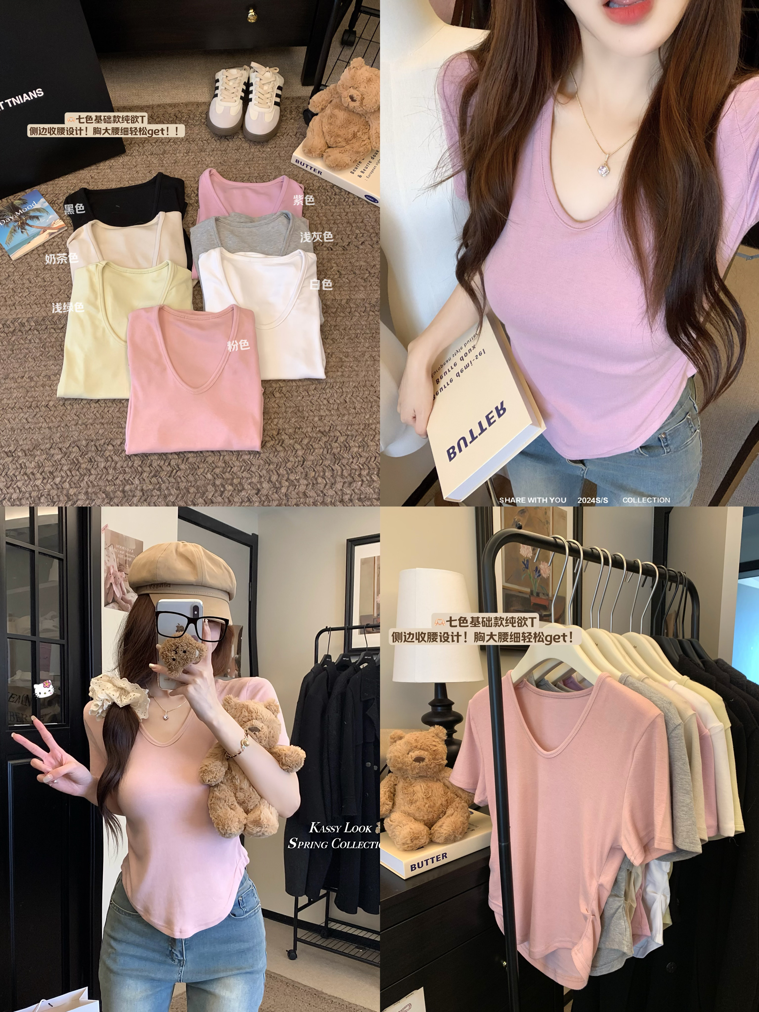 실사 정가 몸매 가꾸기 슬림해 보이는 다용도 기초 섹션 주름 맨위 섹시함 V넥 반팔 티셔츠