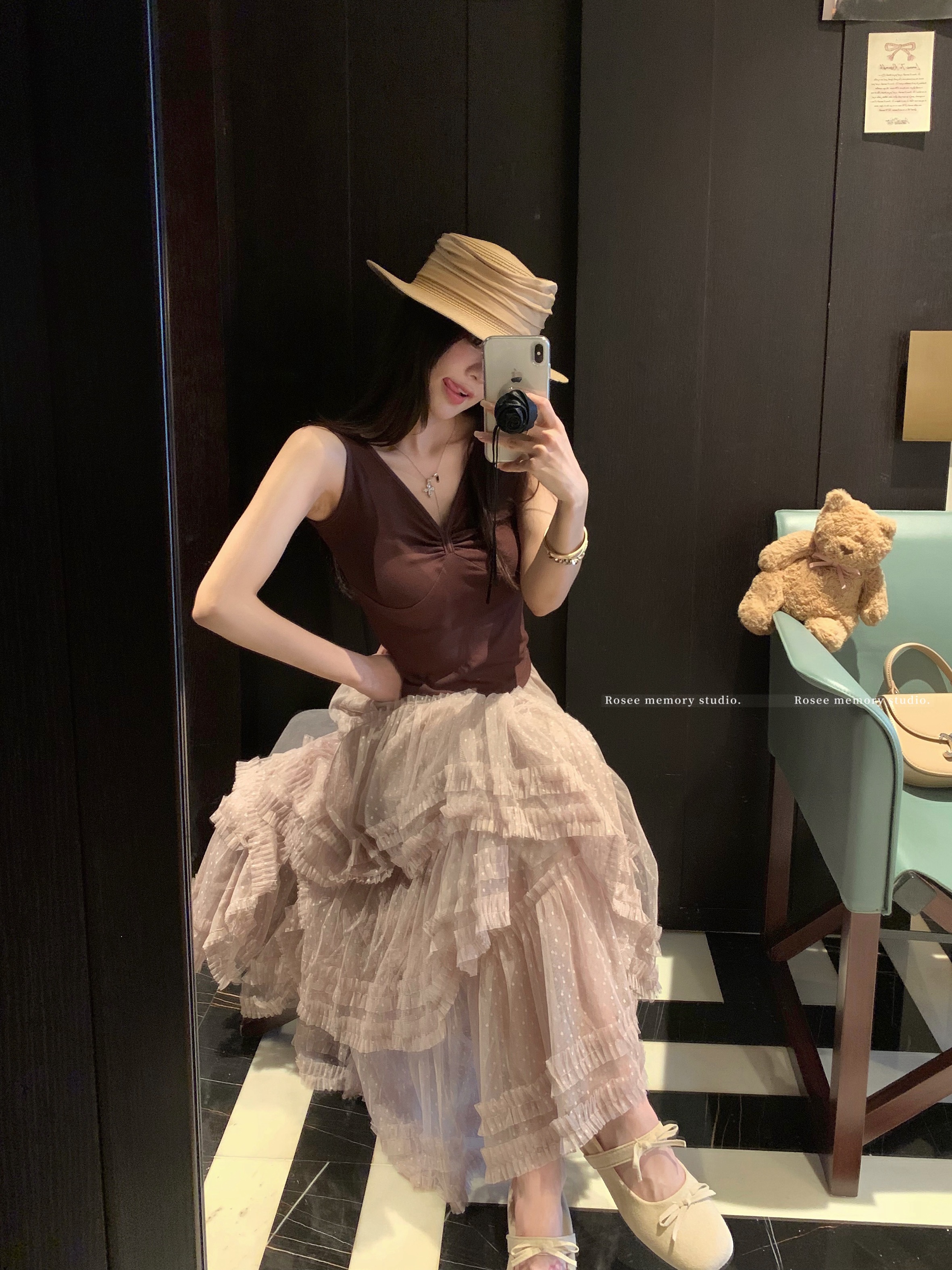실사 순수한 욕망 몸매 가꾸기 우아함 품격 펌프 Pleat V넥 민소매 조끼 레트로 망사 반신 스커트 도트 무늬 롱 스커트