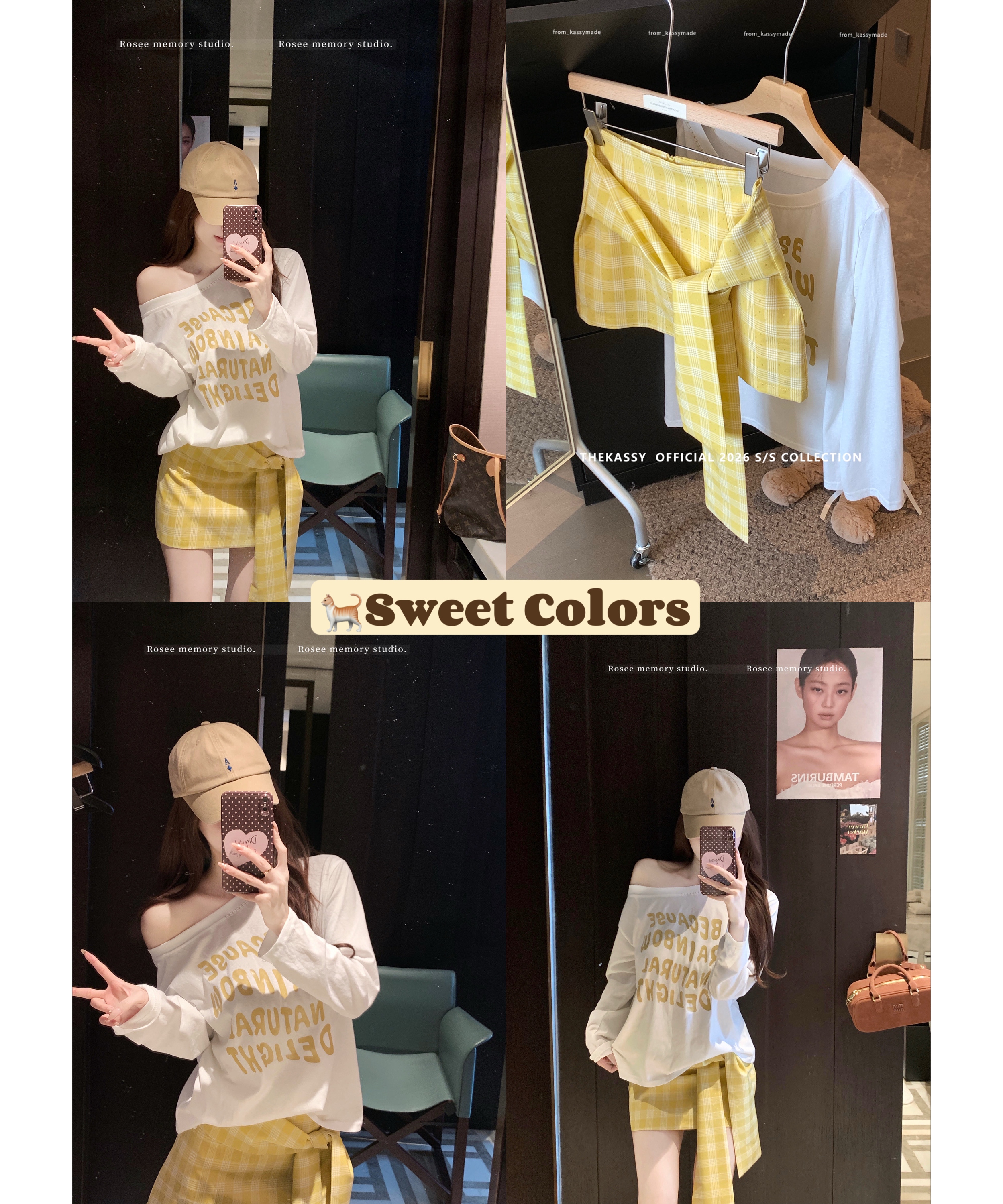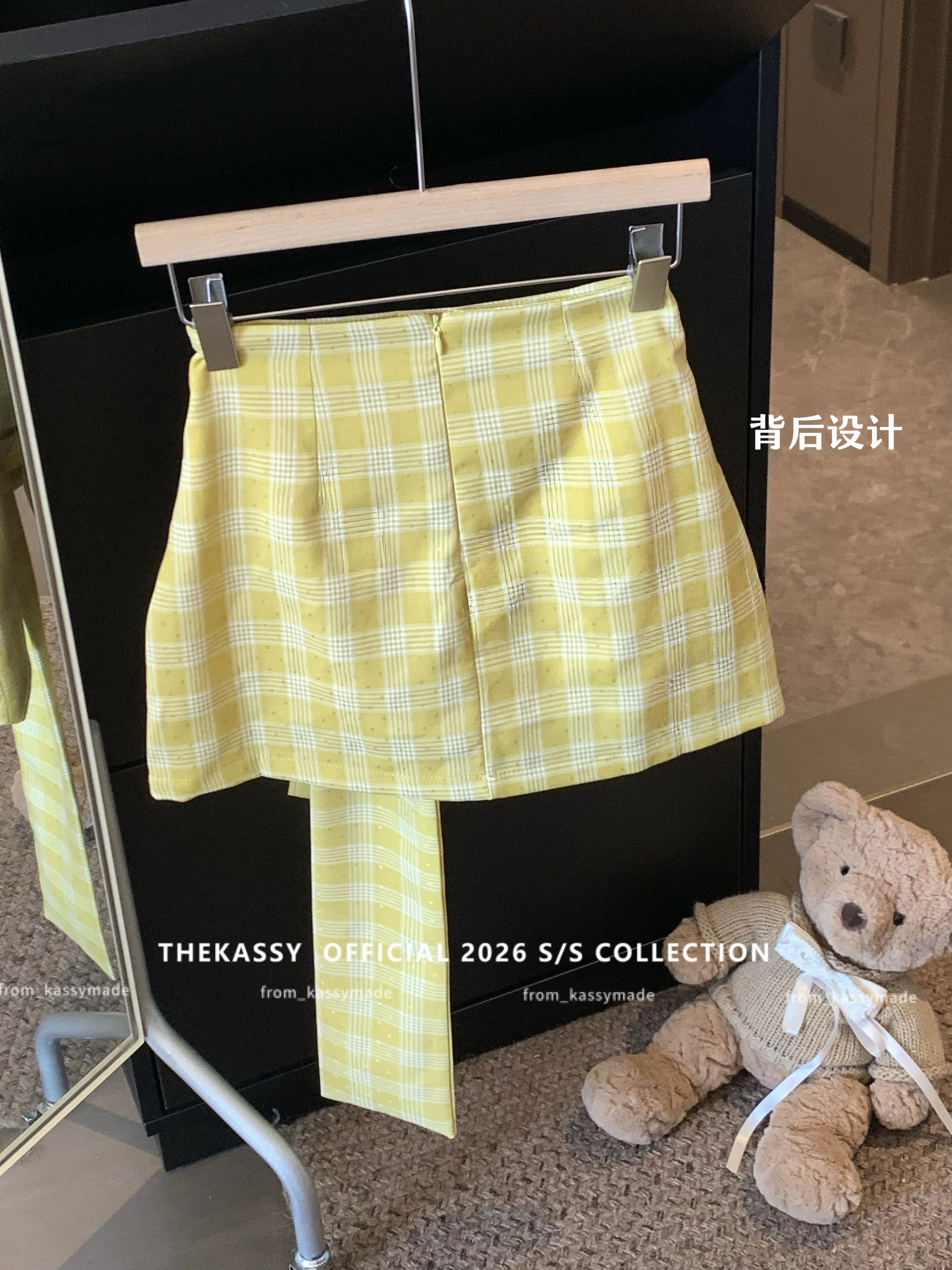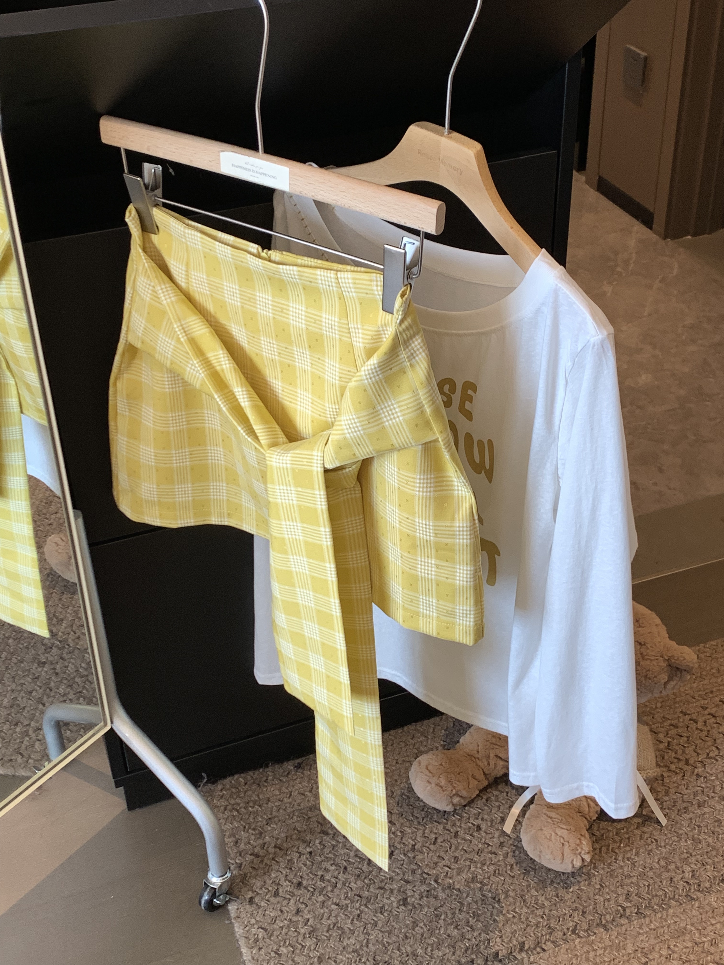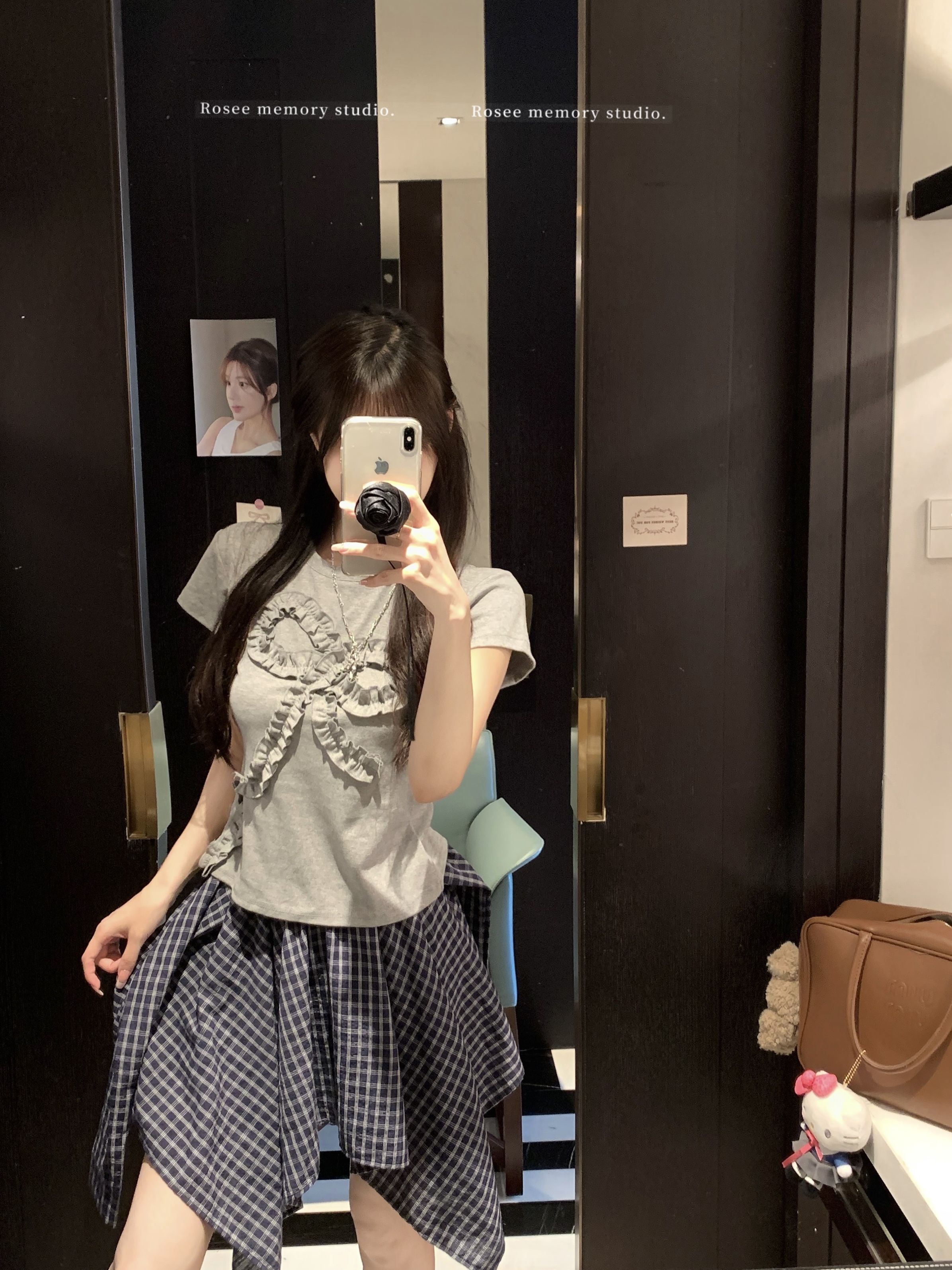 실사 한 부서 회색 프릴 나비 매듭 반팔 티셔츠 불규칙 체크무늬 반 스커트