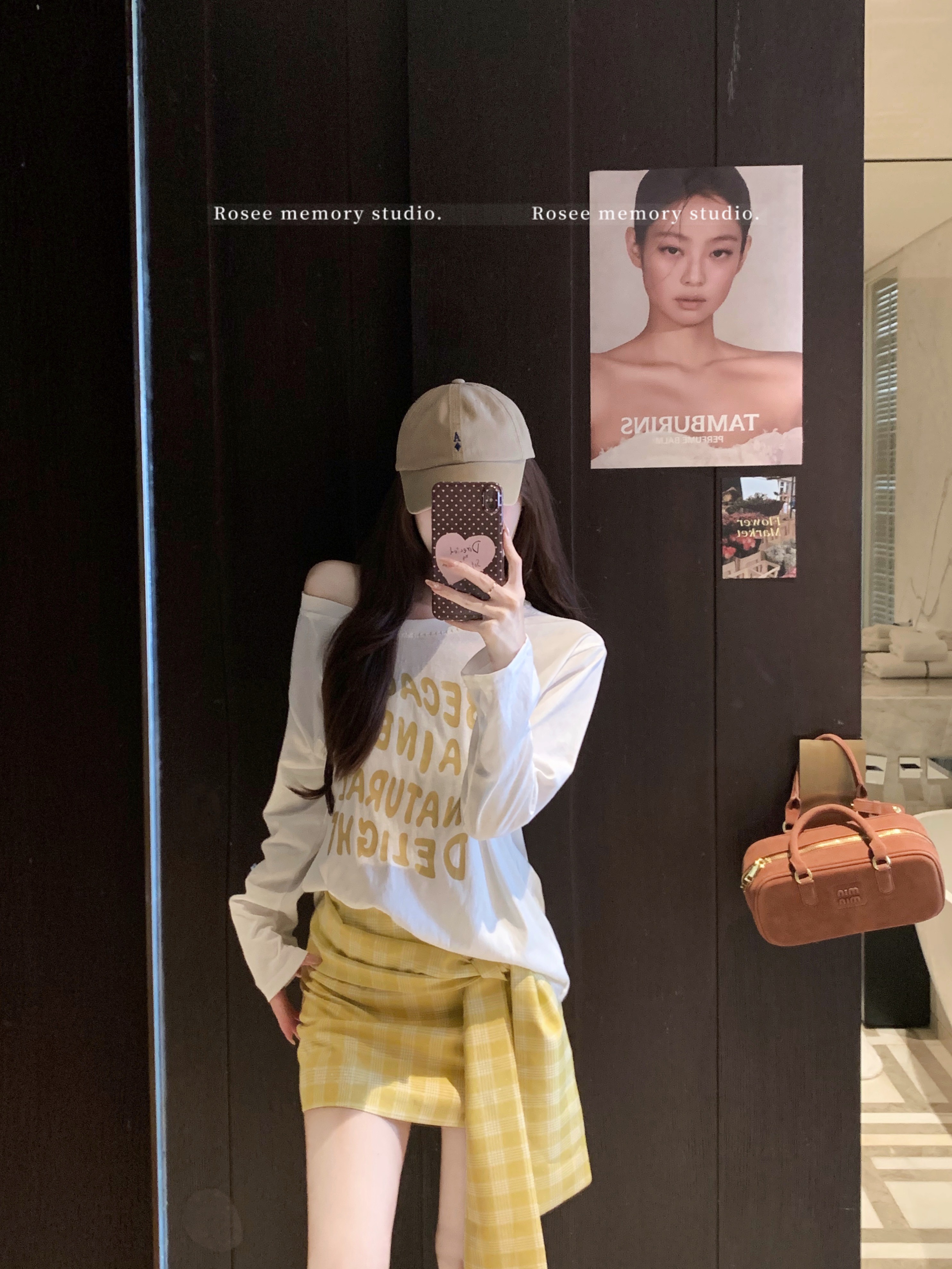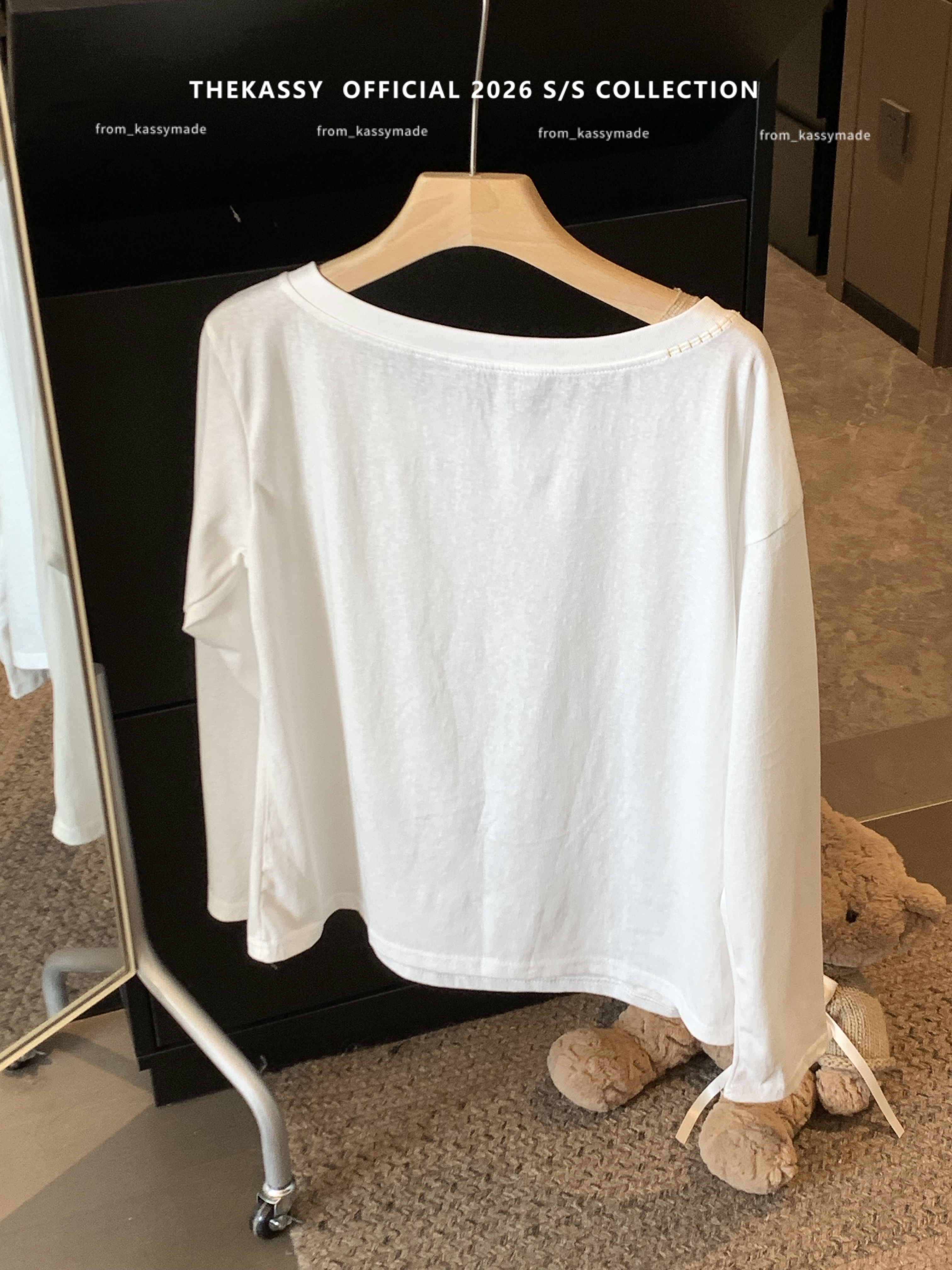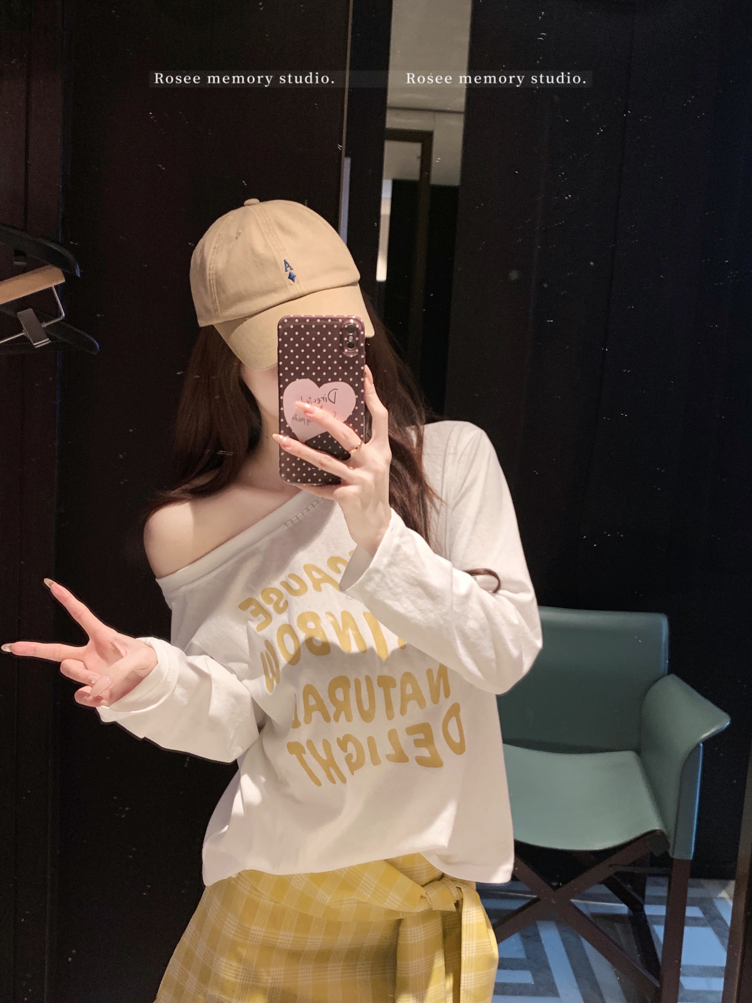 실사 스팽글 비스듬한 어깨 불규칙 트임 긴팔 티셔츠 여성 여름 새로운 스트랩 디자인 센스 품격 맨위