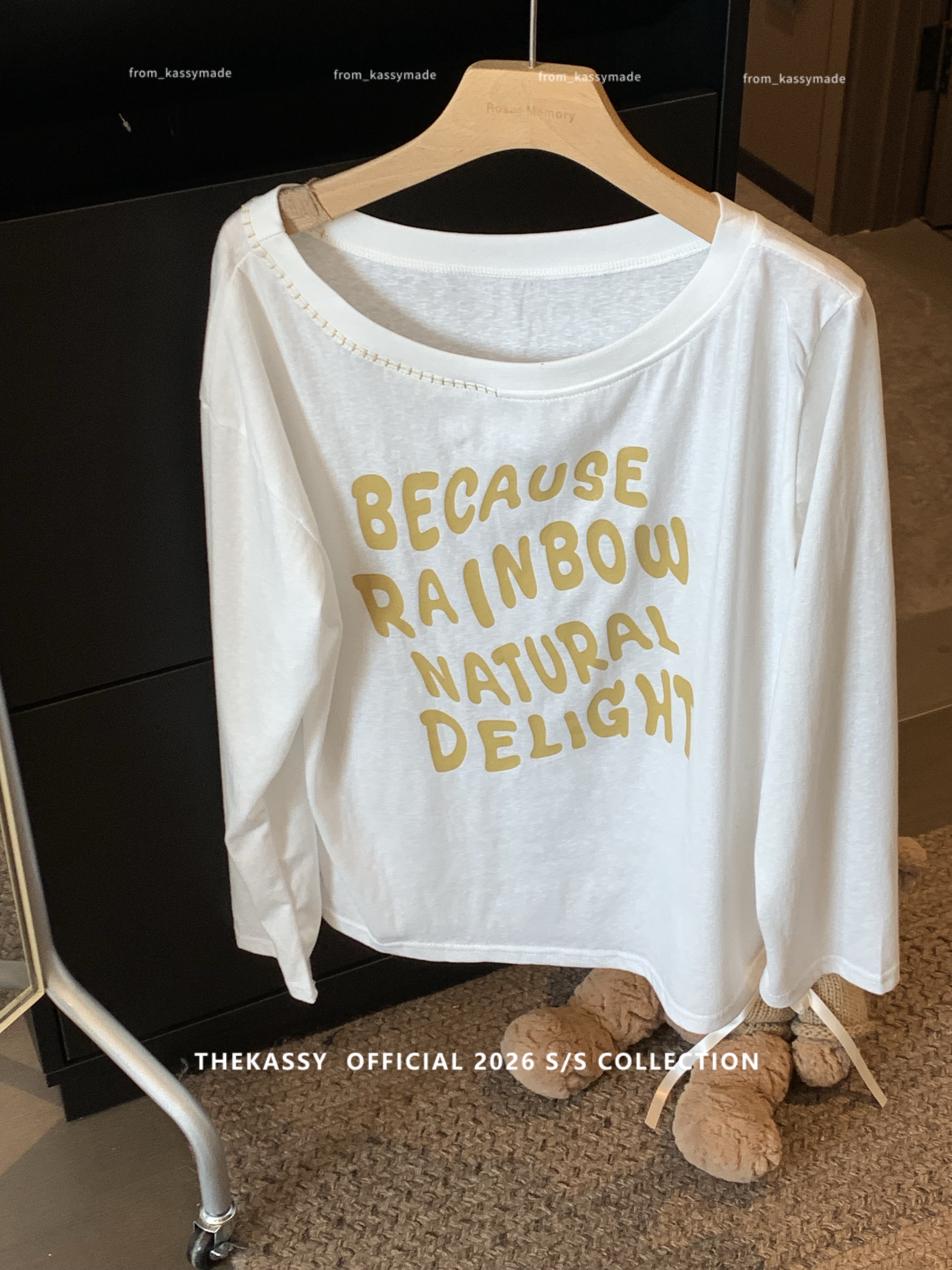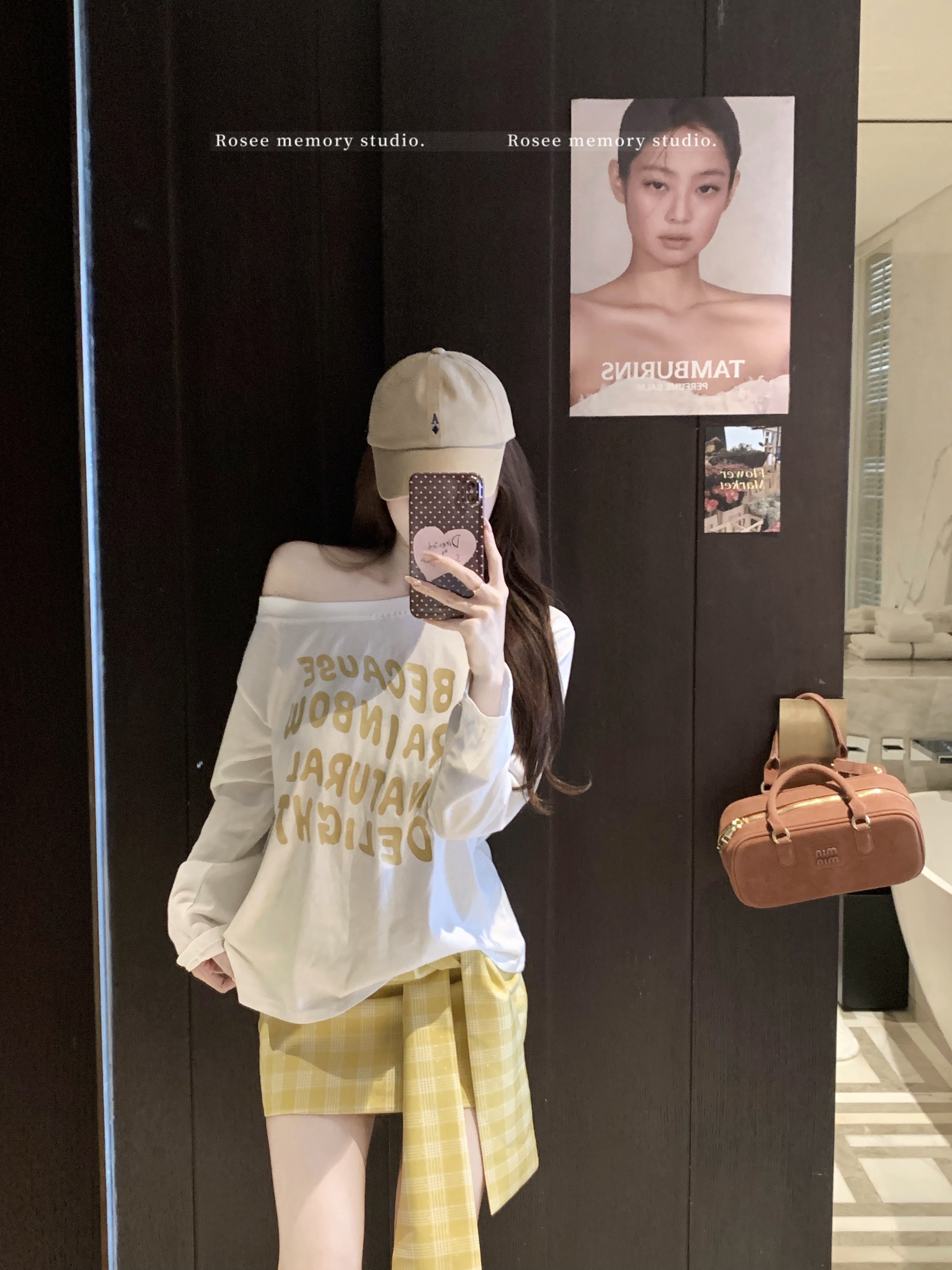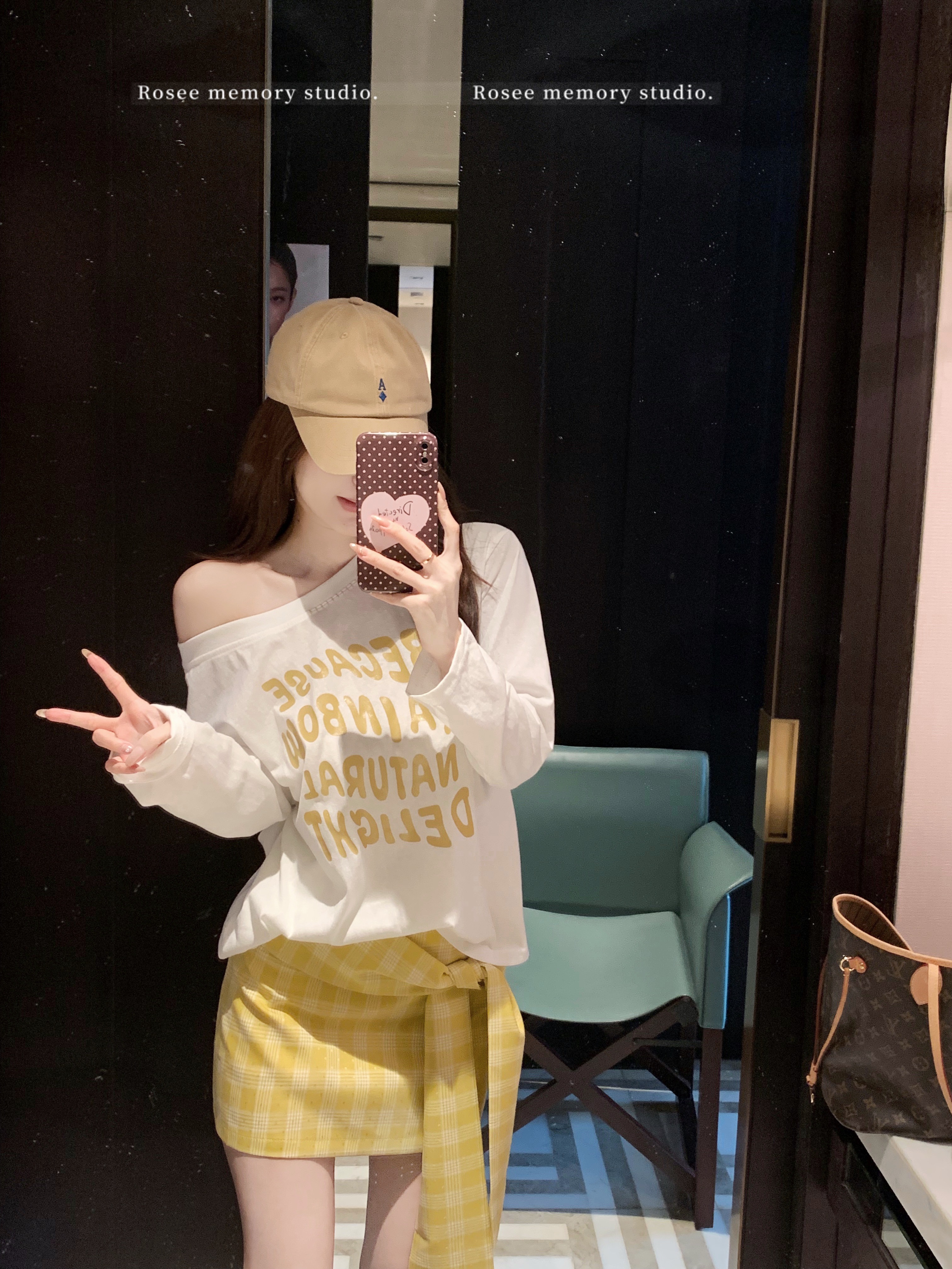 실사 스팽글 비스듬한 어깨 불규칙 트임 긴팔 티셔츠 여성 여름 새로운 스트랩 디자인 센스 품격 맨위