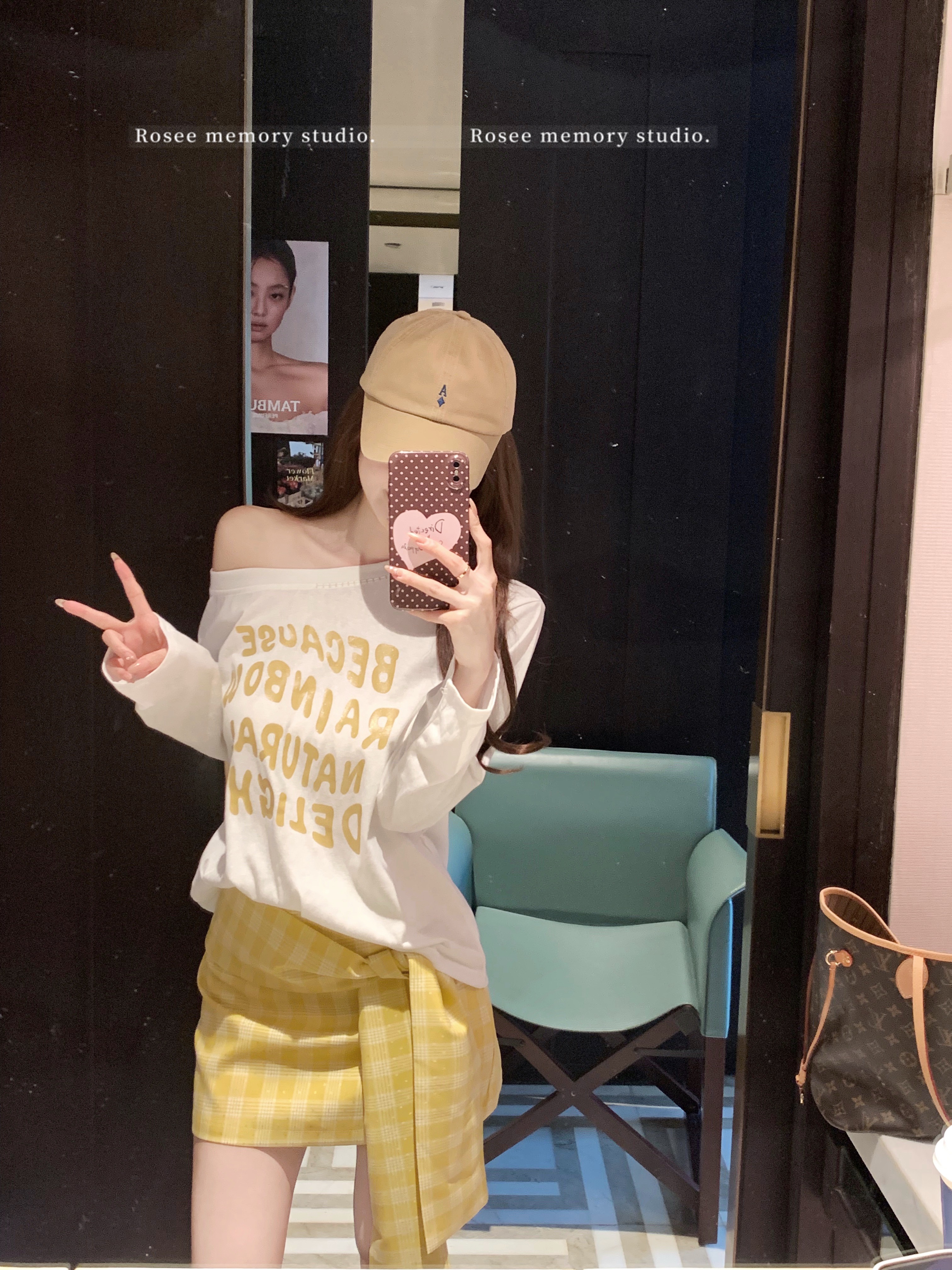 실사 여름 새로운 개성 핫걸 알파벳 핫픽스 스트랩 비스듬한 어깨 디자인 반팔 티셔츠 여성