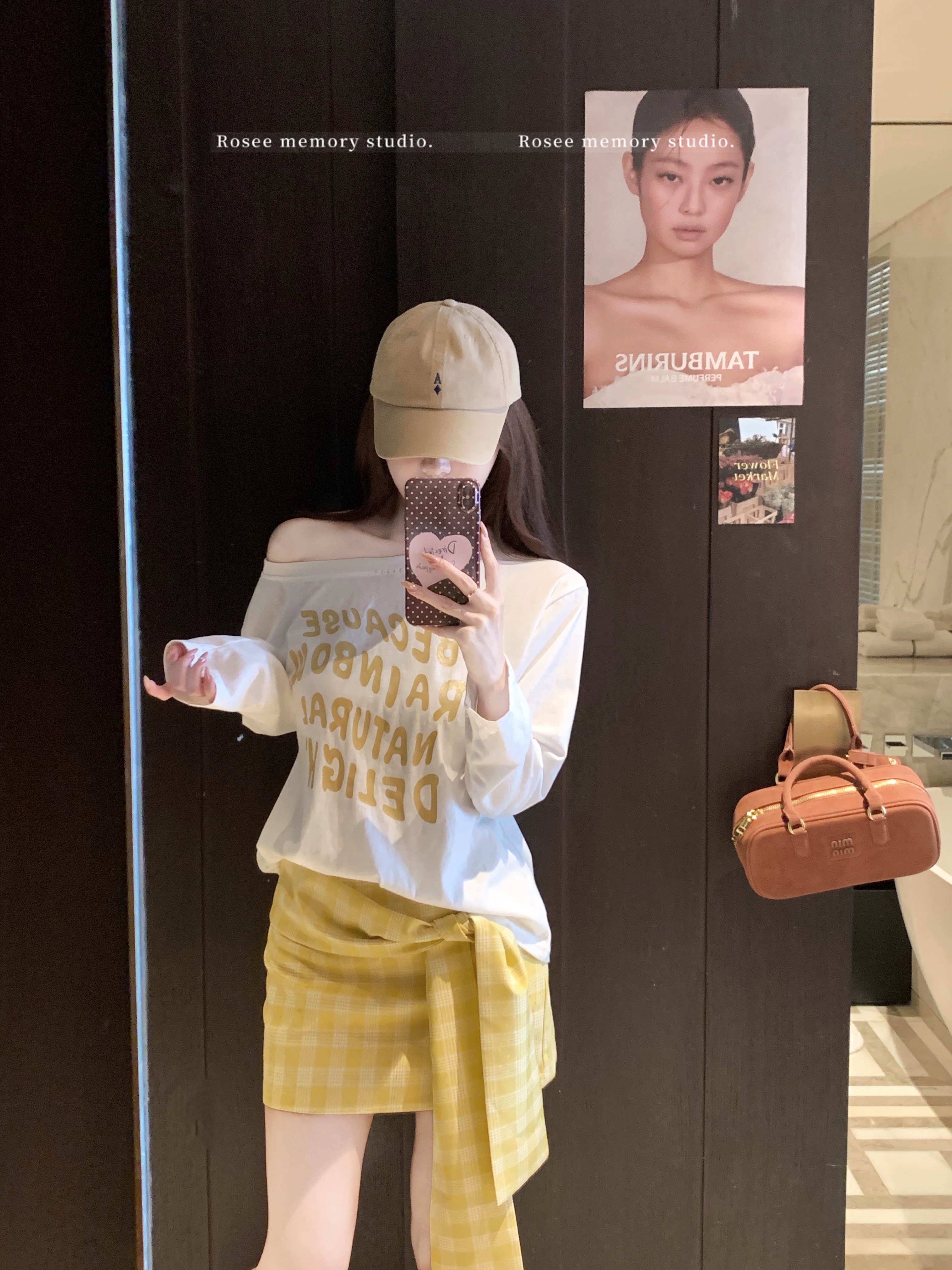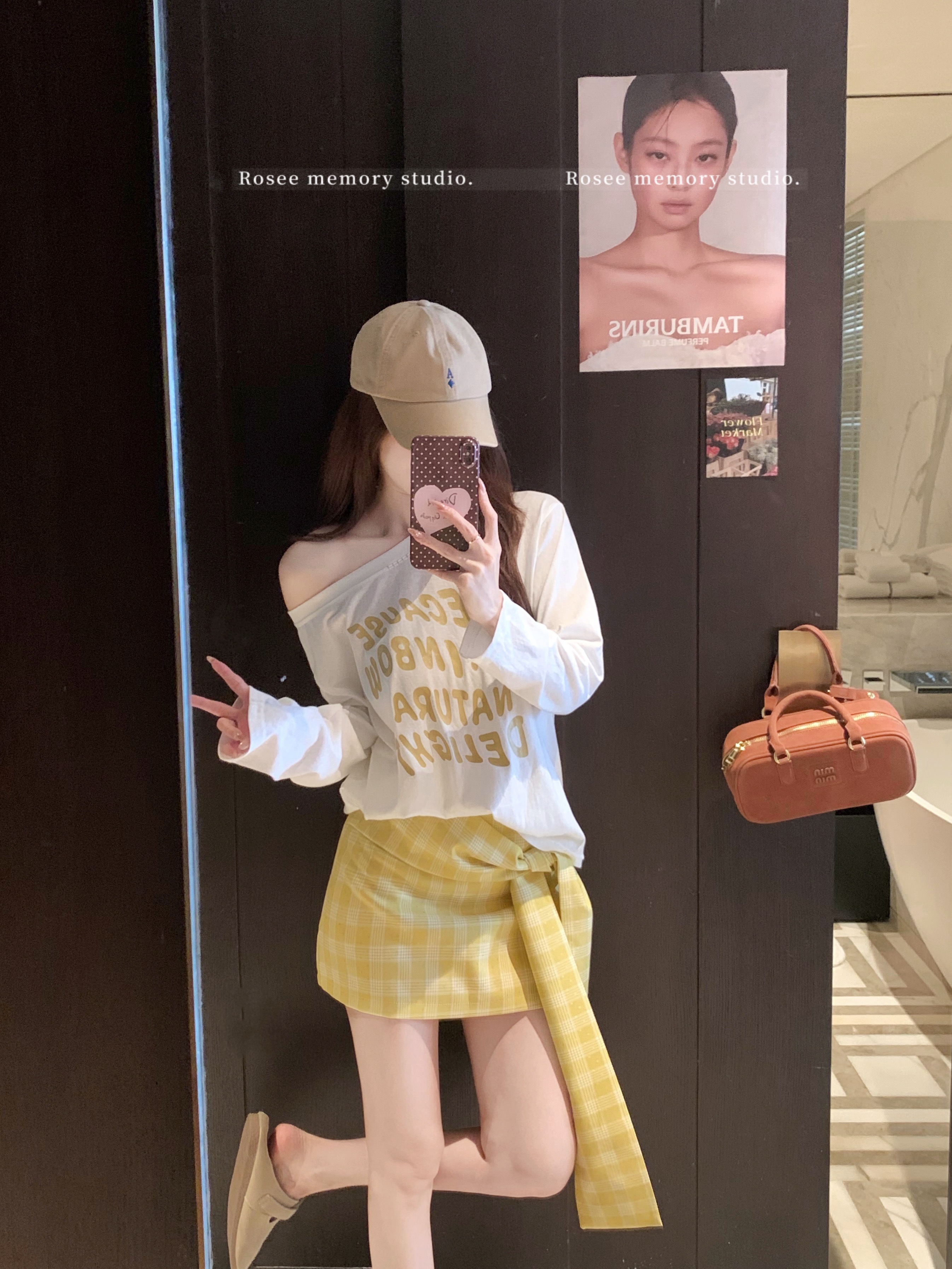 실사 레이스 체크무늬 반팔 여성 셔츠 여름 패치워크 하이웨이스트 루즈핏 한 마디 중간 길이 치마 세트